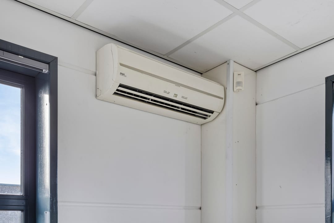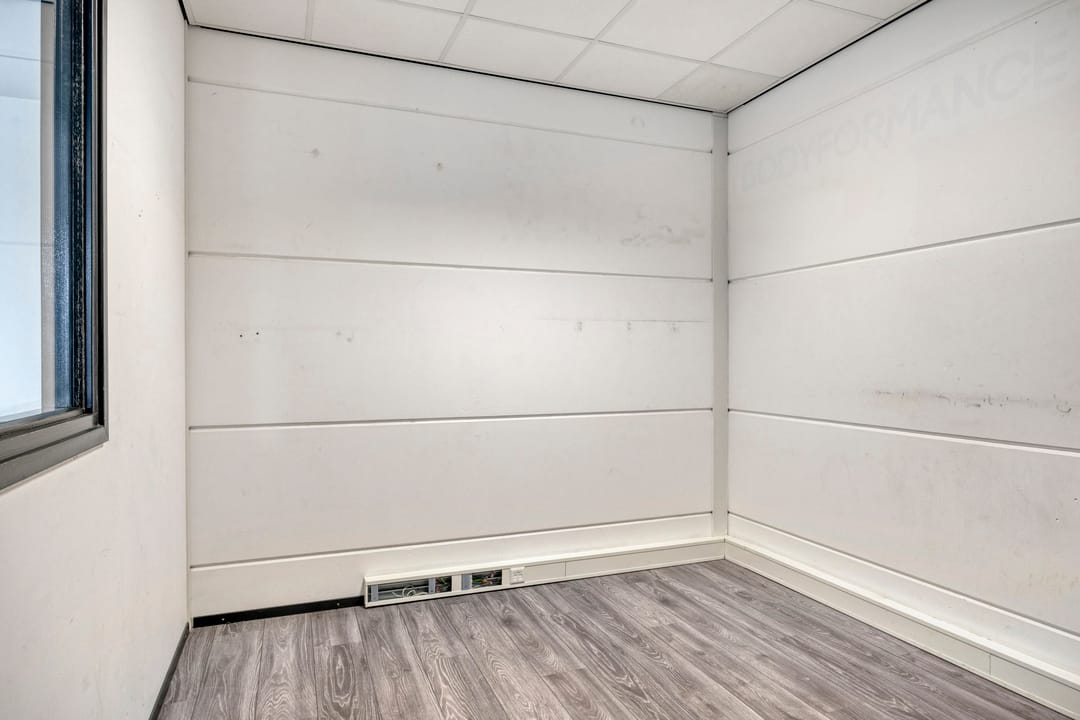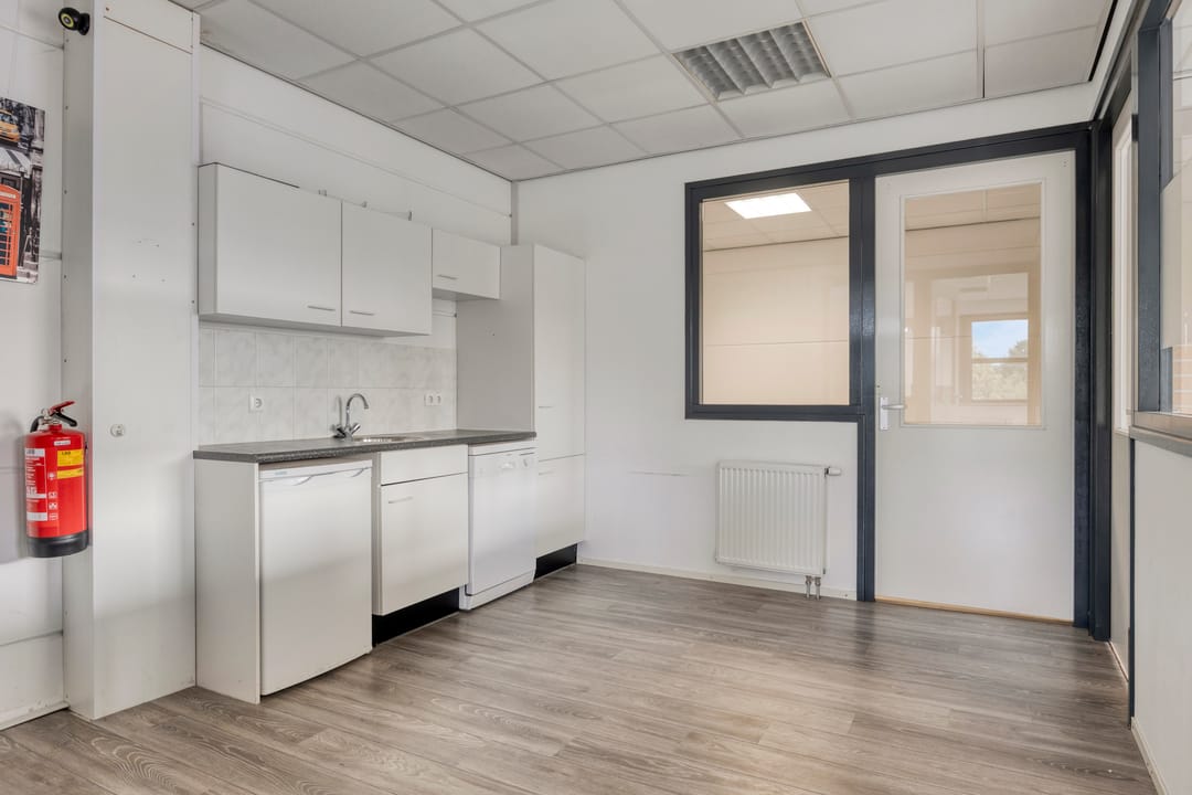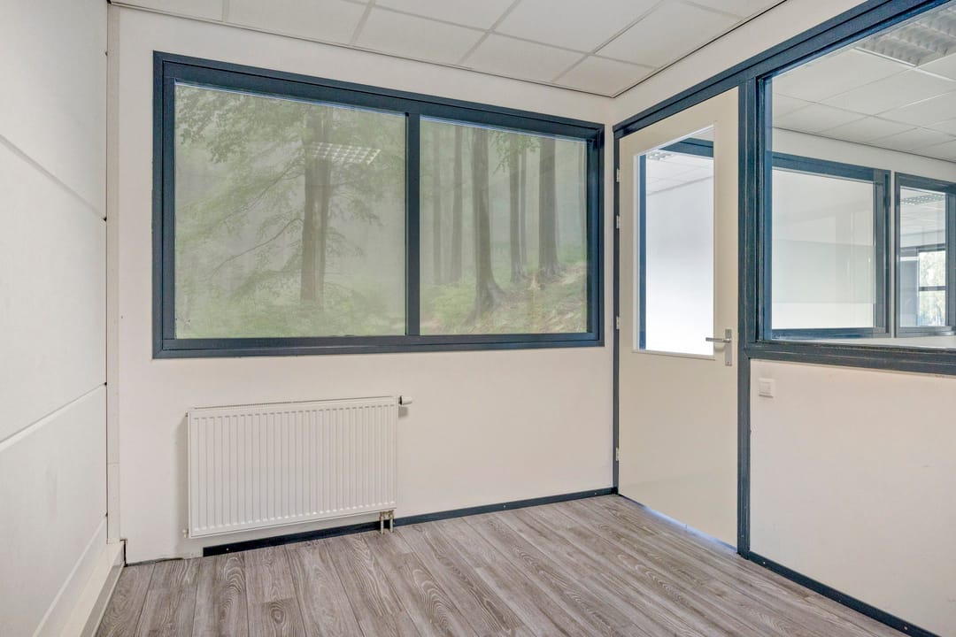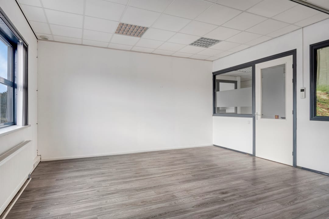 Two office spaces, meeting room, and kitchen (clear height 2.7 m). At the front, an office space of over 40 m² with suspended ceiling, laminate flooring, air conditioning, and unobstructed views of the surroundings.