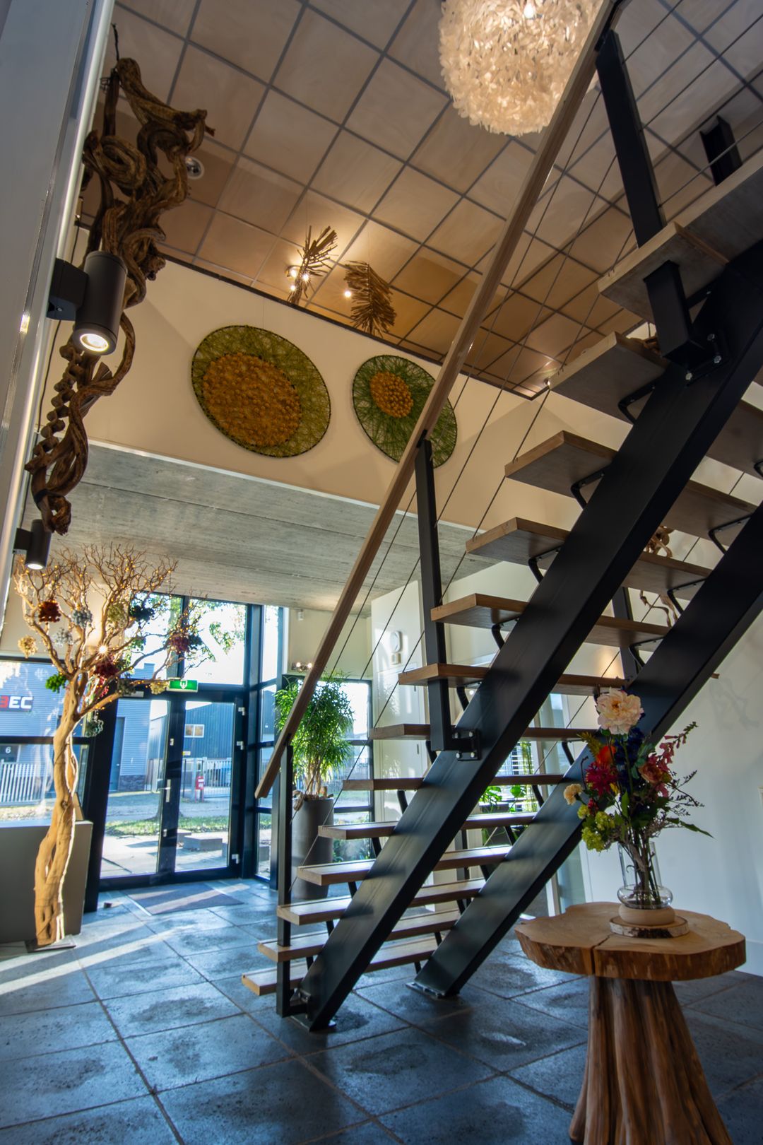 De complete eerste verdieping van het kantoorgedeelte is ingericht als showroom. De royale ruimte is ook in te zetten als kantoorruimte indien gewenst. Dat kan door de voorzetwanden die gemonteerd zijn om de showroom te creëren, weer te verwijderen.