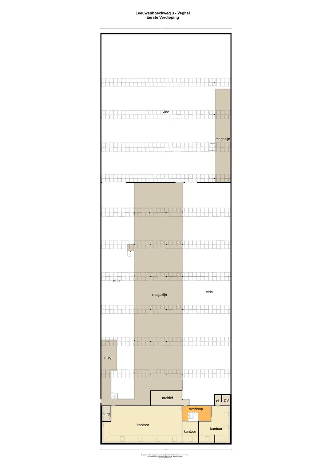 De bedrijfsruimte heeft een oppervlakte van circa 3.825 m² waarvan circa 2.980 m² gelegen op de begane grond en circa 845 m² op de eerste verdieping.