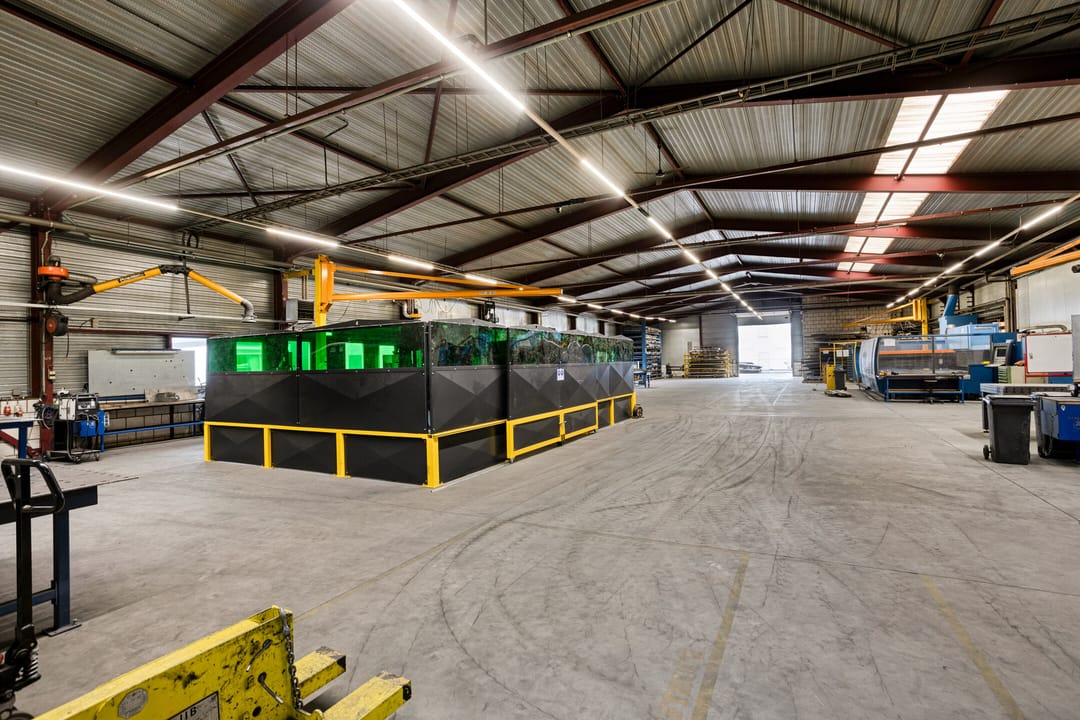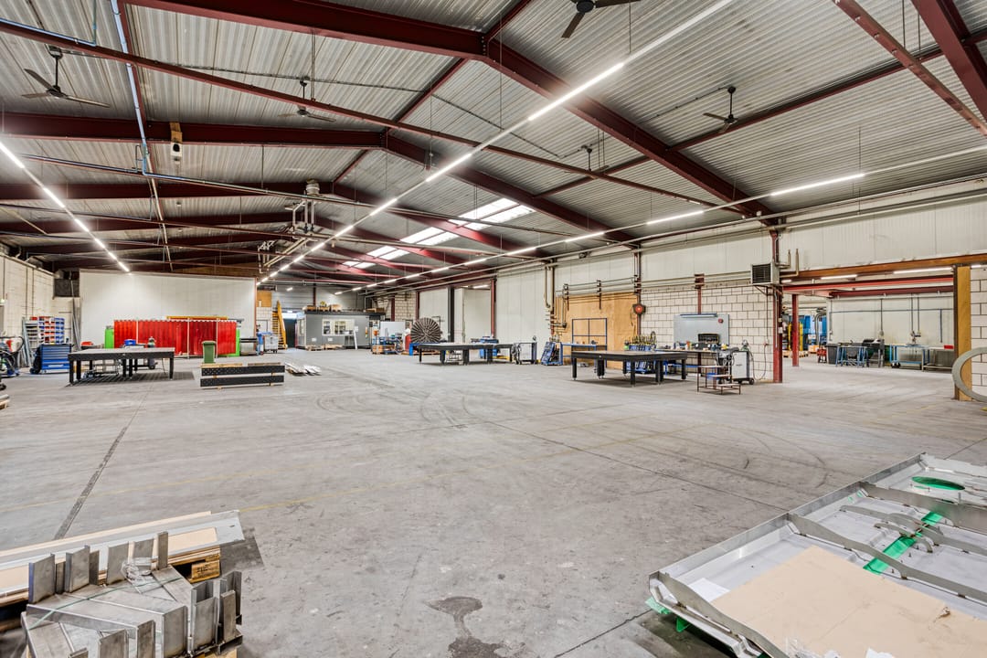 Een bedrijfsgebouw zonder verdieping, opgetrokken van staalconstructie, deels met vullingen van metselwerk, deels met wanden van dubbelwandige geïsoleerde metalen wandbeplating, aan de binnenzijde voorzien van perforatie, stalen kapconstructie gedekt met geperforeerde metalen dakplaten, waarover isolatie en metalen profielplaten, ingebouwde lichtstraten van kunststof platen.