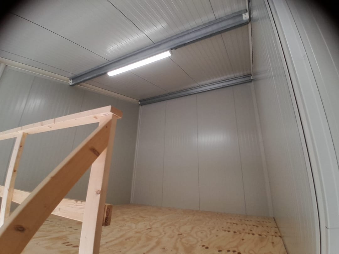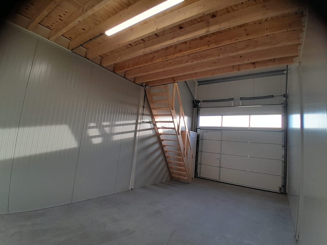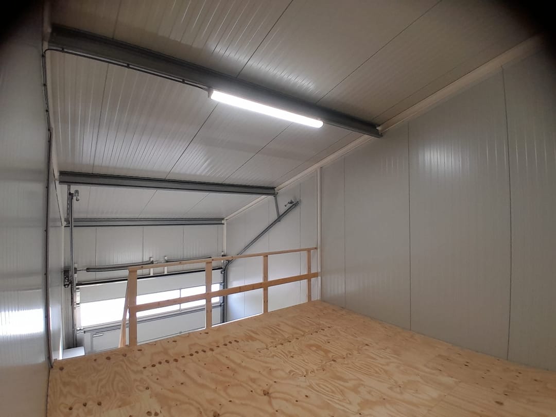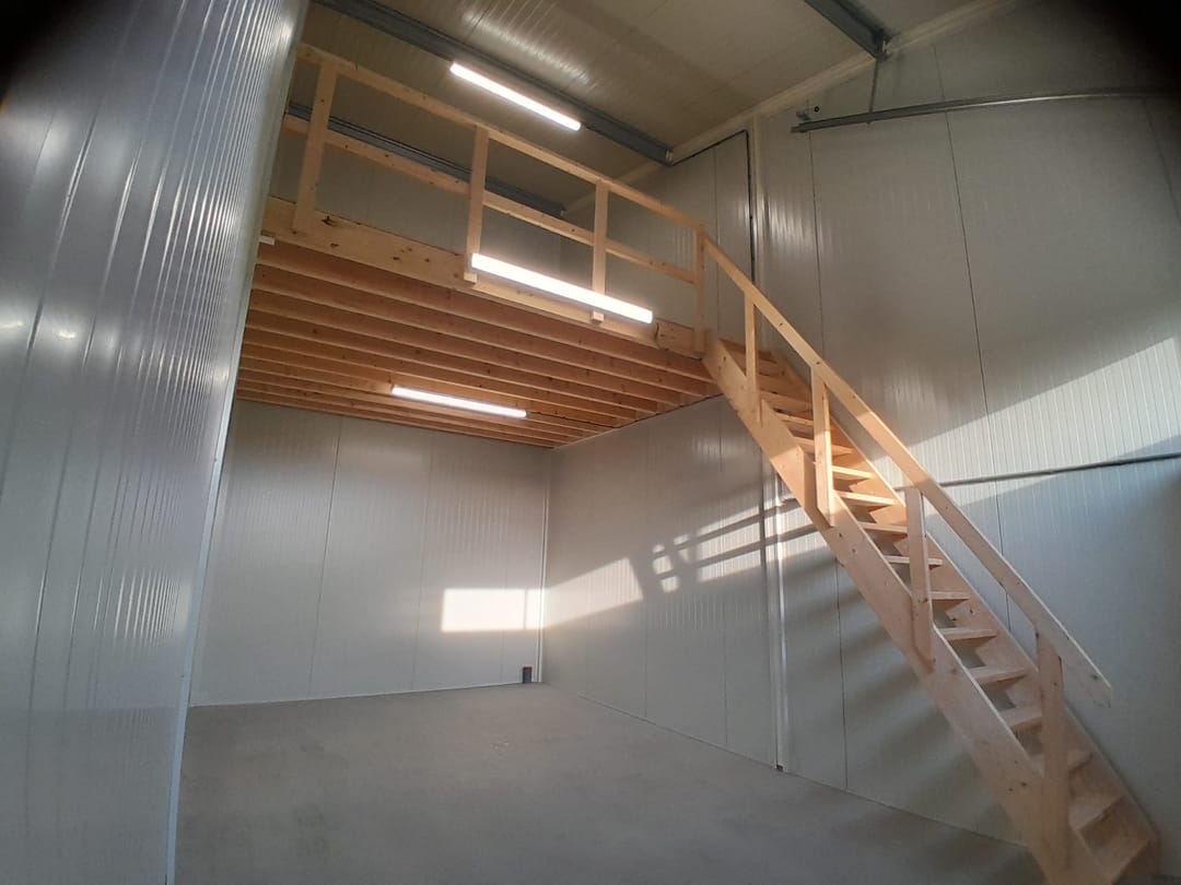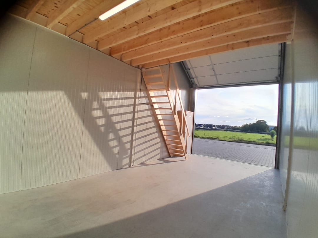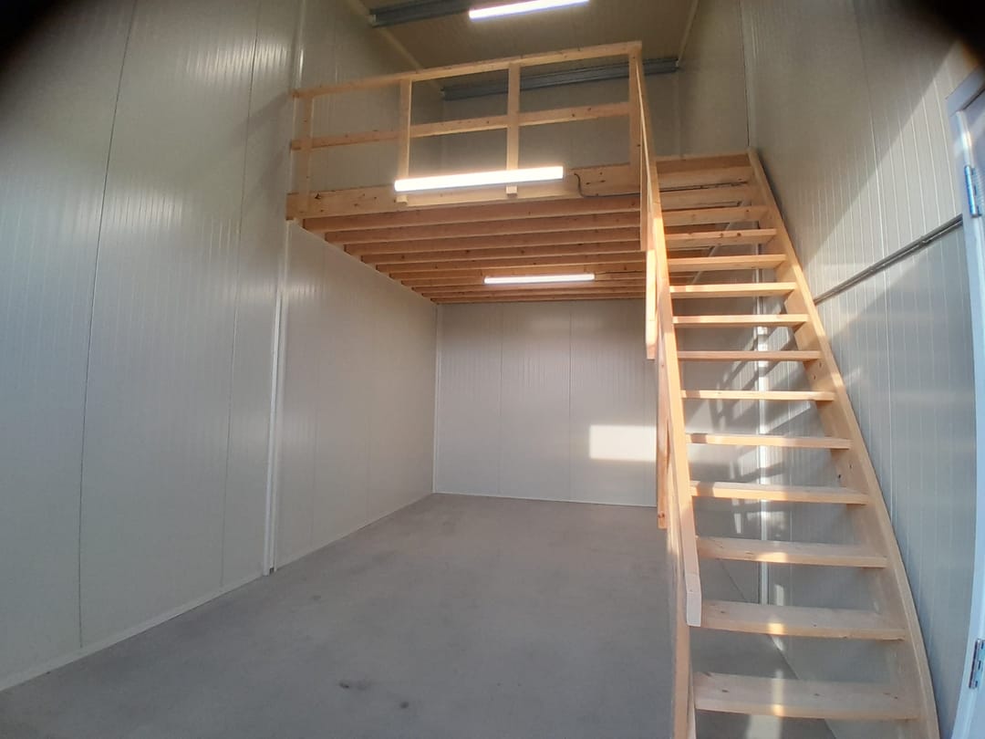 - Voorzien van houten verdiepingsvloer (ca. 17m2, 250 kg/m2) met vaste trap
