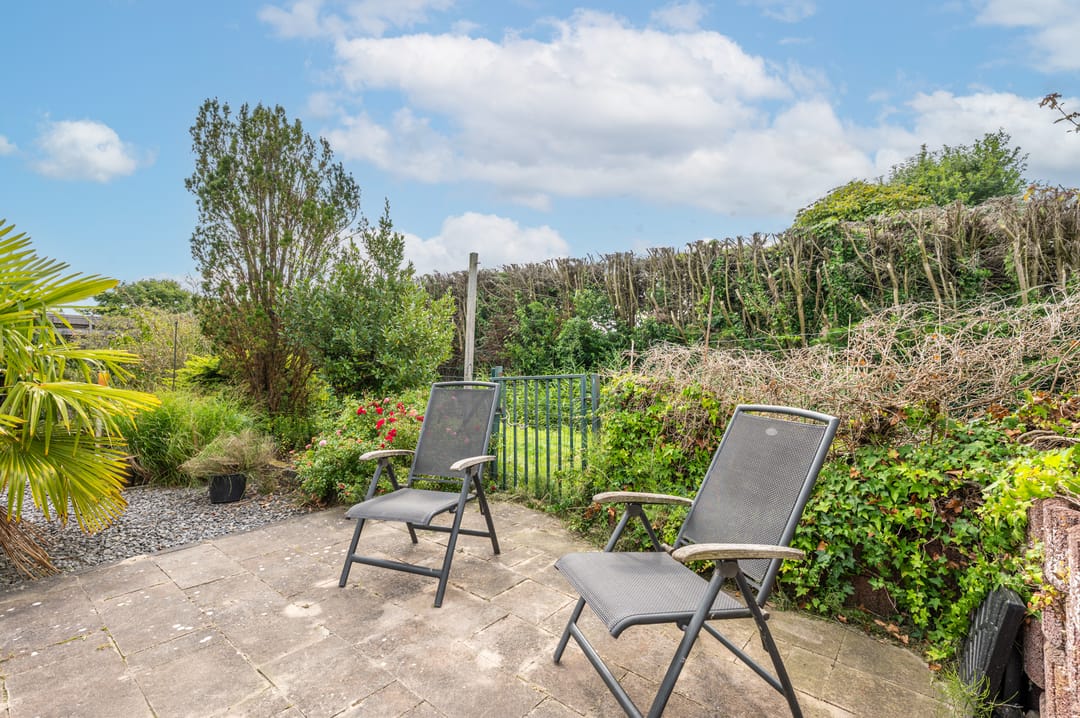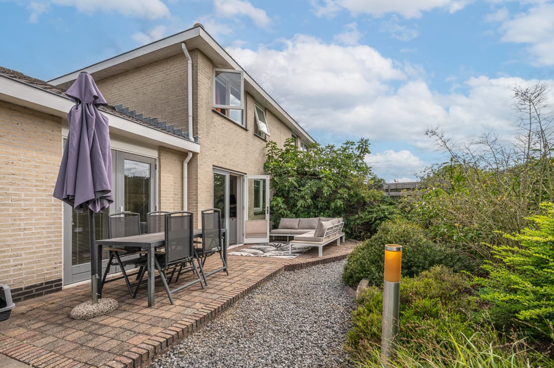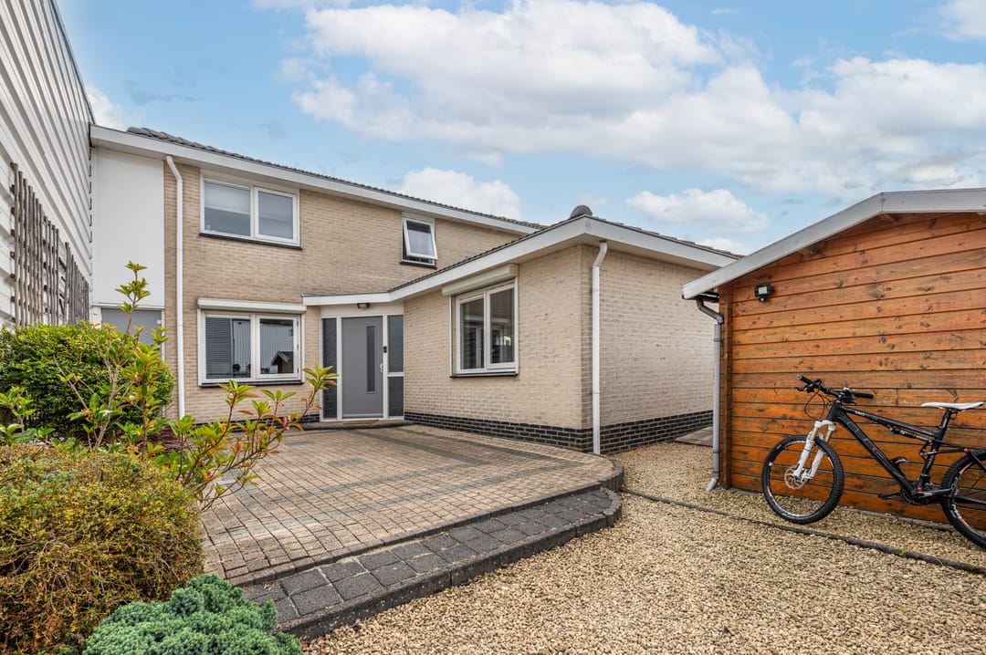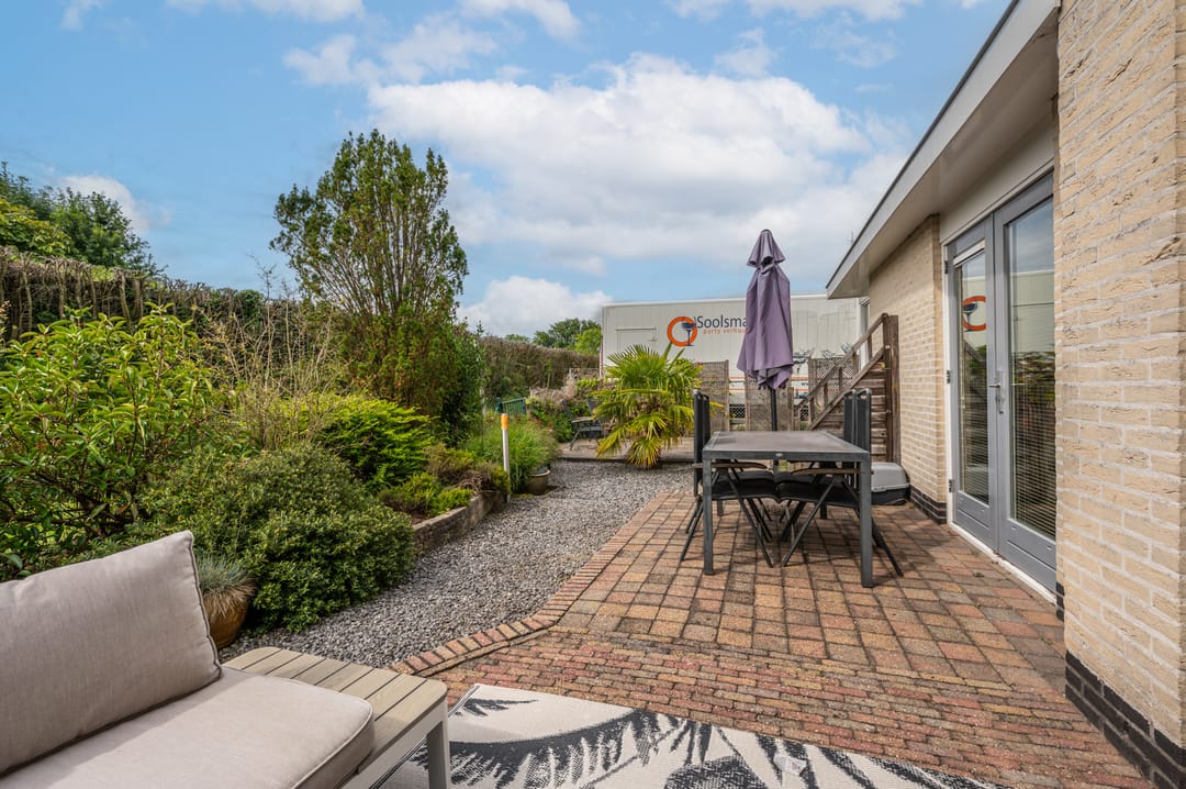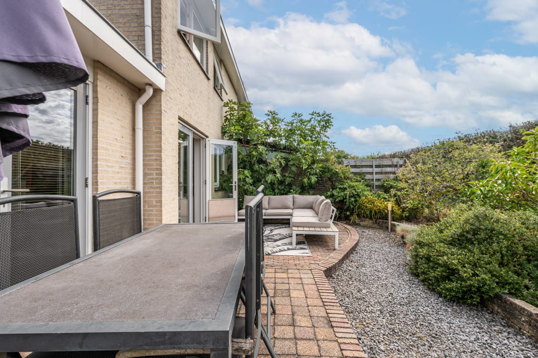De achtertuin, welke grenst aan de keuken, is grotendeels verhard met klinkers en split en biedt een doorgang naar de straatzijde aan de voorzijde van het perceel.