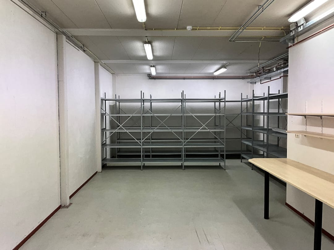 De begane grond is een volledig ingerichte bedrijfsruimte met stellingen, verlichting en een uitstortgootsteen.