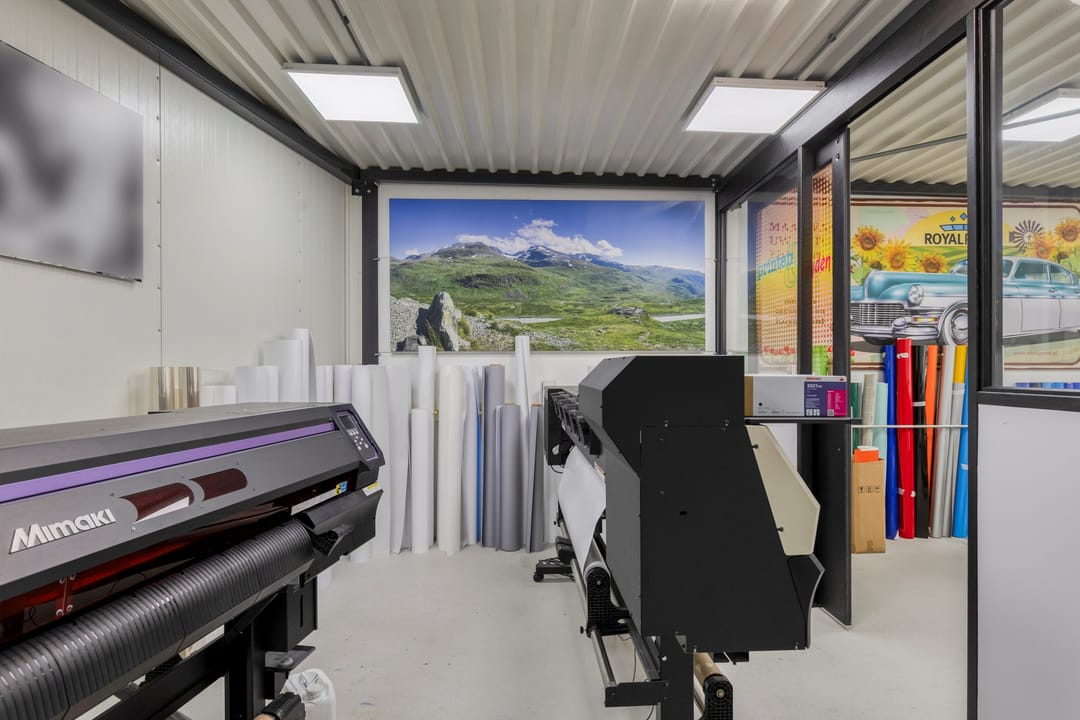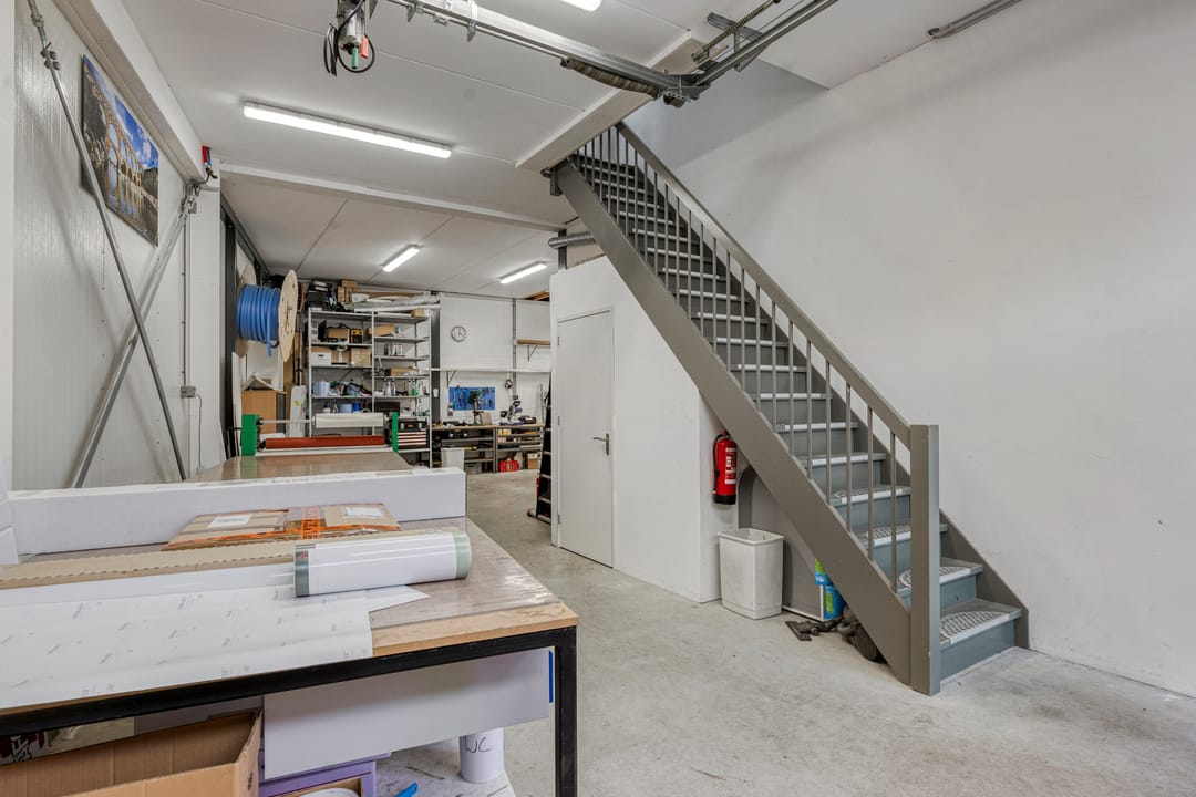 via de vaste trap naar de 1e verdieping, thans in gebruik als kantoor en werk voorbereiding, deze verdieping is 67 m2 en voorzien van raampartijen, keukenblokje en glazen wanden voor de indeling