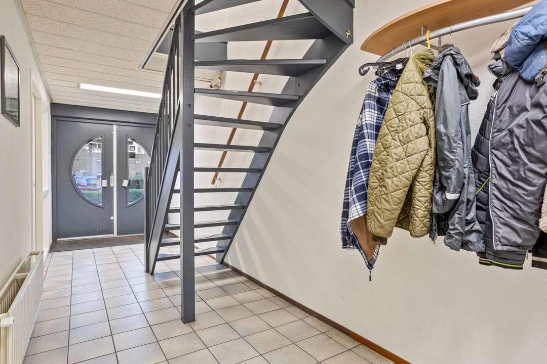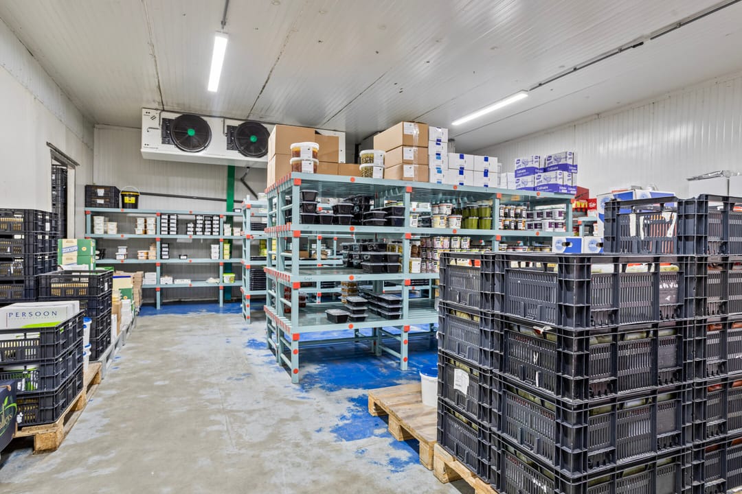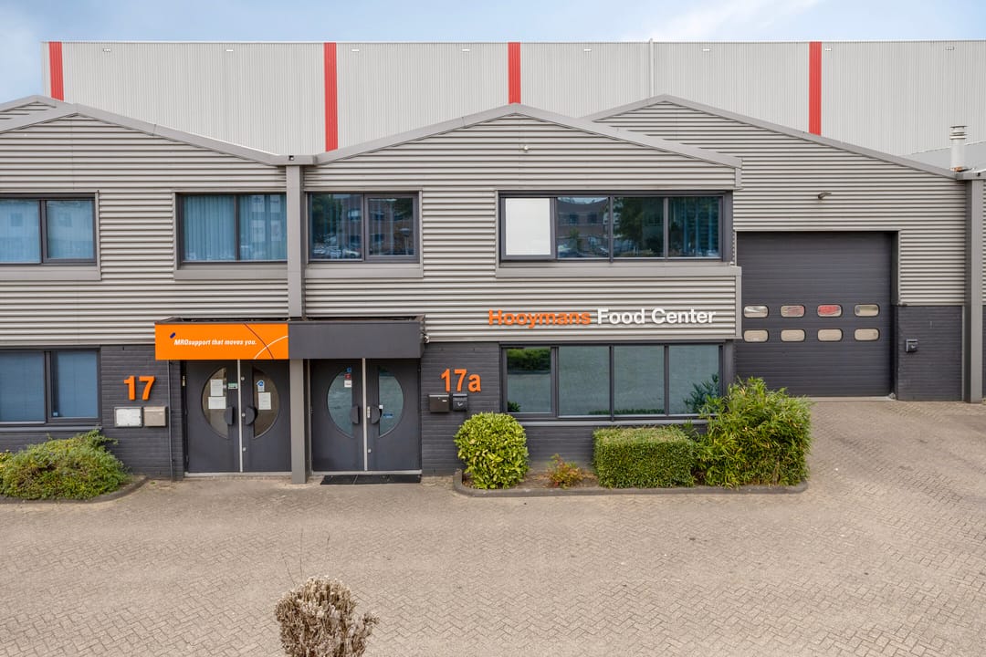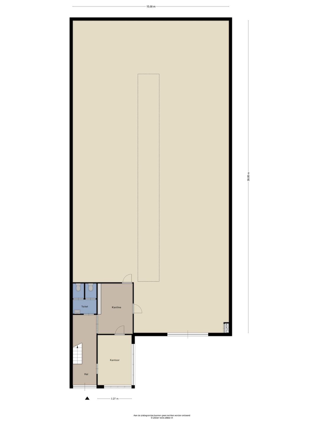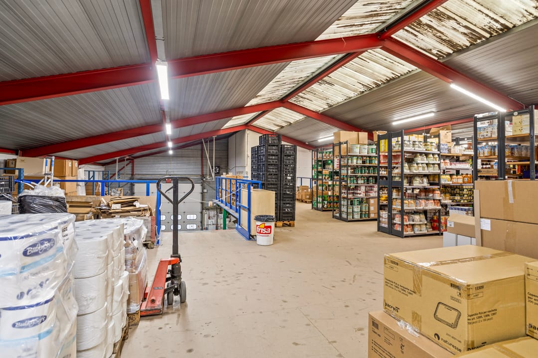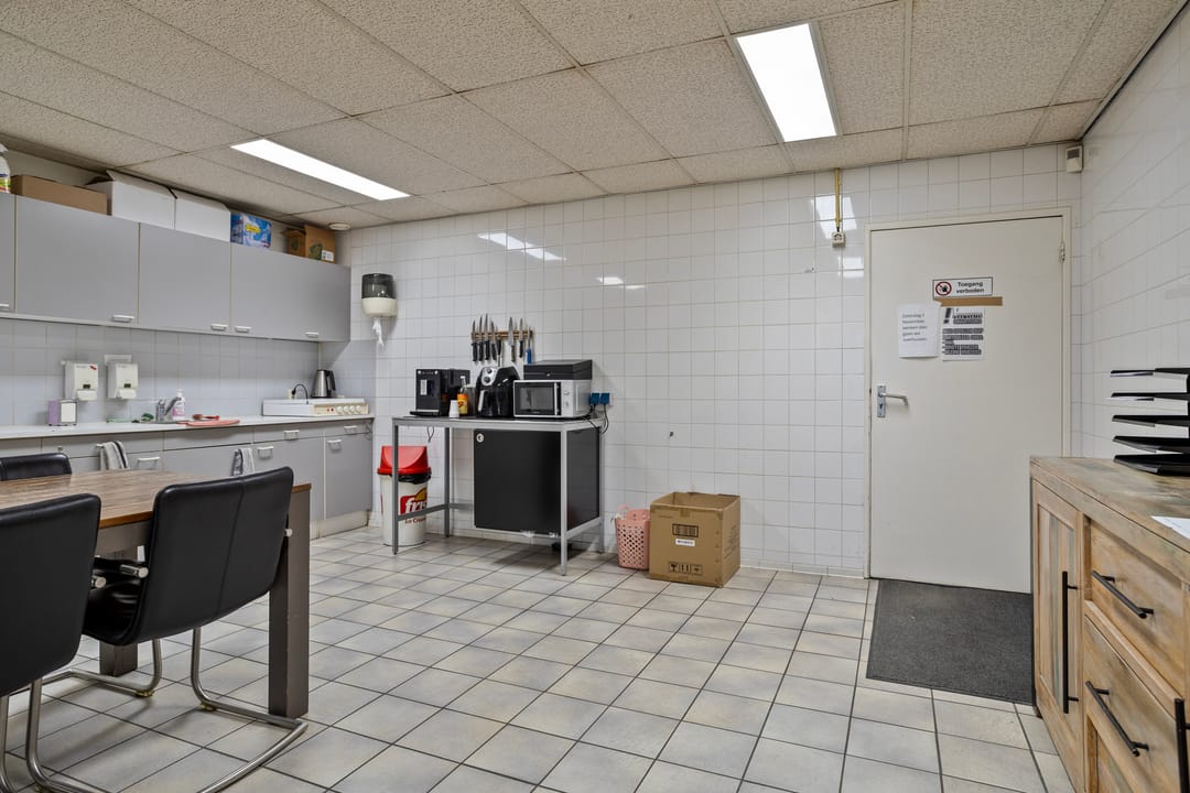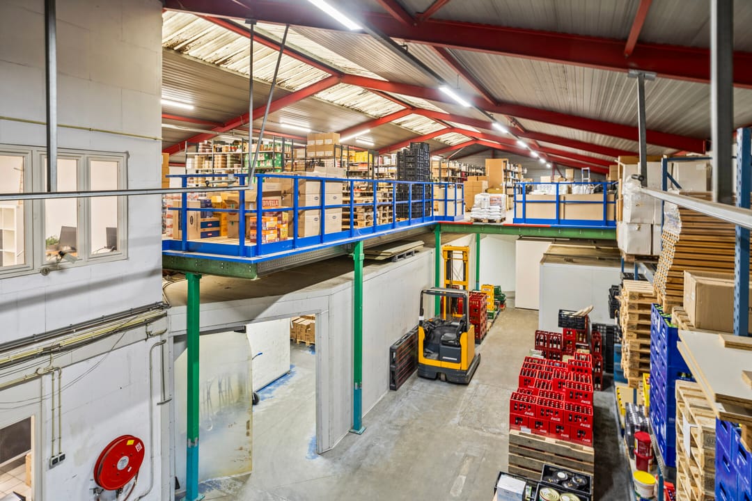 Begane grond: entree, gang met de trapopgang, portaal naar dubbel toilet, kantoorruimte en kantine, toegang naar open bedrijfshal met een entresolvloer.