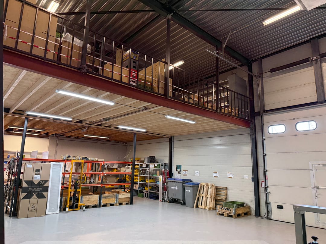 Trapopgang die toegang biedt naar twee behoorlijke kantoorruimtes en de entresolvloer.
