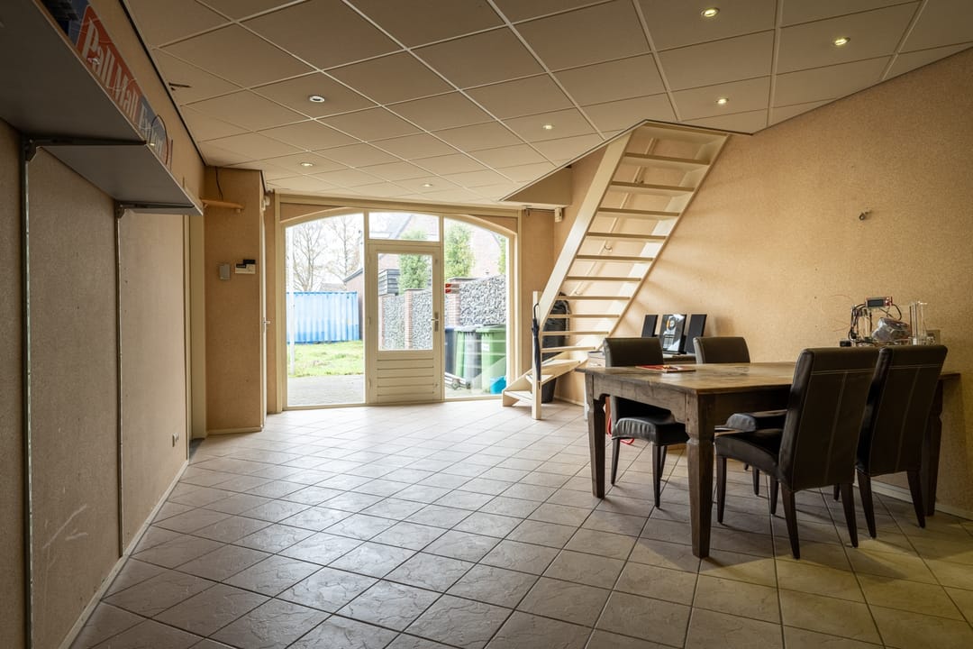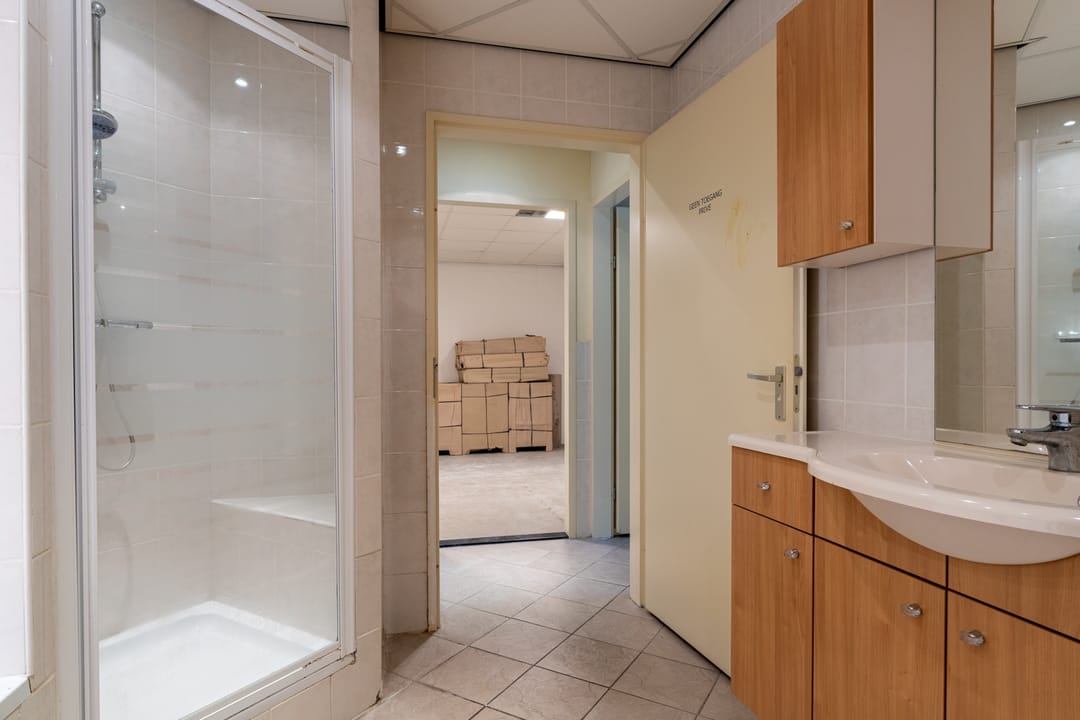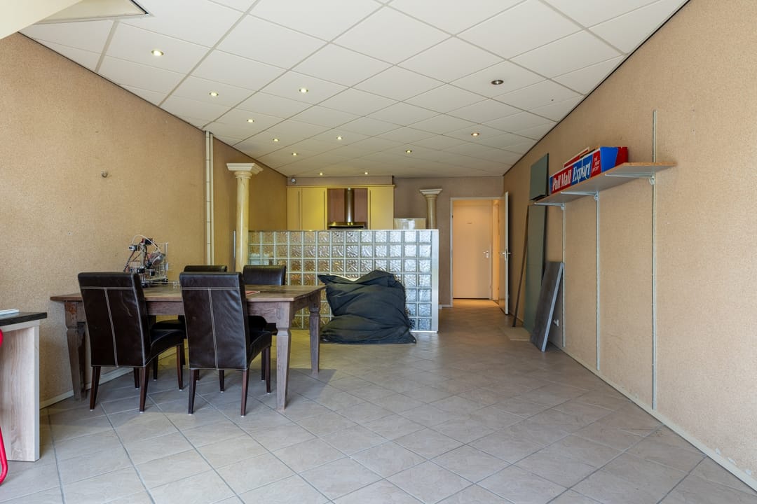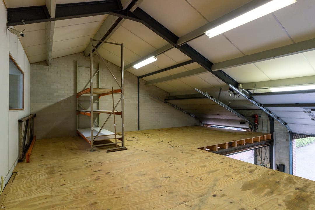 Rechts bevindt zich de werkplaats met 2 roldeuren waarvan één elektrisch en één met extra loopdeur. De hal beschikt tevens over een trapopgang naar de bovenliggende verdieping als magazijn. Ook bevindt zich hier de boiler (type:Tesy Modeco, bouwjaar 2022). Links van het pand bevindt zich de entree naar de kantoorruimte, deze grote ontvangstruimte/kantoor is voorzien van een meterkast (8 groepen, 3 aardlekschakelaars en krachtstroom), trapopgang naar boven en keuken met hoekopstelling v.v. gaskookplaat, afzuigkap, magnetron en koel-vriescombinatie. Aan de achterzijde bevindt zich een ruime spreekkamer/werkkamer, separaat toilet en nette badkamer met ligbad, douche, wastafelmeubel en wasmachine-aansluiting.