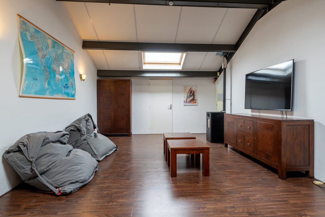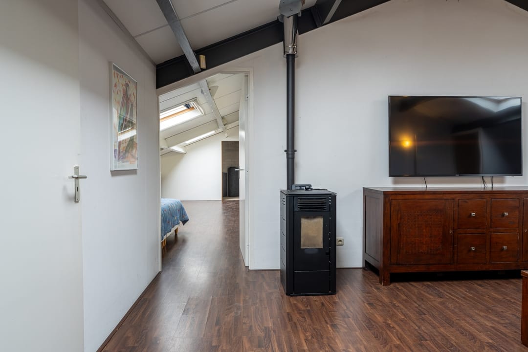 Via de vaste trapopgang is de verdieping bereikbaar. Door de toegangsdeur komt men in de ‘woonkamer’ of kantine met vaste kastruimte en inloopkast met voorbereidingen voor 2e toilet. Aan de achterzijde bevindt zich een ruime slaapkamer v.v. 2 Velux-dakramen en inloopkast.