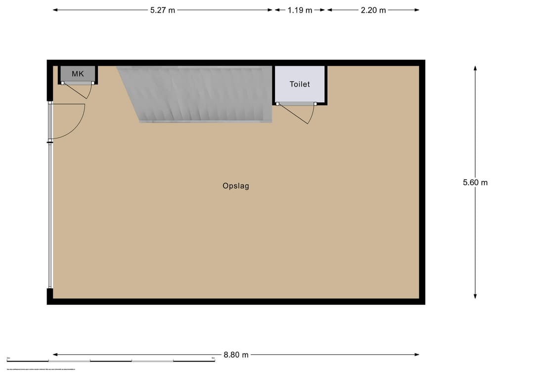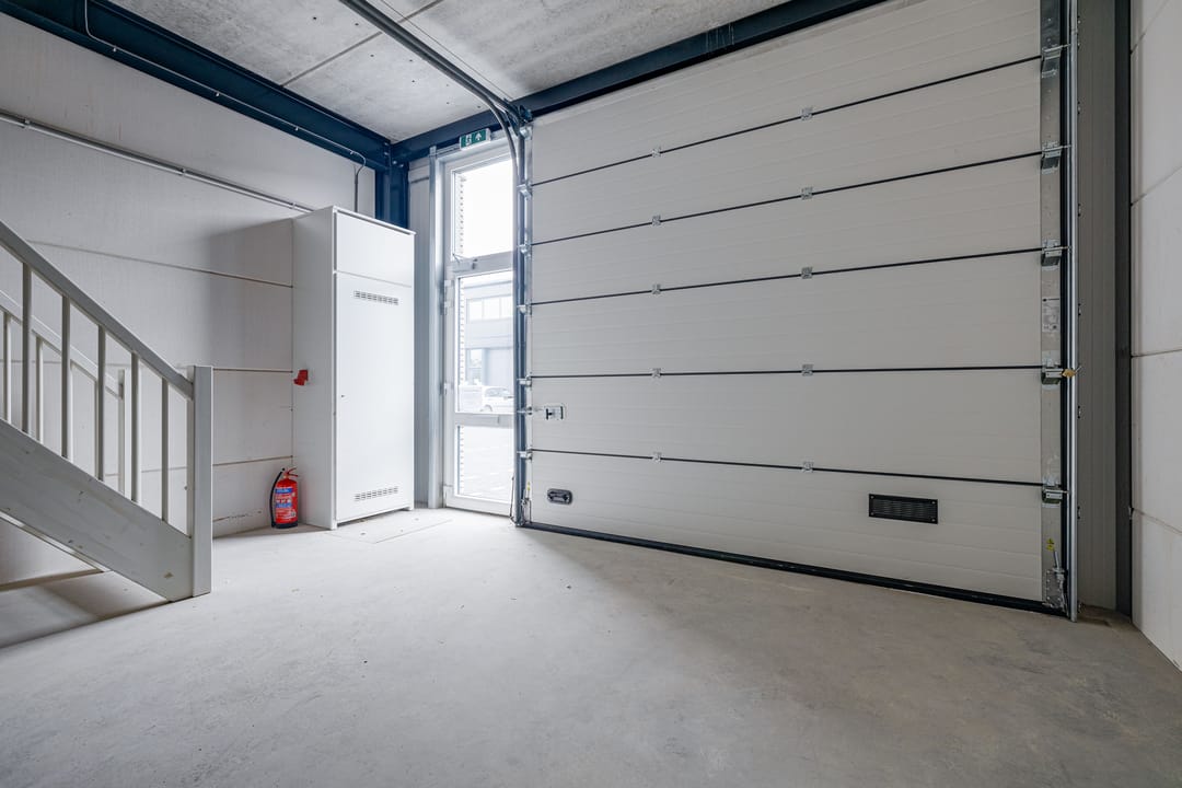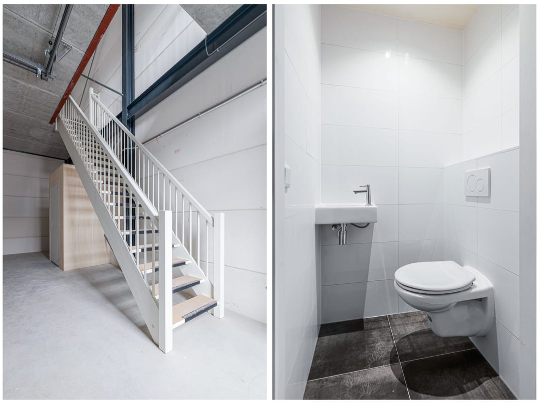 Access to the space is via the (walk-through) door or the manually operated overhead door, which is 3.30 meters wide and 3.30 meters high. The floor measures a total of approximately 49m2, has a height of 3.60 meters, and is equipped with a neat toilet. The toilet is fully tiled with white wall tiles and anthracite-colored floor tiles and is equipped with a wall-mounted toilet, washbasin, and recessed spotlights.