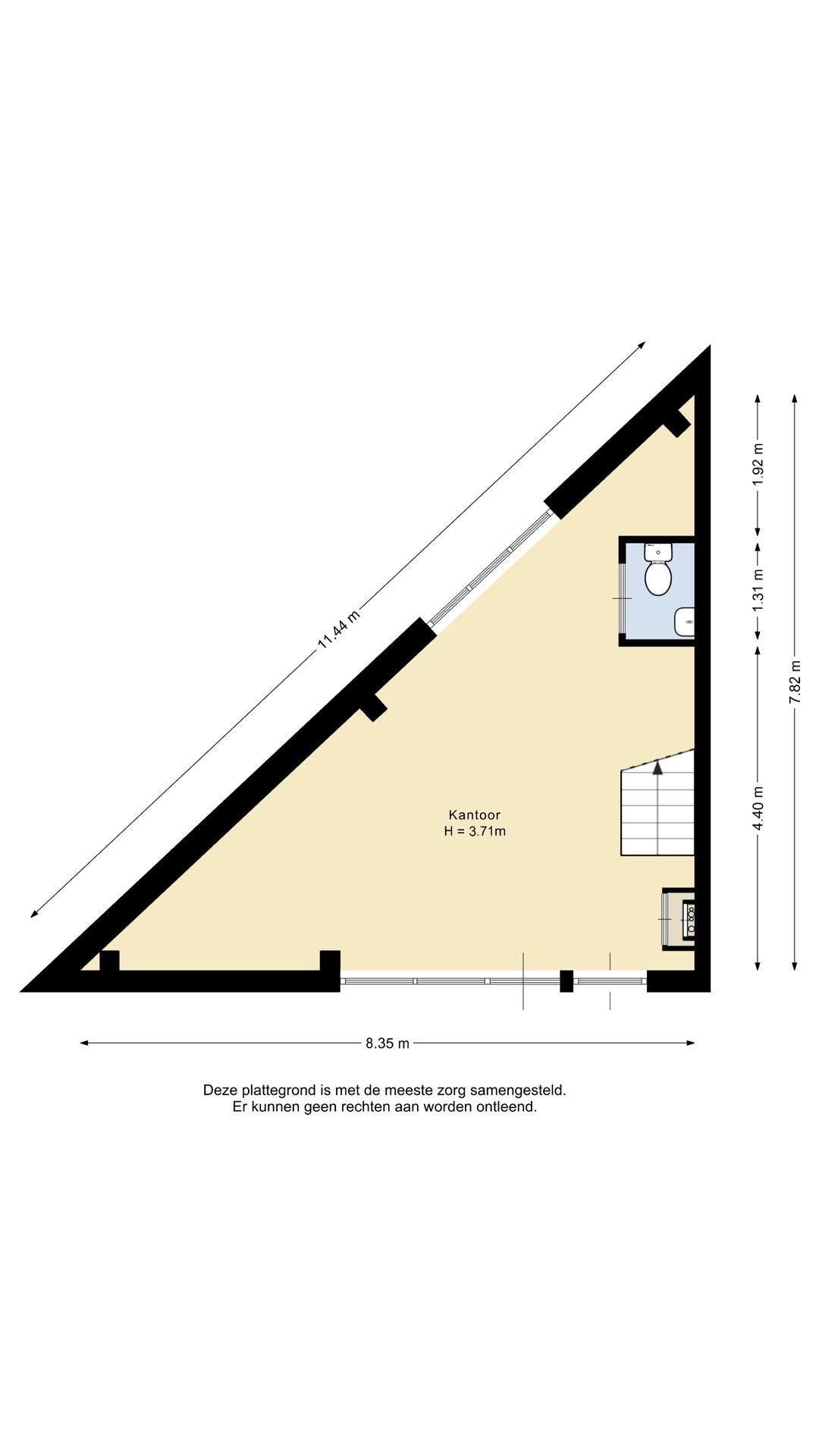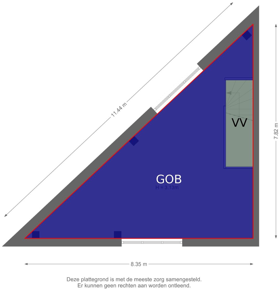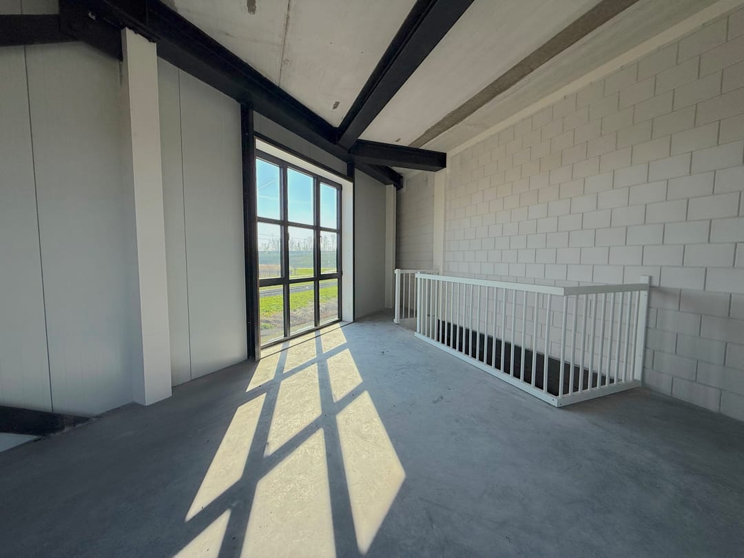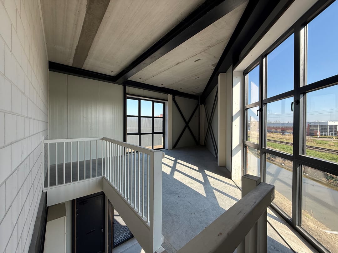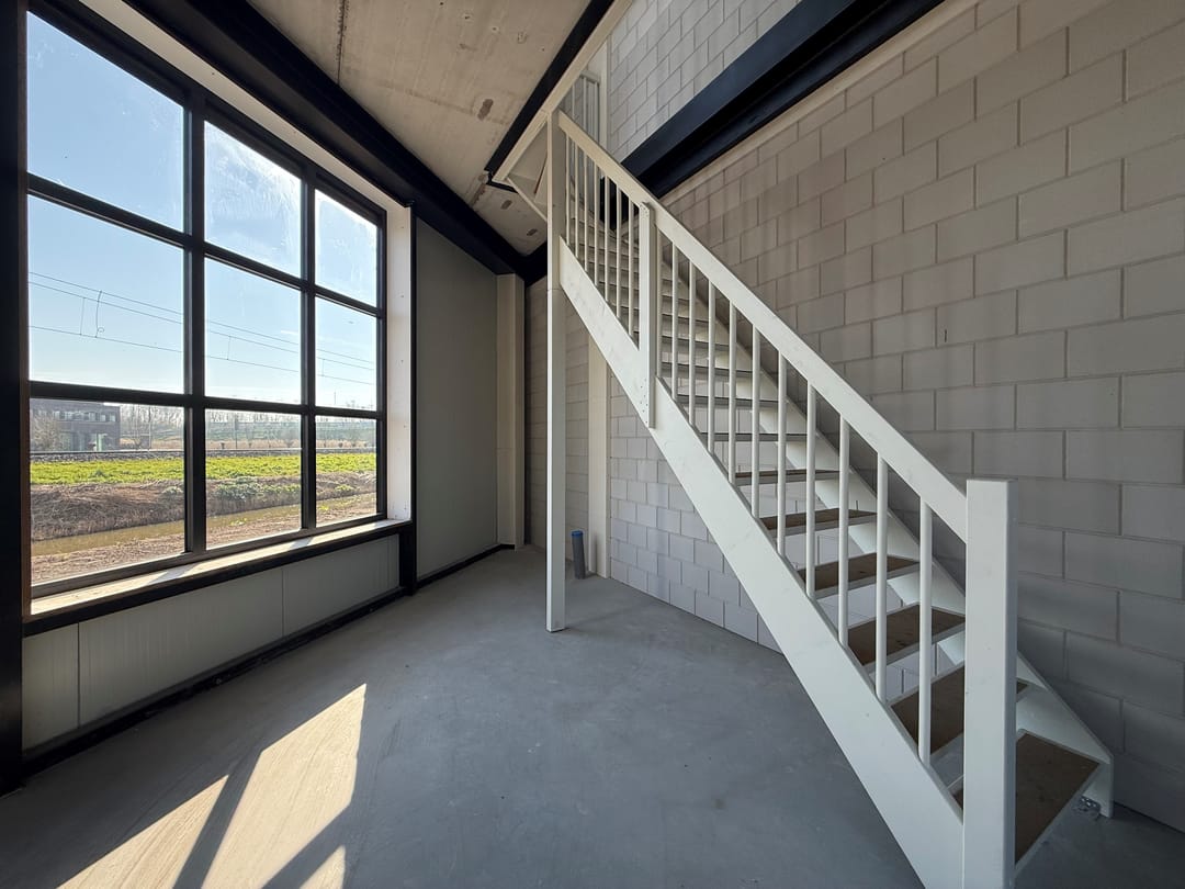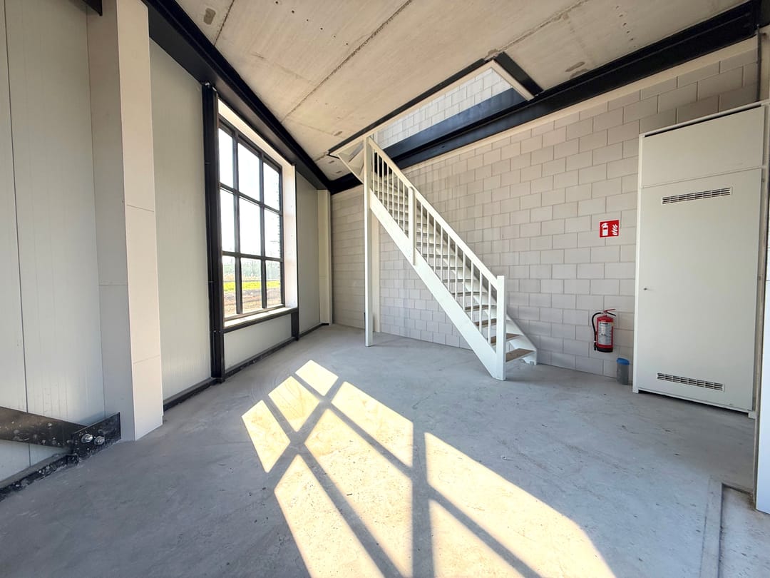 Op deze verdieping bevinden zich tevens de meterkast met aansluitingen voor water en elektra en is de voorbereiding voor een toilet aanwezig. De vaste trap leidt naar de verdieping, waar een volwaardige extra ruimte is gecreëerd met een hoogte van circa 3,1 meter. Deze verdieping leent zich uitstekend als kantoorruimte, showroom of aanvullende werkplek en voelt door de open opzet en lichtinval bijzonder fijn aan.