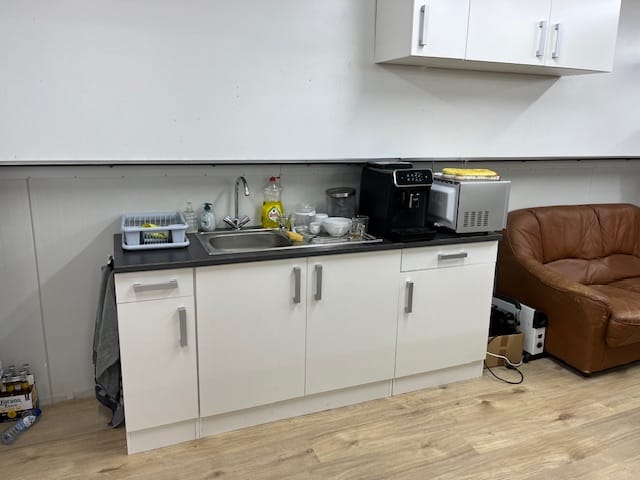 Op de verdieping is er ruimte voor een kantoor, er is een toilet en keukenblok aanwezig.