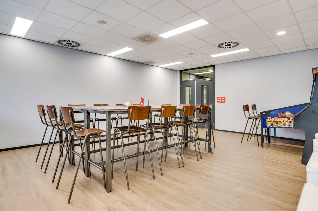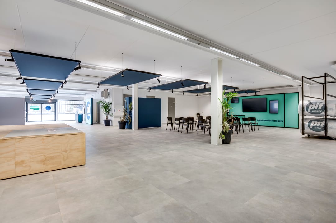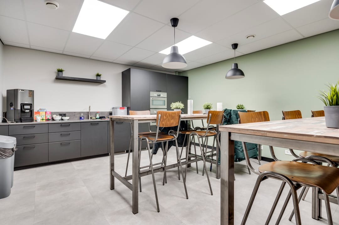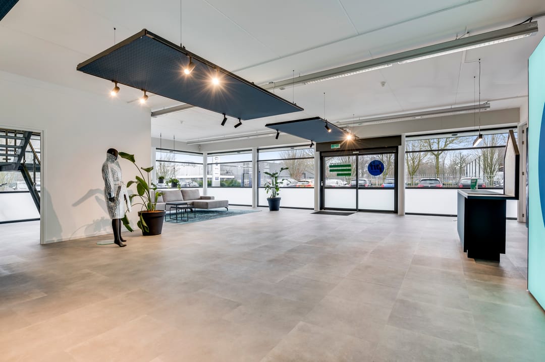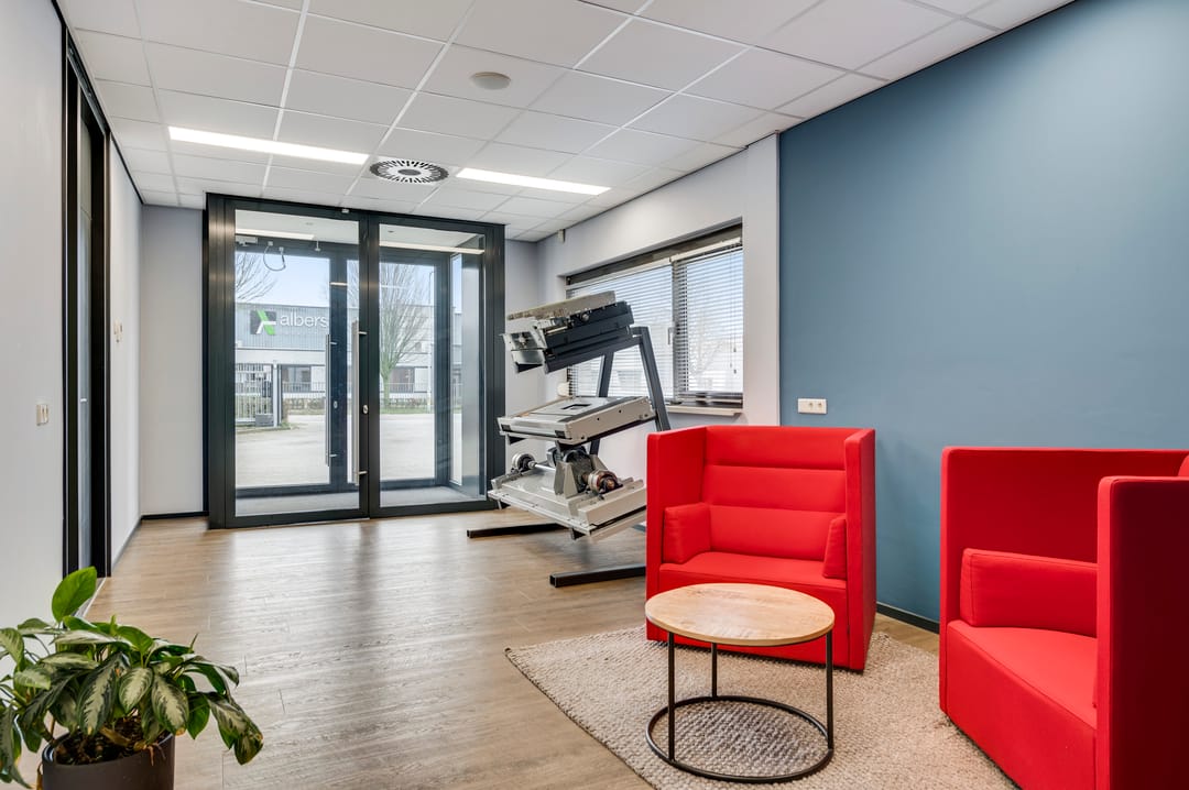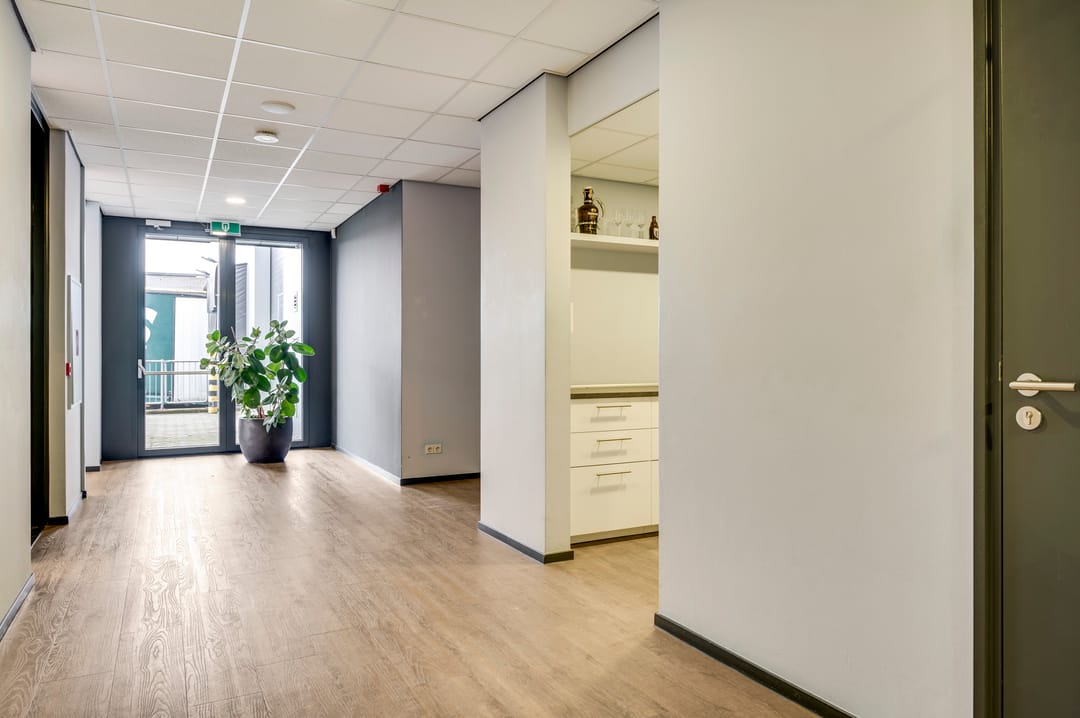 This beautiful space, currently used as a showroom, is ideal due to the high level of natural light and is also very suitable as a training space. A nice detail is the movable partition walls and curtains (these are available for takeover), allowing flexible layout options. The space also features a meeting room, kitchen, cleaning closet, pantry, and storage room. From this space, the outdoor area is also accessible.