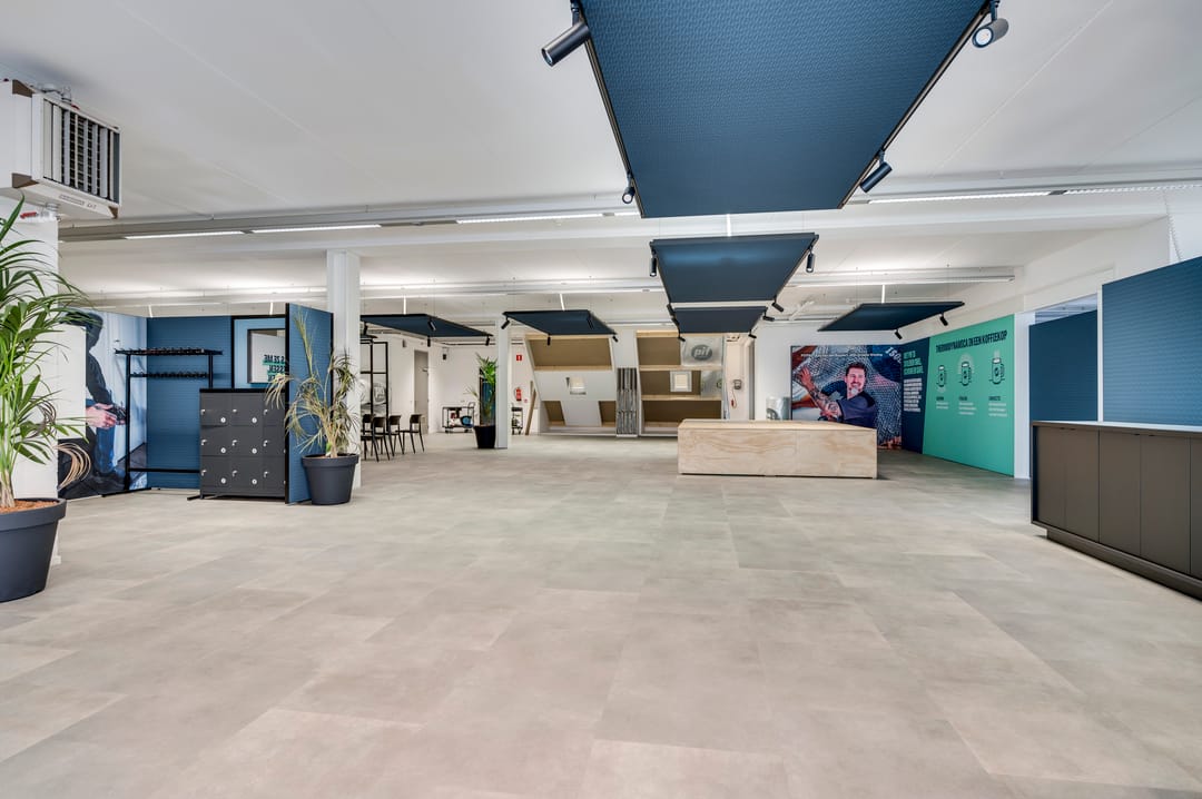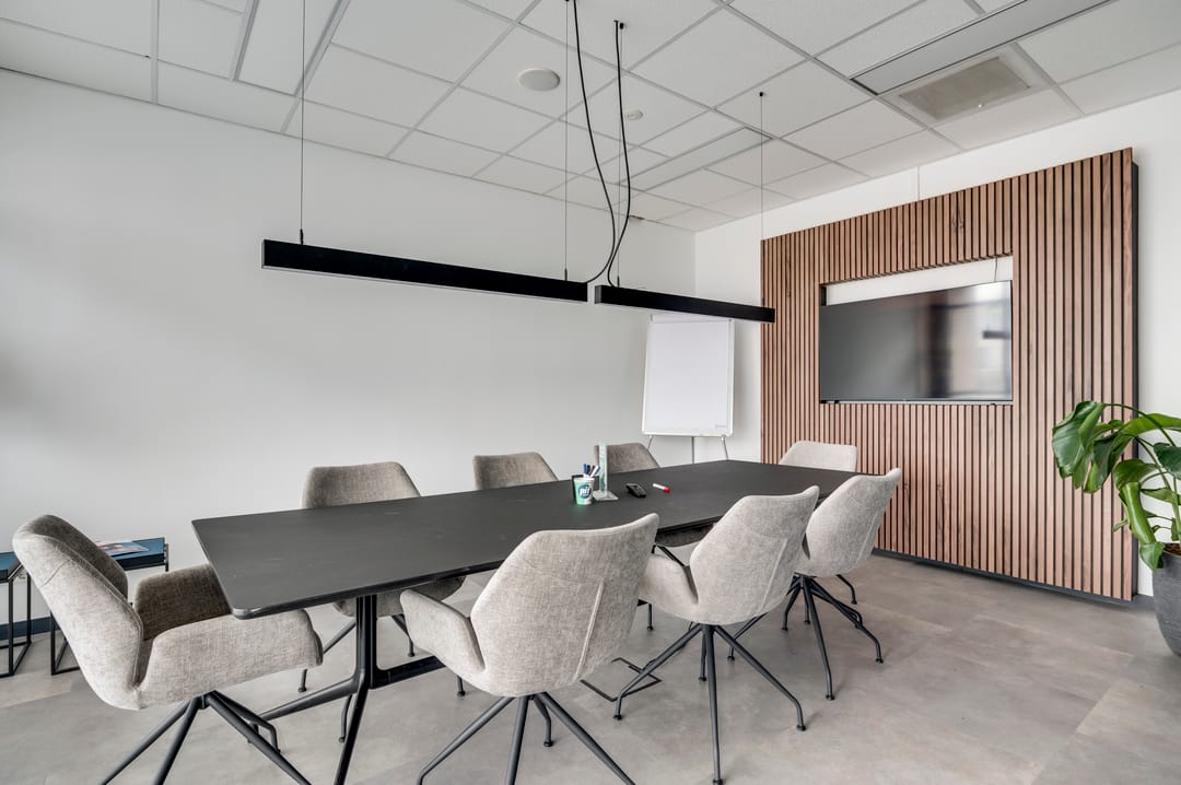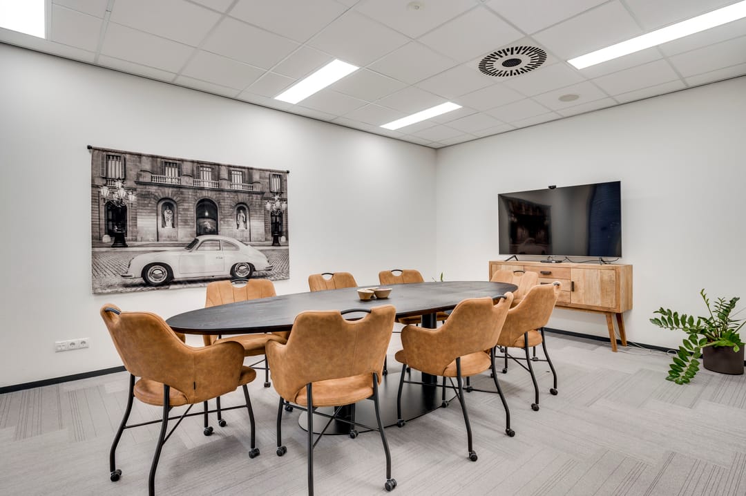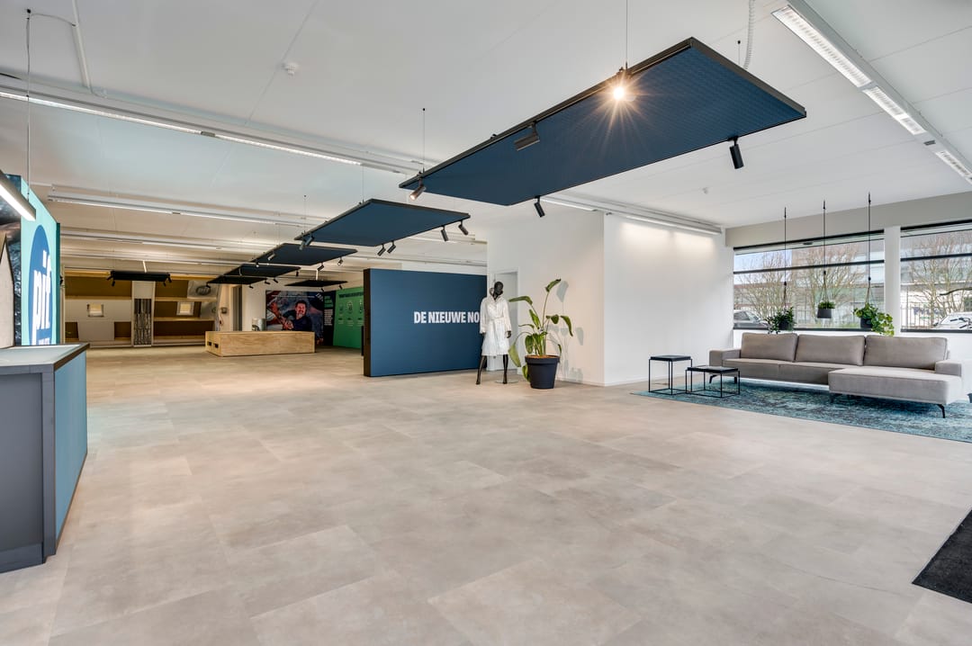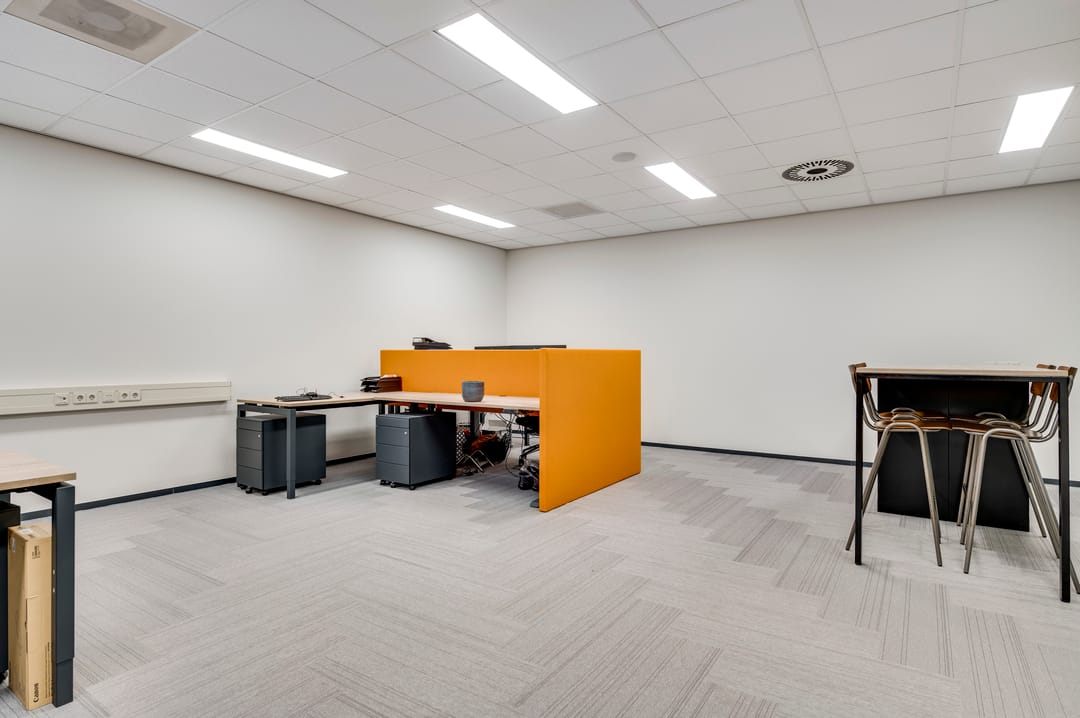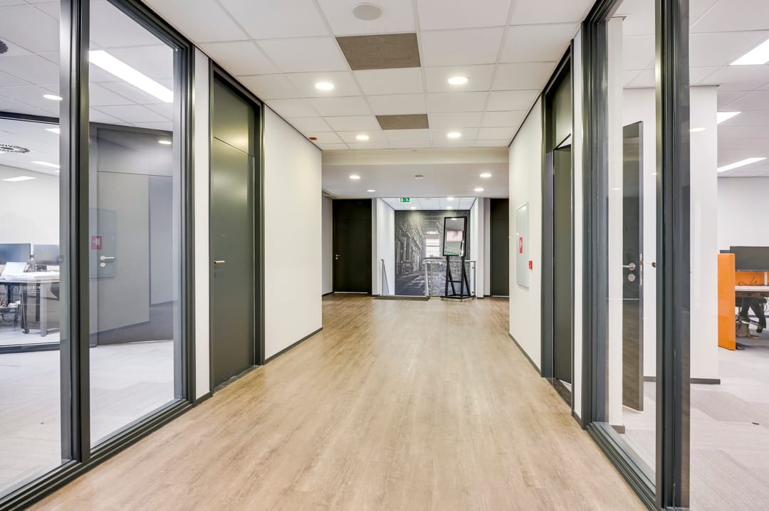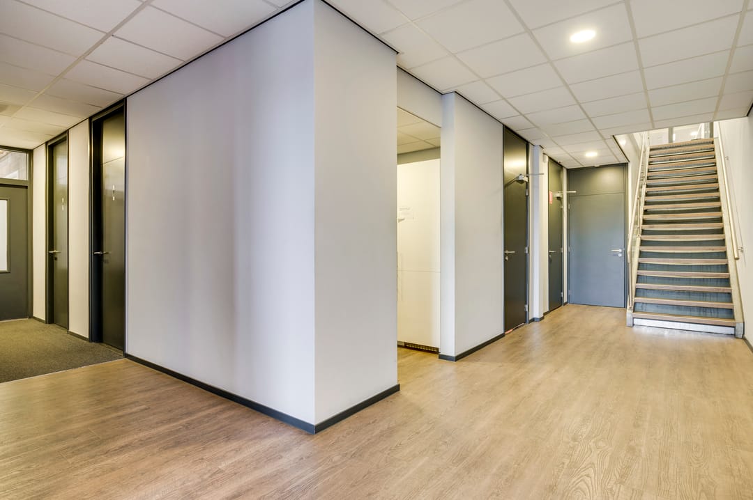 This beautiful space, currently used as a showroom, is ideal due to the high level of natural light and is also very suitable as a training space. A nice detail is the movable partition walls and curtains (these are available for takeover), allowing flexible layout options. The space also features a meeting room, kitchen, cleaning closet, pantry, and storage room. From this space, the outdoor area is also accessible.