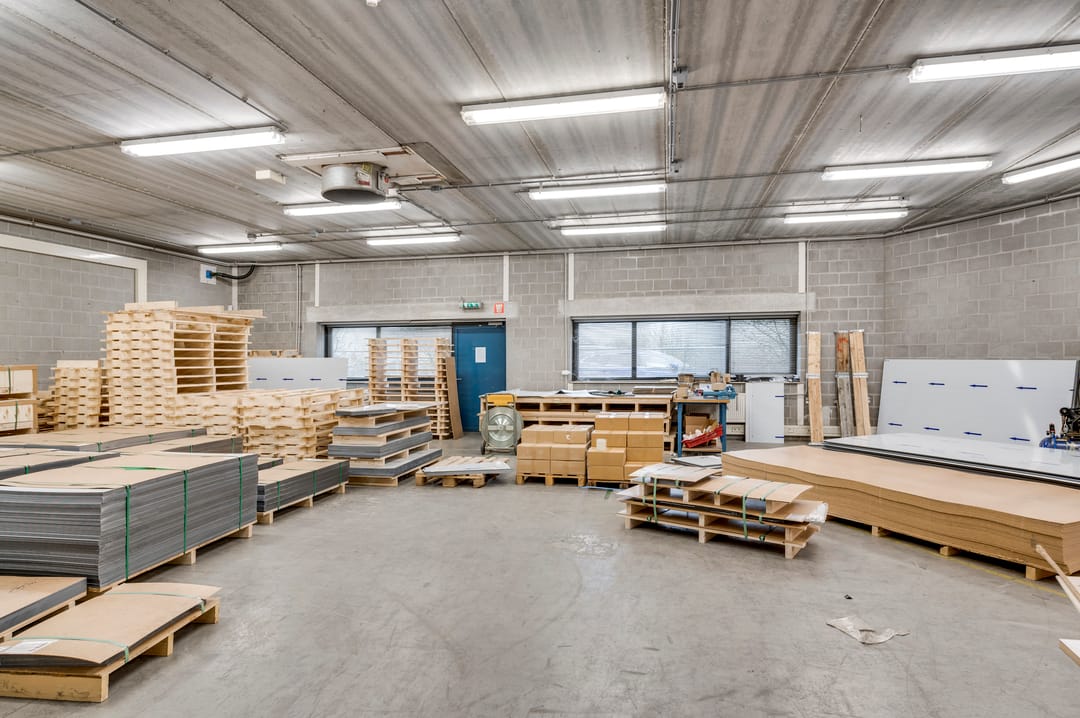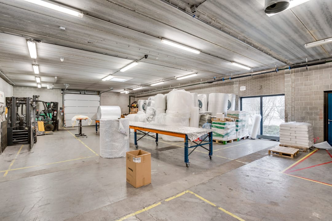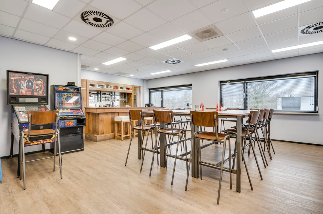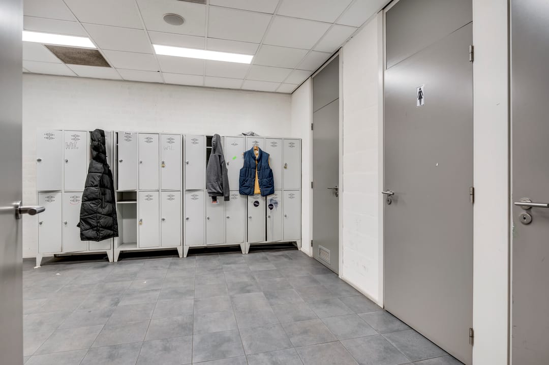 The spacious business area is divided into 3 open spaces, a changing room, a second canteen, and features 5 loading docks of 3 meters high and 3 sectional doors. Ideally, there is a night lock with one loading dock and sectional door. This allows loading and unloading outside opening hours without requiring full access to the entire business space. The changing room has separate ladies' and men's toilet groups and shower facilities. The canteen is equipped with a kitchenette including an oven, microwave, and refrigerator.