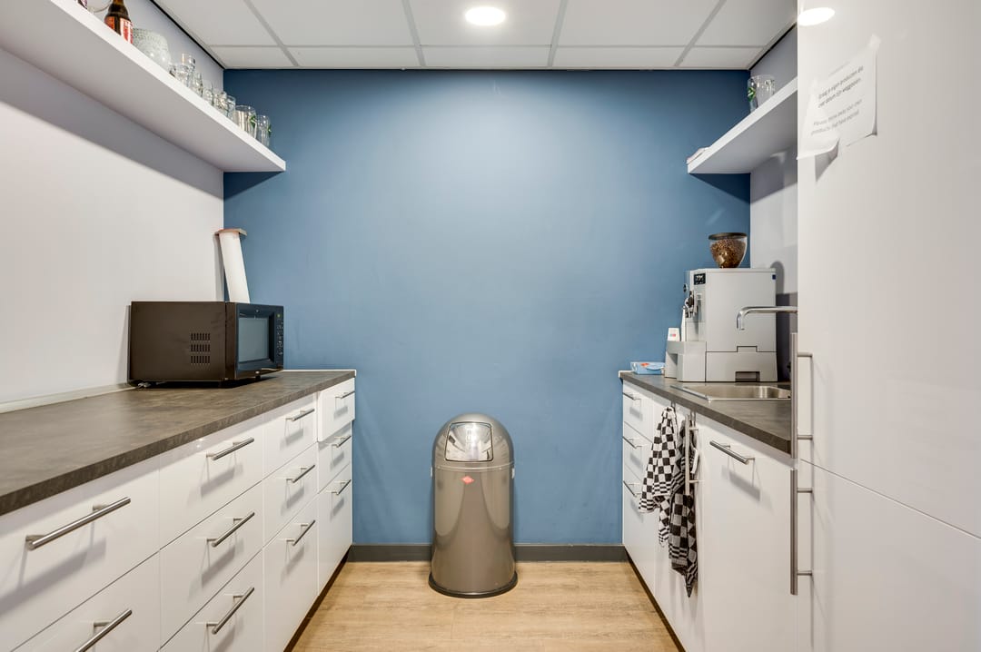 The offices with secondary spaces on the first floor are arranged as follows: 8 office rooms, a canteen, separate ladies' and men's toilet groups, and a technical room. The hallway is finished with a PVC floor and provides access to all rooms, the staircase to the business space on the ground floor, and a staircase to the showroom. Several offices have their own archive cabinet. The canteen is equipped with a stylish bar (this remains), ideal for Friday afternoon drinks or staff meetings!