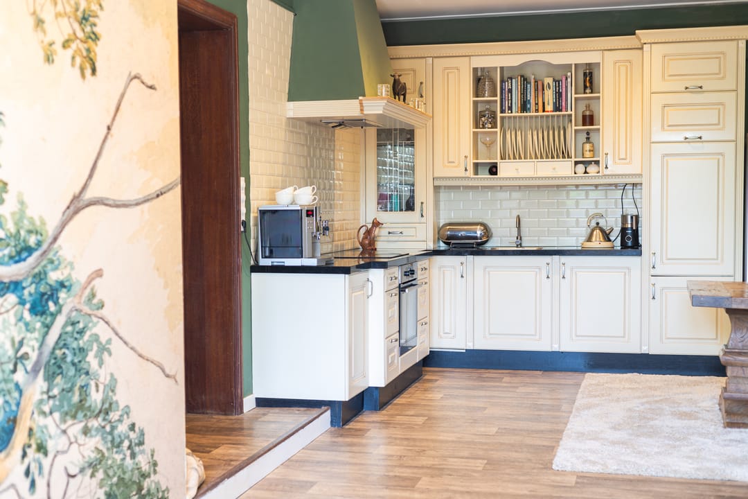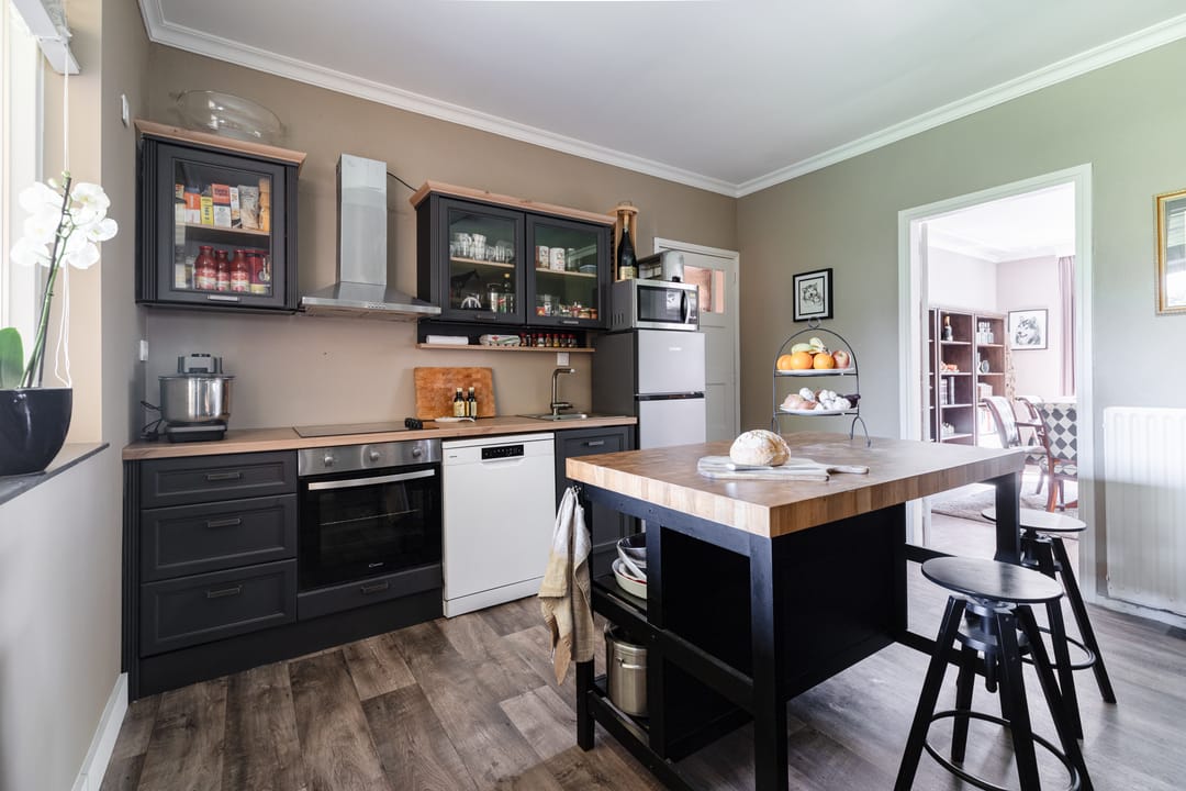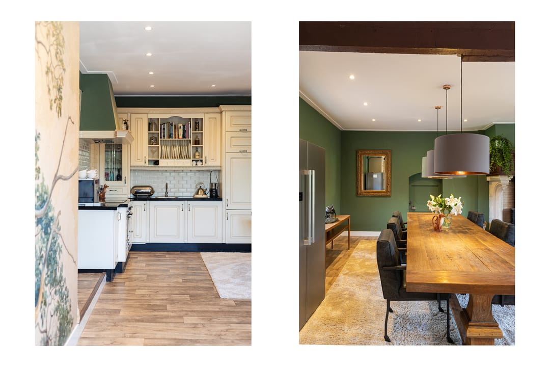 Wanneer je het voorhuis binnenstapt, word je verwelkomd in de hal die toegang biedt tot verschillende vertrekken. Links vind je een extra kamer, ideaal voor thuiswerken, beneden slapen of speelplek voor de kinderen. De hal geeft toegang tot een ruime woonkamer met hoge plafonds met klassieke uitstraling. De deur aan de linkerzijde leidt naar de keuken, die in 2024 volledig is vernieuwd en perfect past bij de stijl van de woning. Vanuit de keuken kijk je uit op een charmante veranda en uitgestrekte weilanden, en heb je toegang tot een praktische kelder.