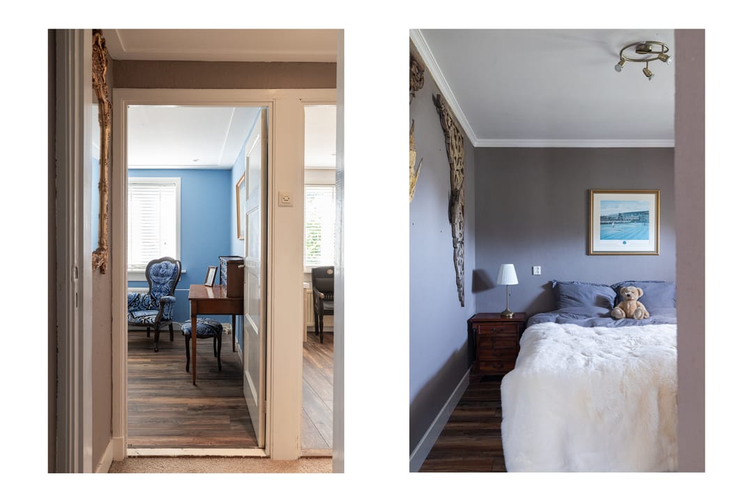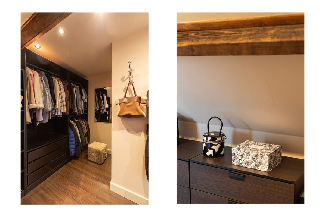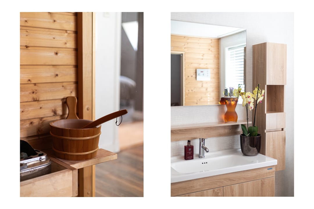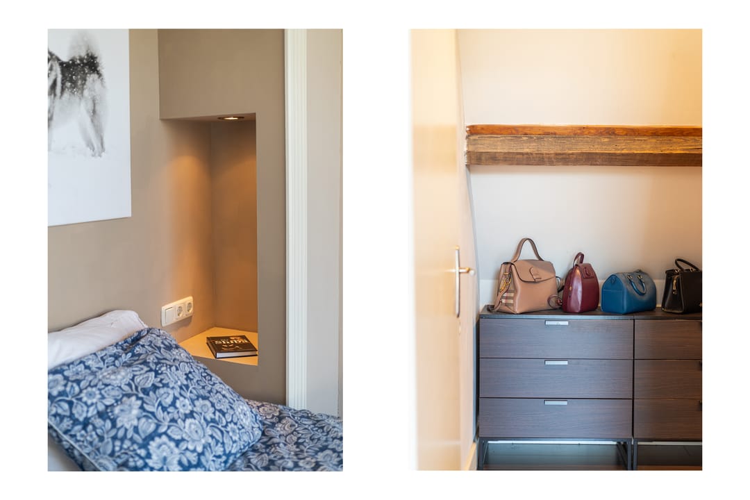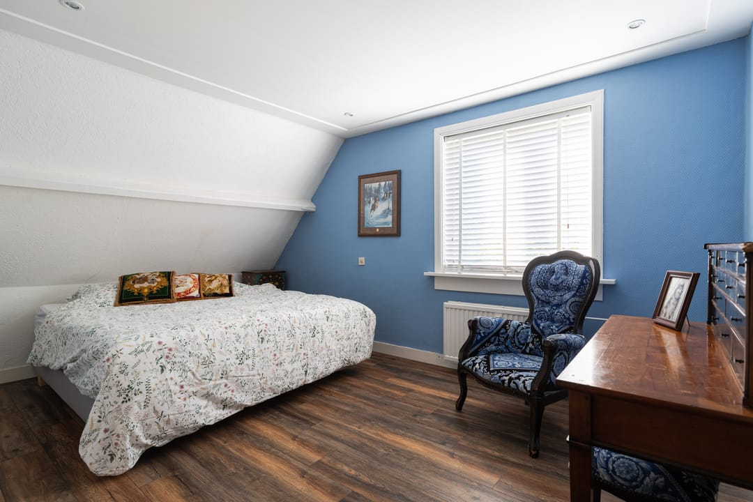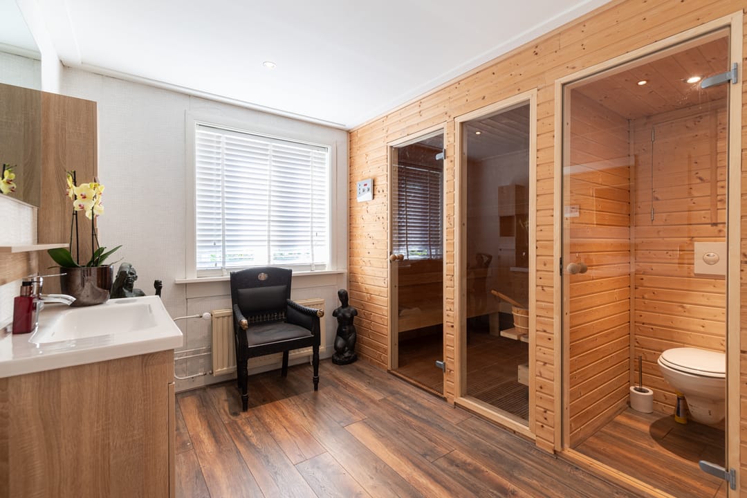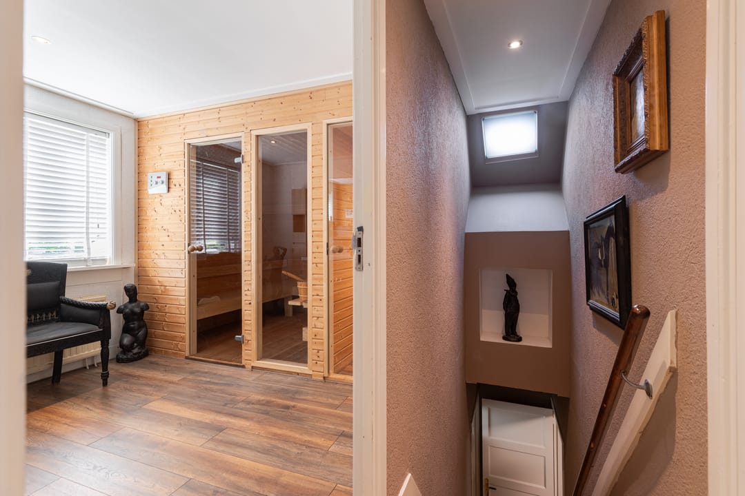 Op de eerste verdieping leidt de overloop naar een royale badkamer die dienst doet als welness ruimte met een ontspannende sauna, toilet en wastafel. Aan de overkant bevindt zich een separate douche. Hier vind je ook twee ruime slaapkamers met karakteristieke vaste kasten. De lichte schuinte van het dak zorgt voor een geborgen gevoel. Tot slot is er nog een bergvliering, ideaal voor het opbergen van niet-dagelijkse spullen.