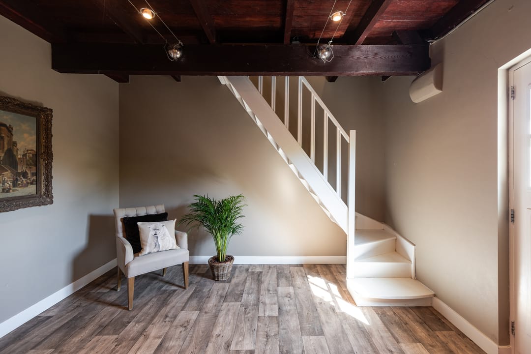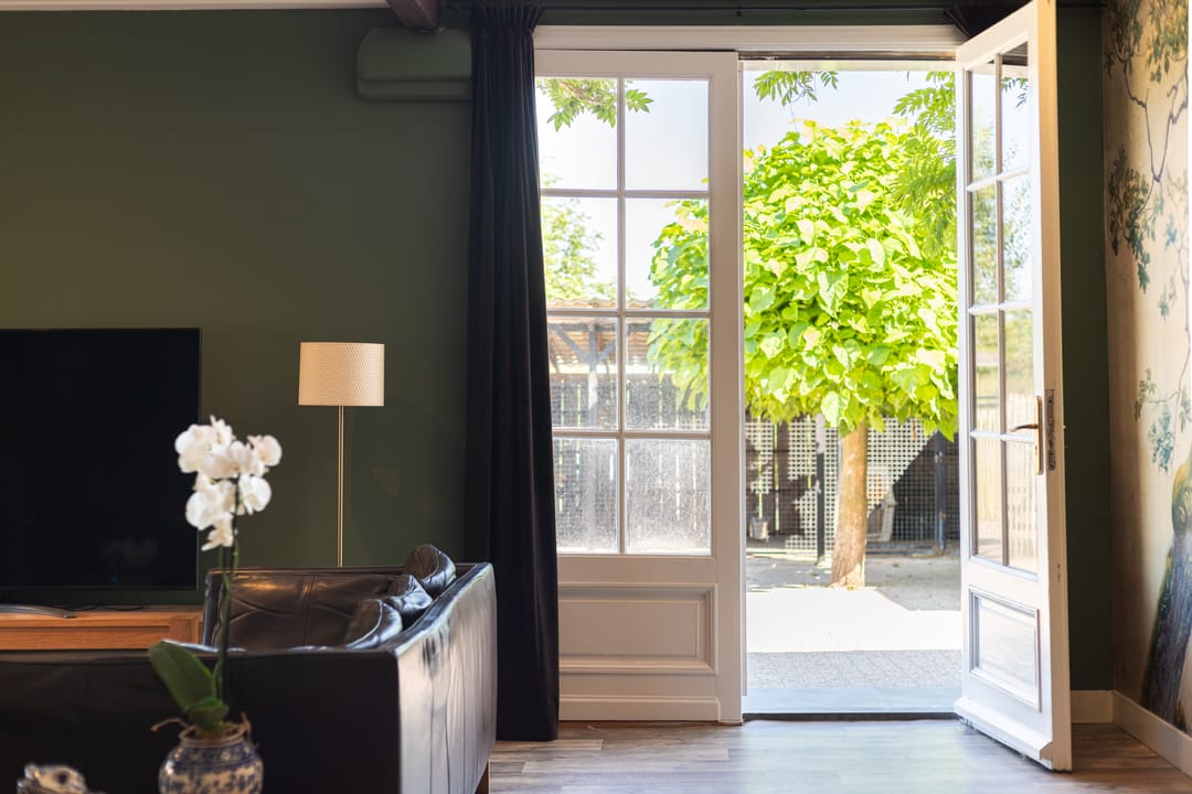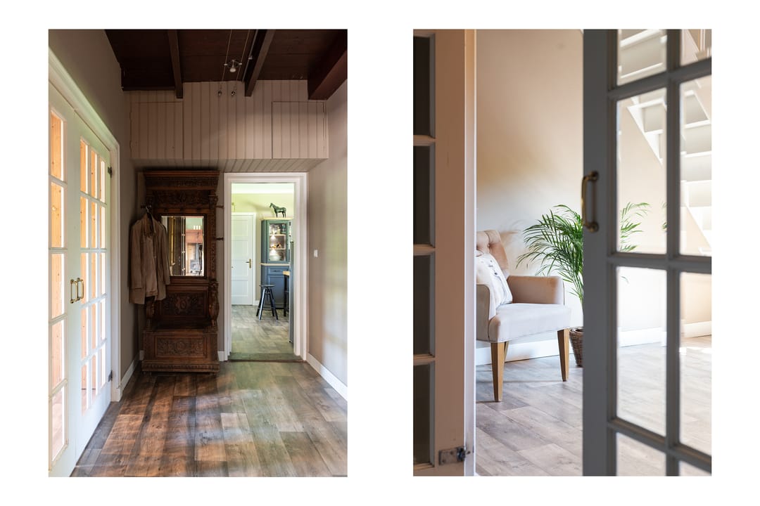 De voormalige deel met stallen is volledig gerenoveerd met oude bouwmaterialen tot een sfeervol, zelfstandig woonhuis met eigen ingang, waardoor dubbele bewoning mogelijk is. Bij binnenkomst kom je in een ruime hal met inbouwkasten, daarna een brede gang die toegang geeft tot de bijkeuken met ruimte voor de wasmachine, en een sfeervolle badkamer voorzien van toilet, ligbad, douche en wastafelmeubel. Authentieke deuren afkomstig uit een Frans kasteel leiden je naar de royale woonkamer.