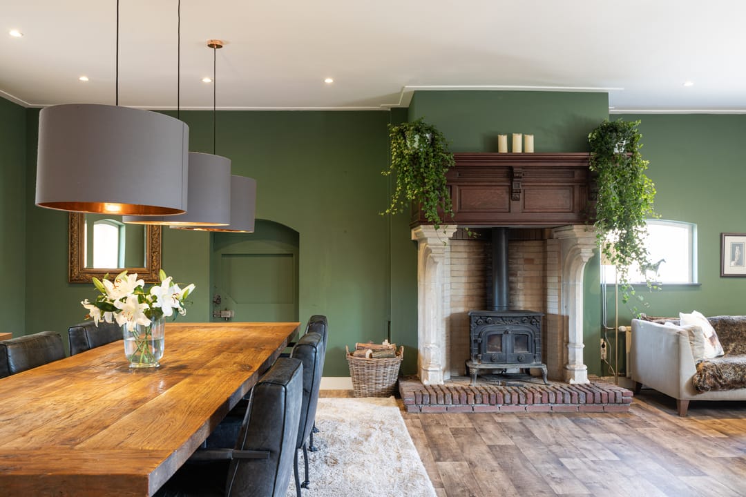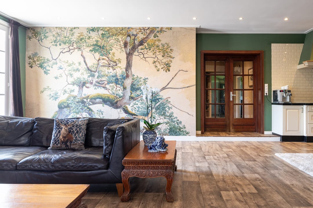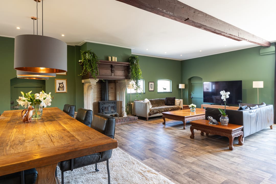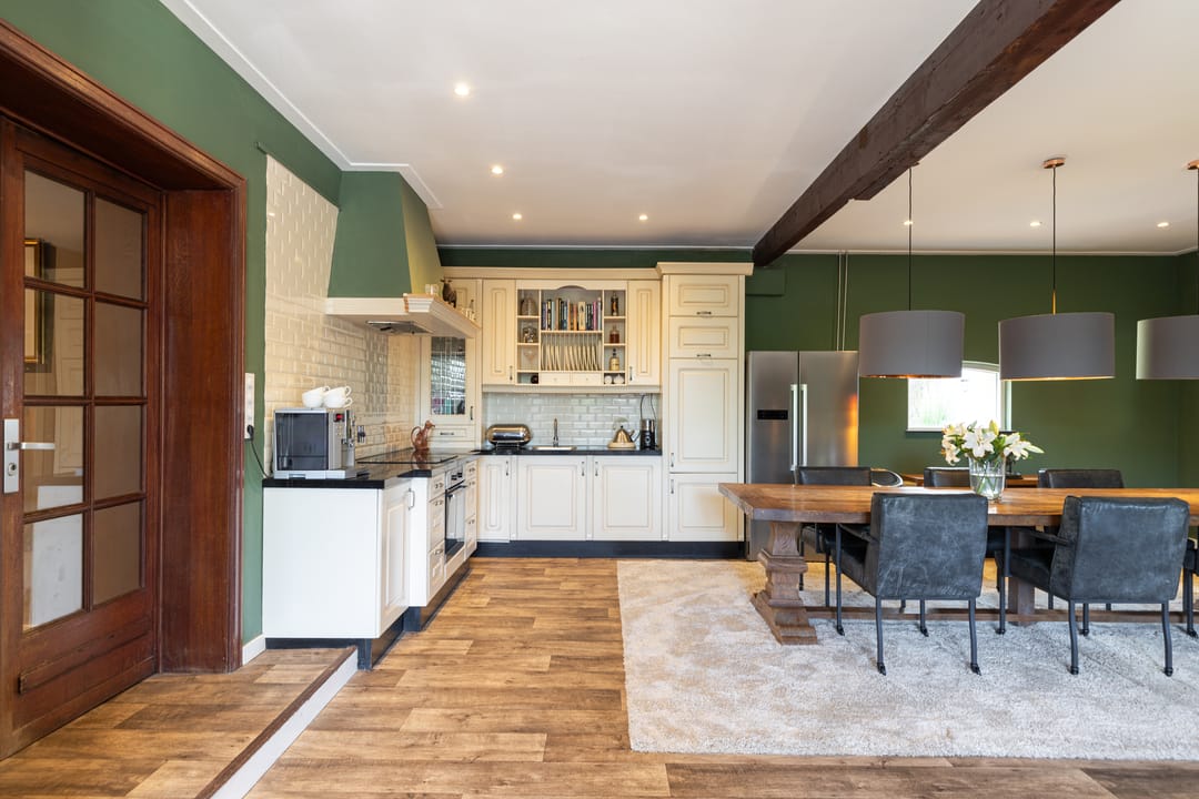 De woonkamer ademt sfeer en biedt een open leefruimte, met genoeg plaats voor een grote eettafel en een comfortabele zithoek. De keuken in hoekopstelling biedt alle gemakken. De indrukwekkende antieke schouw met houtkachel, zichtbare oude balken en staldeuren versterken het authentieke gevoel.