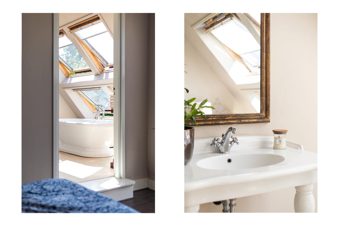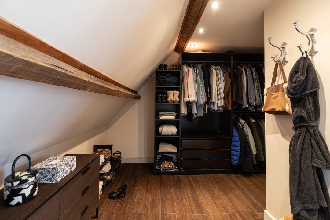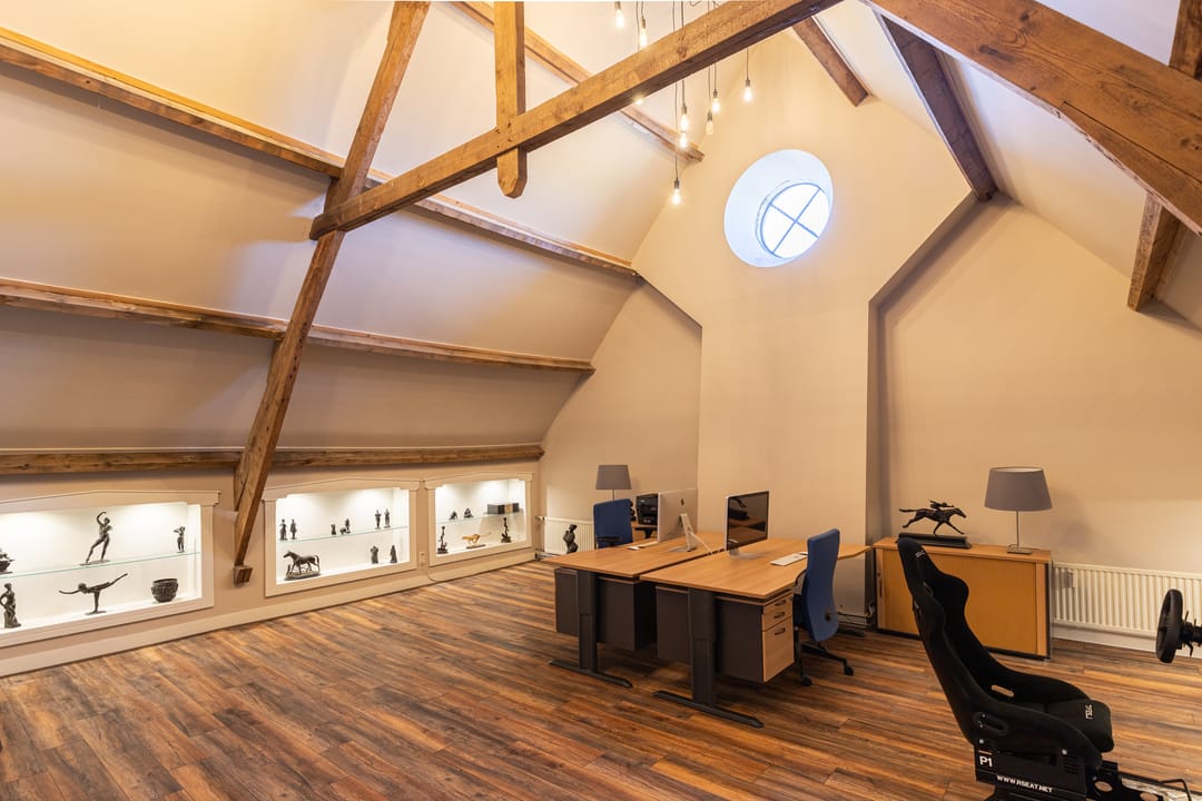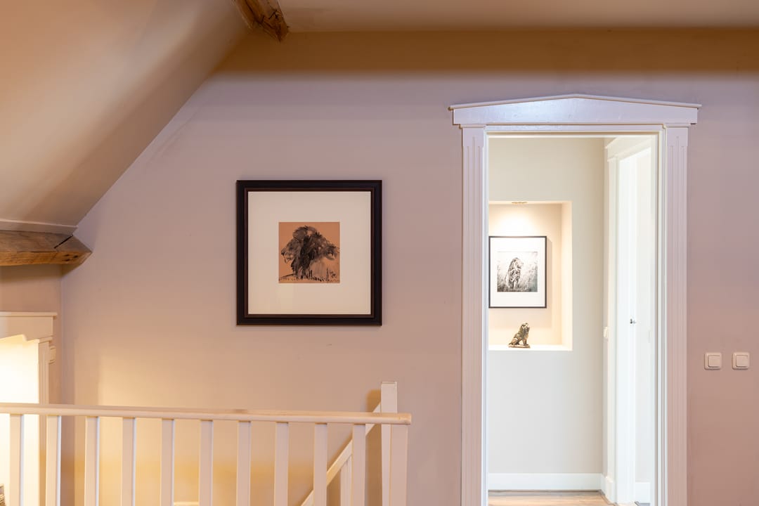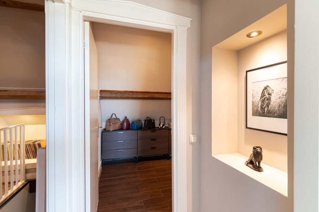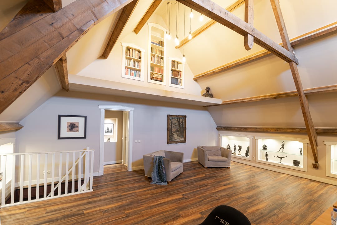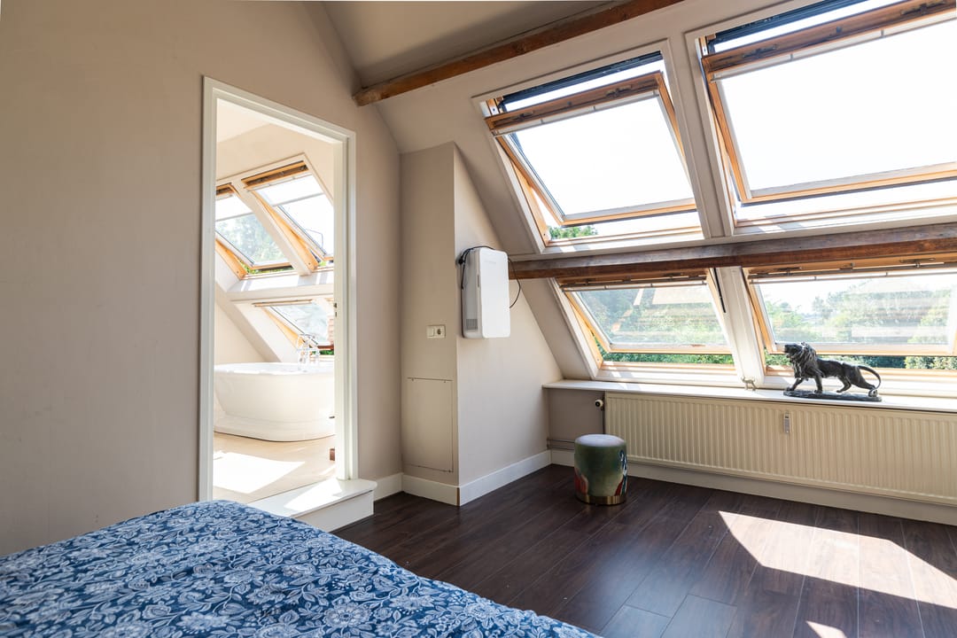 Als je de trap naar de eerste verdieping neemt, word je begroet door een indrukwekkende hoge bovenverdieping met karakteristieke balken en een rond raam. Momenteel in gebruik als study met ingebouwde vitrinekasten, biedt deze ruimte tal van mogelijkheden, zoals het creëren van extra (slaap)kamers. Aangrenzend vind je een grote kleedkamer en de masterbedroom, die met zijn vele dakramen een prachtig uitzicht heeft over de weilanden en natuur. Deze kamer beschikt over airconditioning en een badkamer en suite, compleet met een vrijstaand ligbad, douche en afgeschermd toilet.