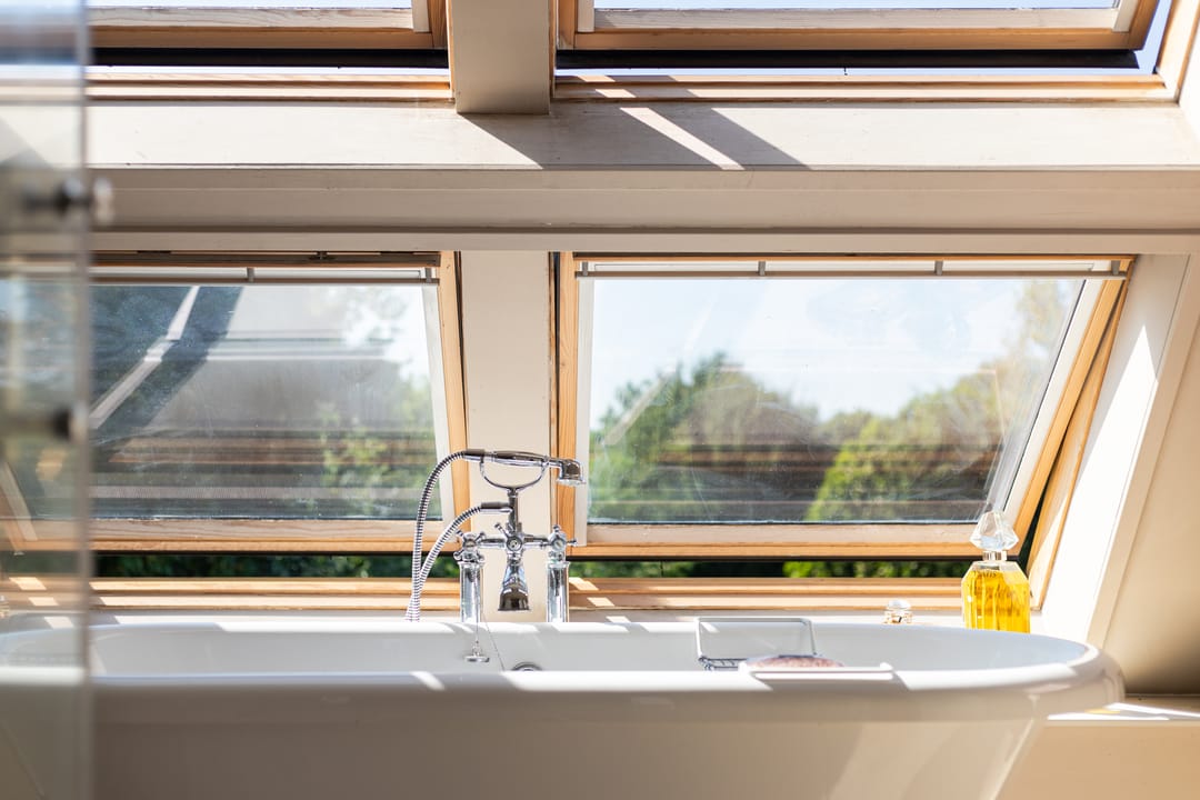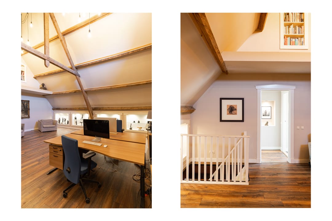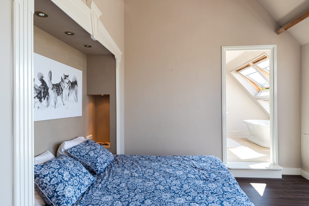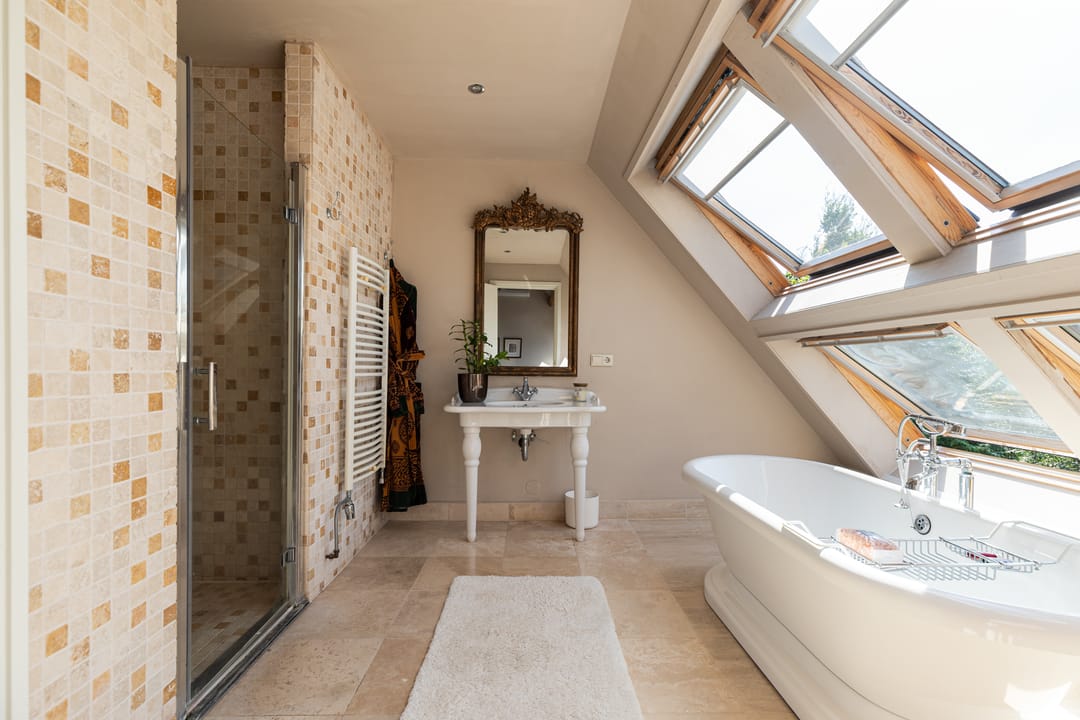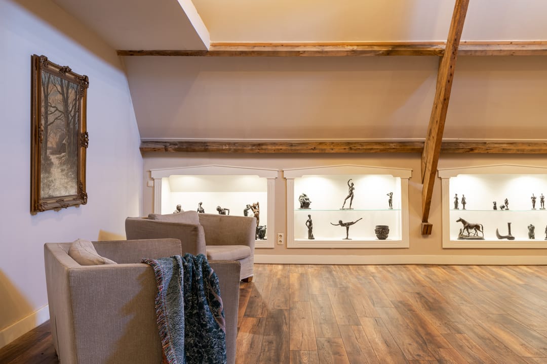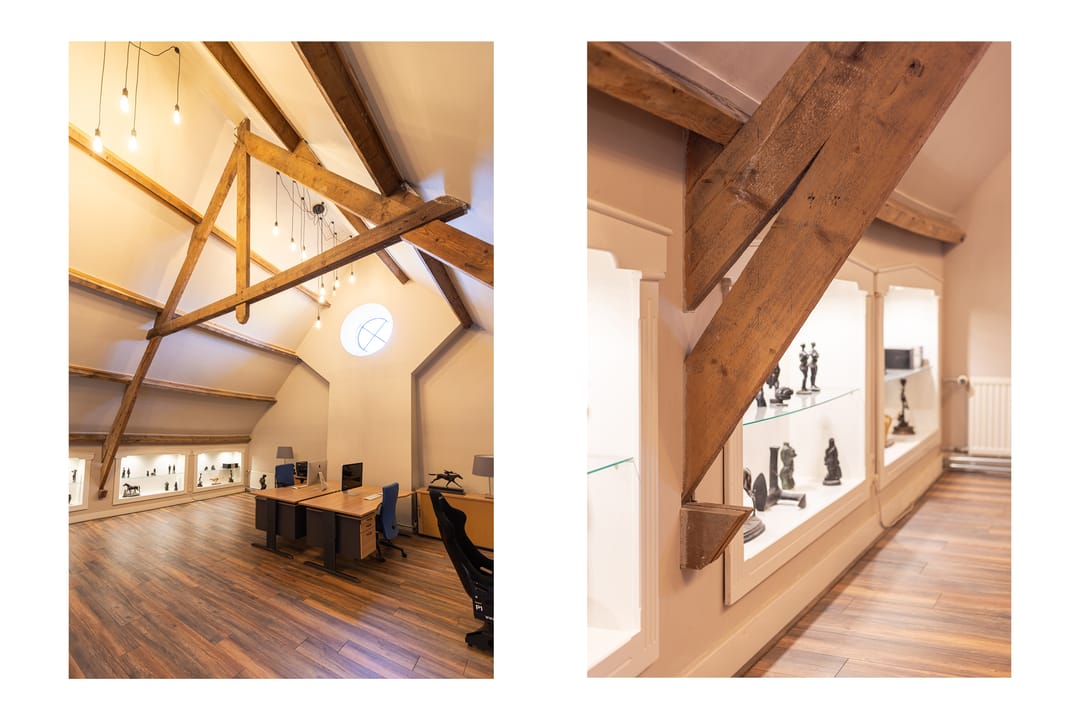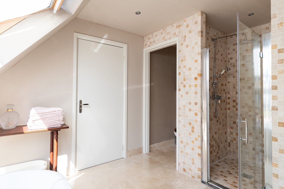 Als je de trap naar de eerste verdieping neemt, word je begroet door een indrukwekkende hoge bovenverdieping met karakteristieke balken en een rond raam. Momenteel in gebruik als study met ingebouwde vitrinekasten, biedt deze ruimte tal van mogelijkheden, zoals het creëren van extra (slaap)kamers. Aangrenzend vind je een grote kleedkamer en de masterbedroom, die met zijn vele dakramen een prachtig uitzicht heeft over de weilanden en natuur. Deze kamer beschikt over airconditioning en een badkamer en suite, compleet met een vrijstaand ligbad, douche en afgeschermd toilet.