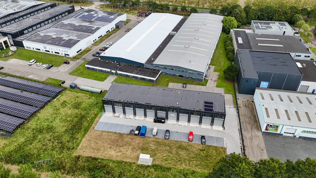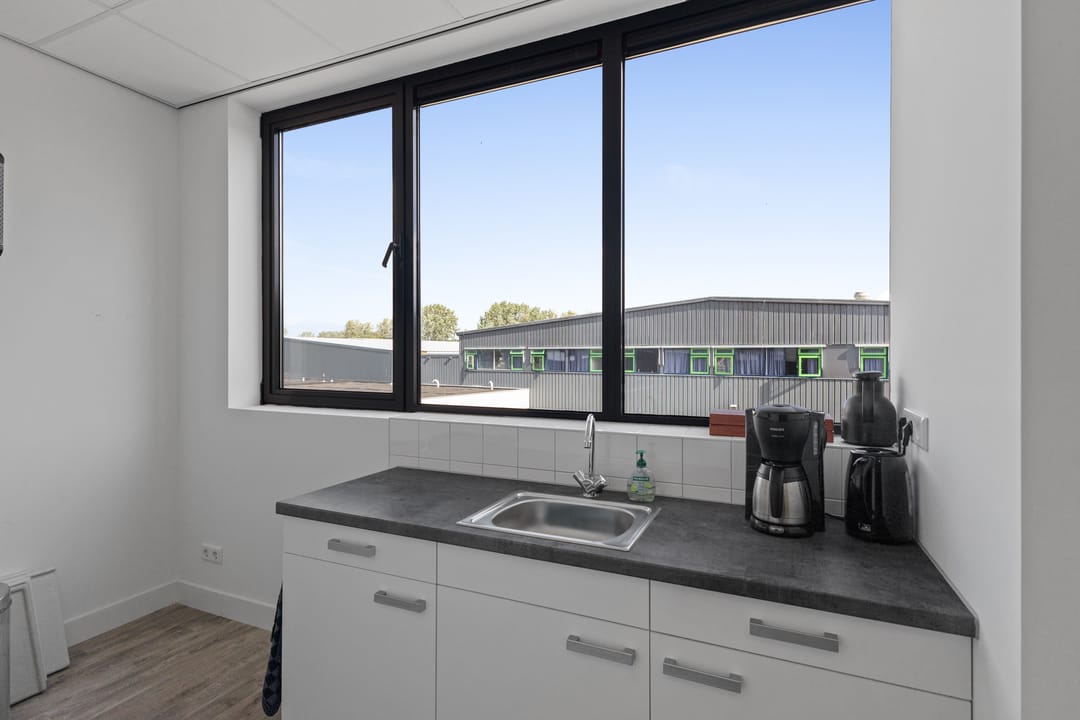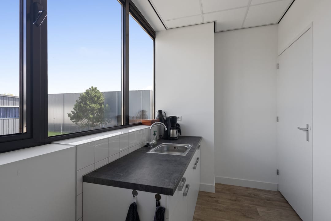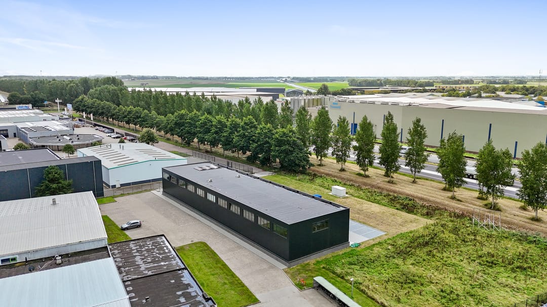 De bedrijfsunit heeft een moderne en frisse uitstraling door zwarte gevel sandwichpanelen, met aansluiting voor water en elektra (geen gasaansluiting).