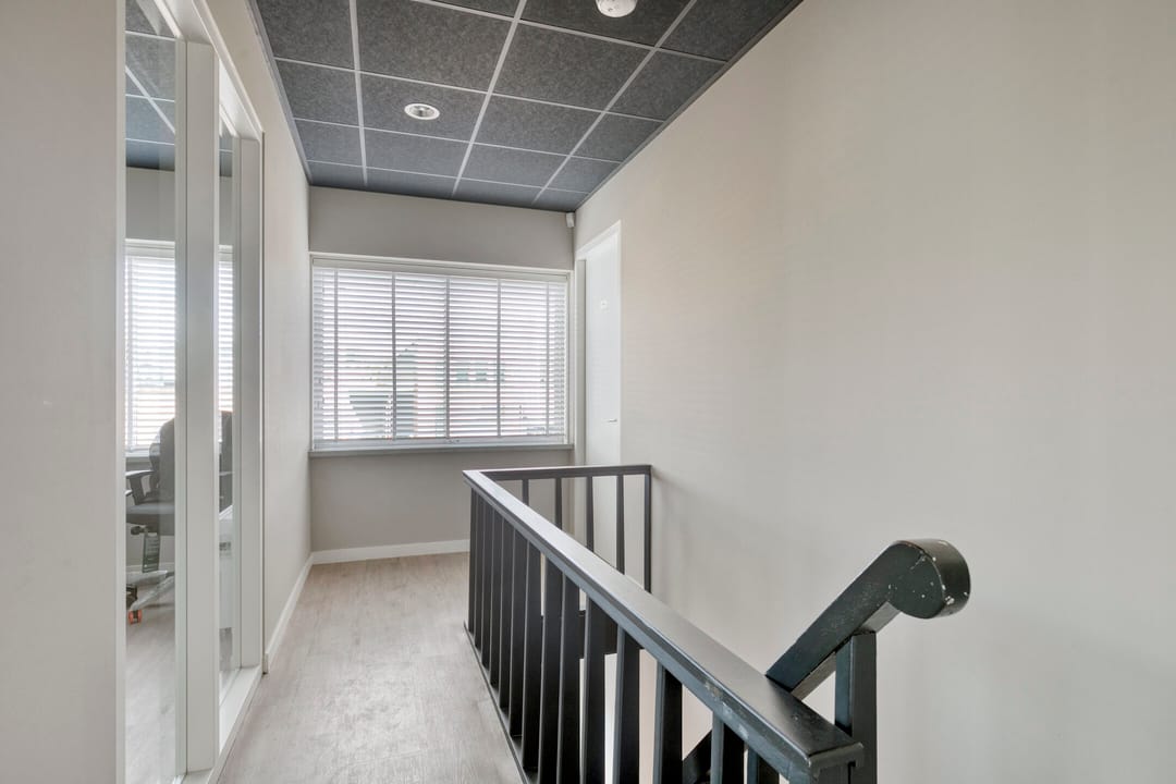 De verdieping is bereikbaar via meerdere trappen: in de centrale hal, in de bedrijfshal en achterin het pand. Aan de voorzijde bevindt zich een hal met toegang tot een kantoor/vergaderruimte aan de rechterzijde en een kleiner kantoor aan de linkerzijde. Hier is ook een toilettenblok gesitueerd. De verdieping beslaat delen van de voor-, rechter- en achterzijde van het gebouw en is tevens goed bruikbaar als opslagruimte.
