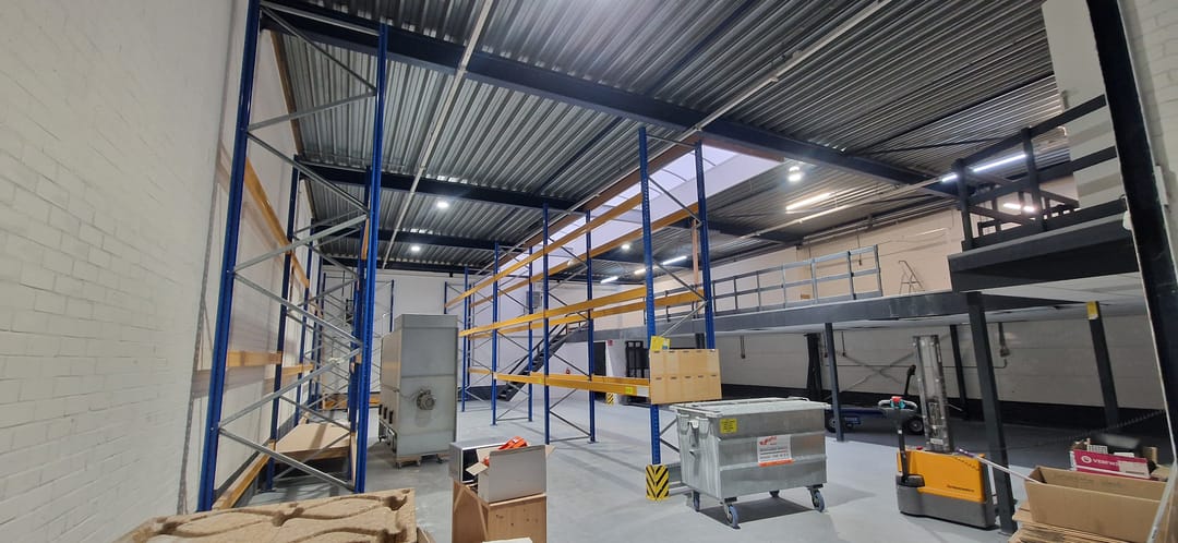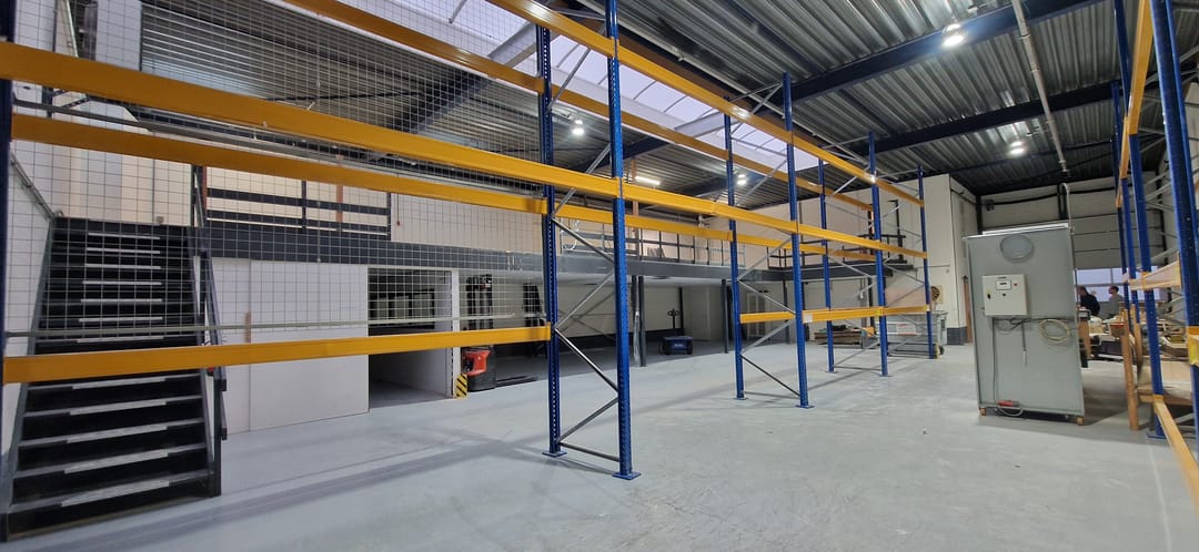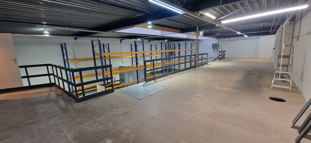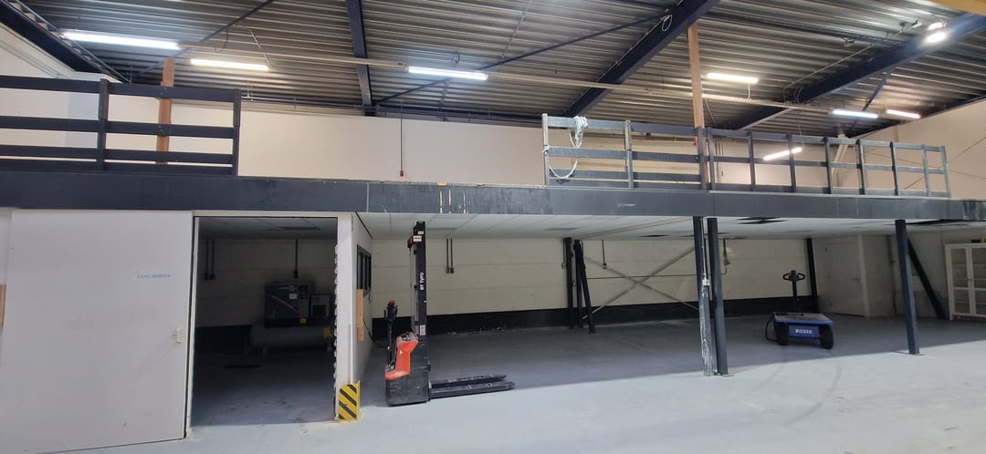 • houten entresolvloer met vloerbelasting van 350 kg/m² en 250 kg/m² (achterste deel).