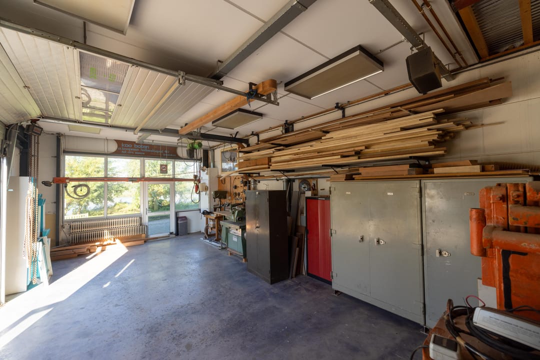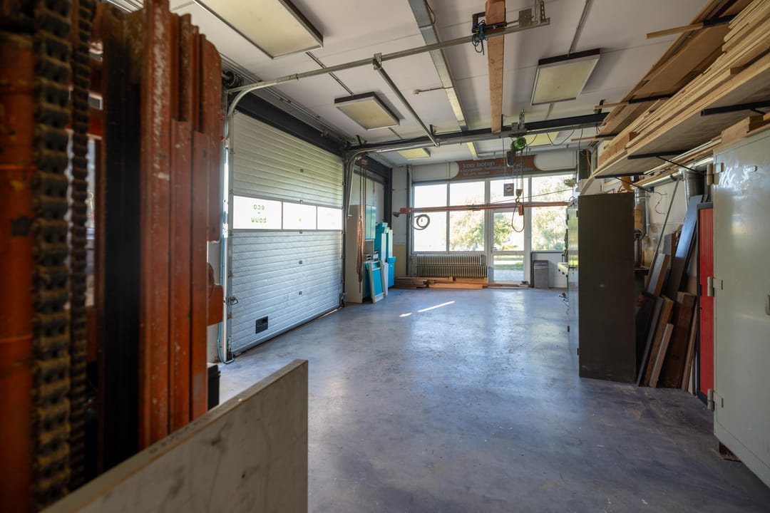 The commercial space measures approximately 55 m² LFA on the ground floor with a clear height of approximately 3.50 m². The hall has a smooth concrete floor and is accessible via a wide service door (2.97 x 3.00 m²) and two separate pedestrian doors. The hall is an open-plan workspace with a light hoist and equipment suitable for a carpentry workshop.