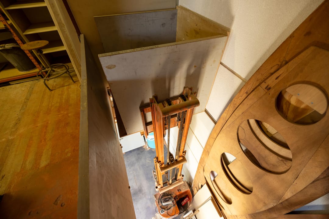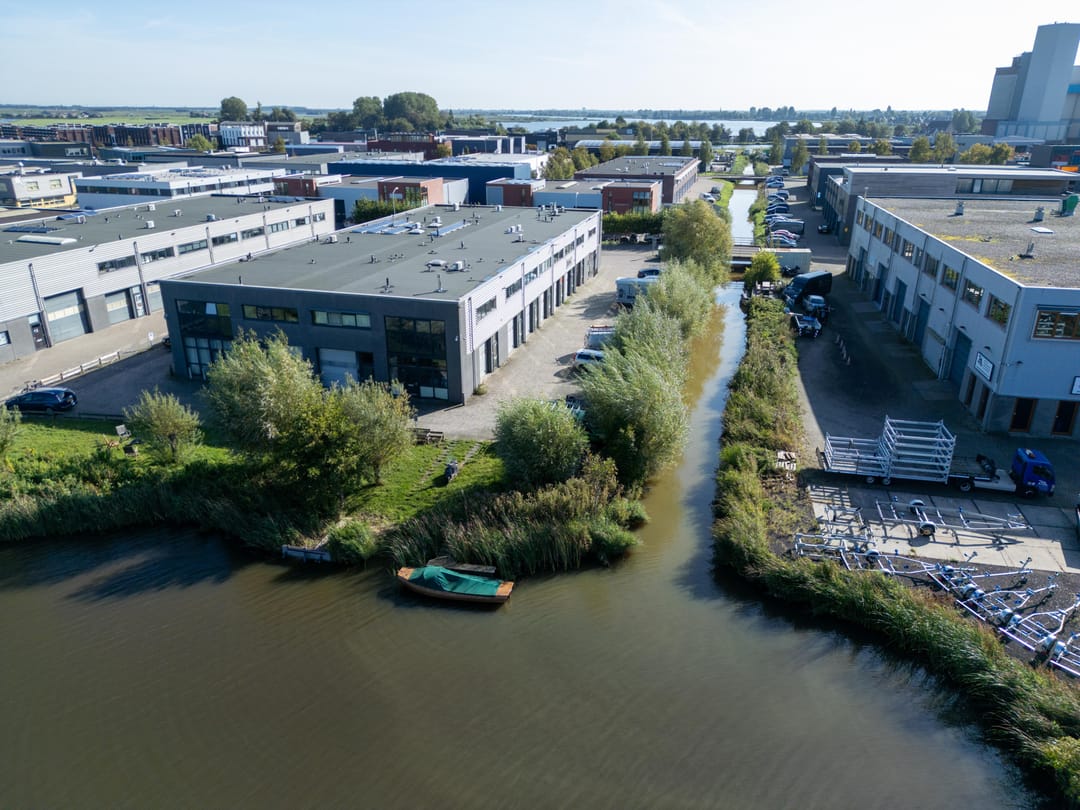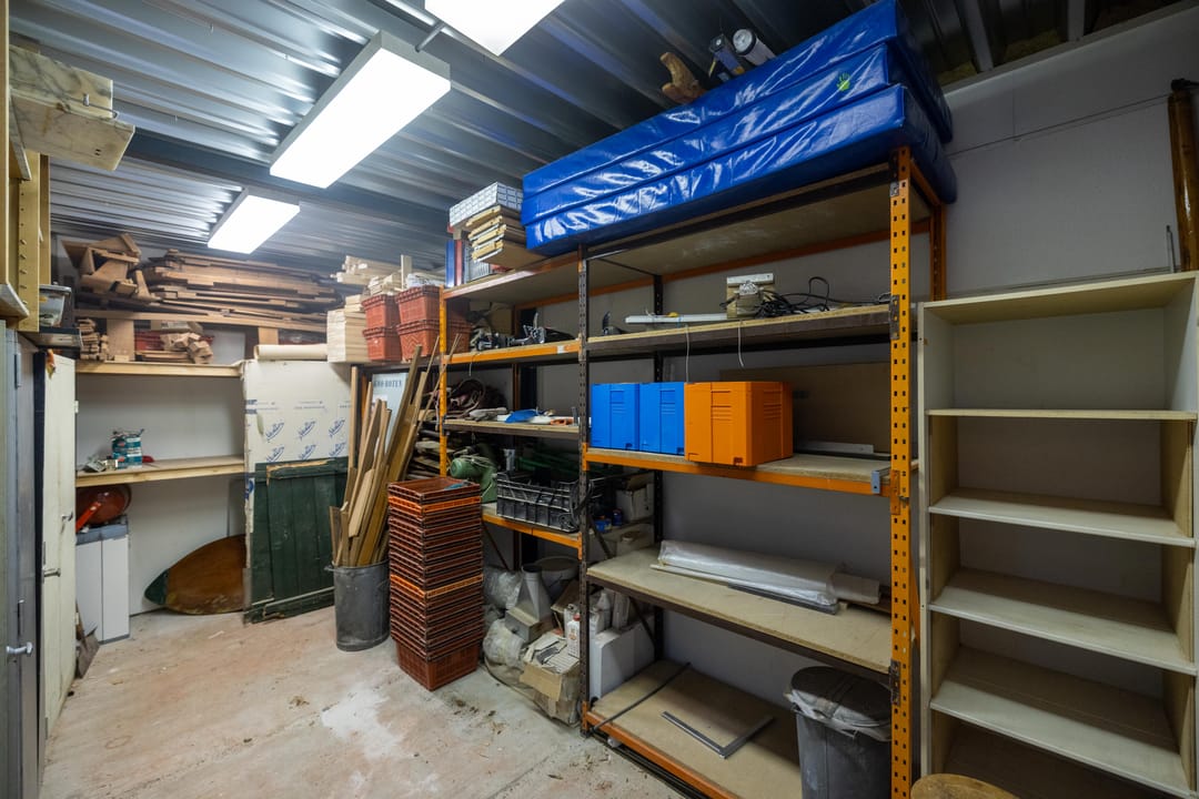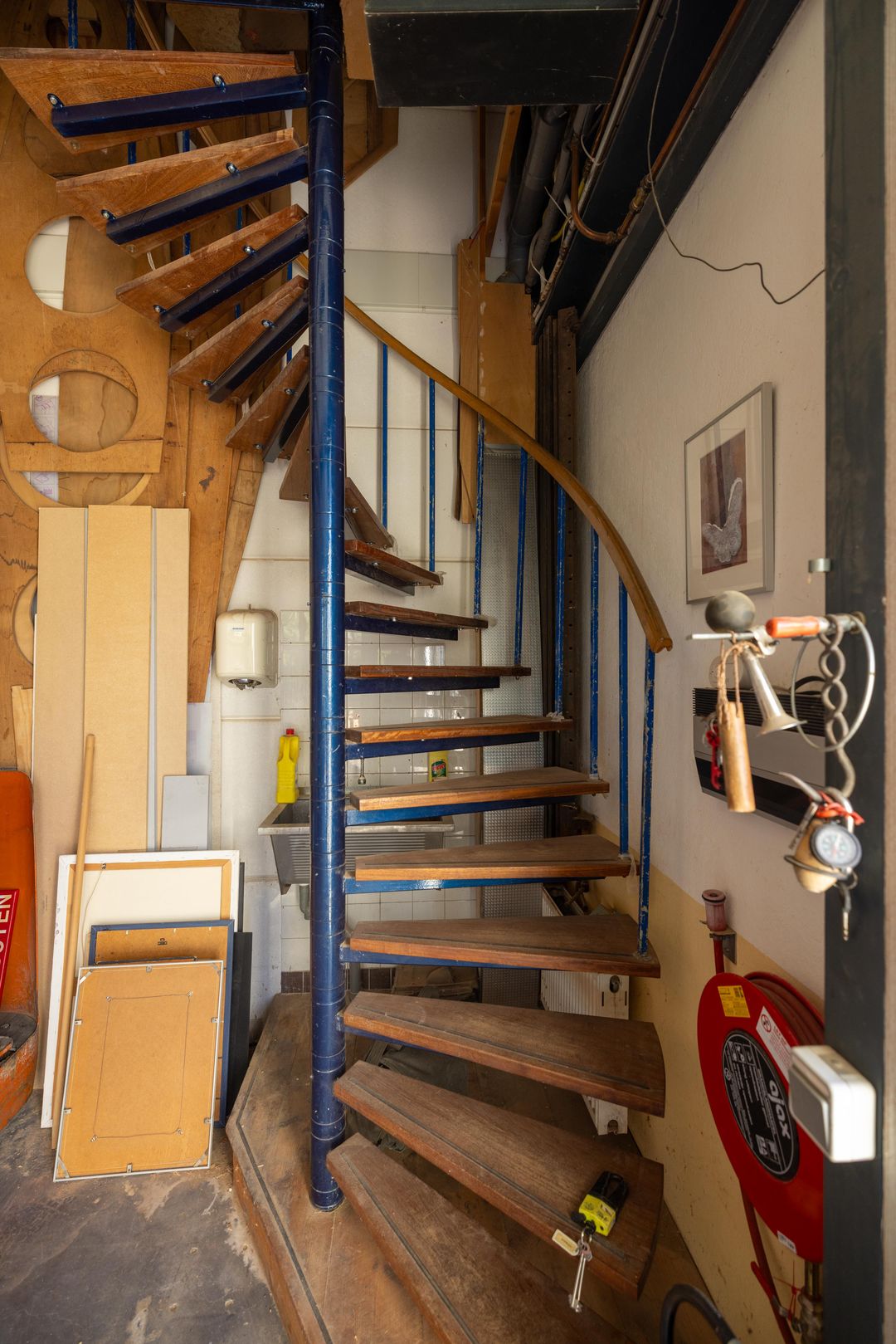 The first floor has a concrete mezzanine and is fully equipped with an office layout including a kitchen, toilet, and shower facilities. A warehouse is accessible via a hoist hatch and platform lift. The floor area is approximately 50 m² LFA. An alarm system is installed.