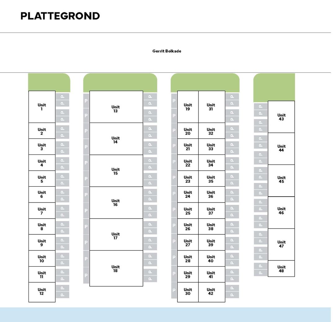 Iedere unit heeft minimaal één eigen parkeerplaats. De grotere units hebben tot wel zes eigen parkeerplekken.