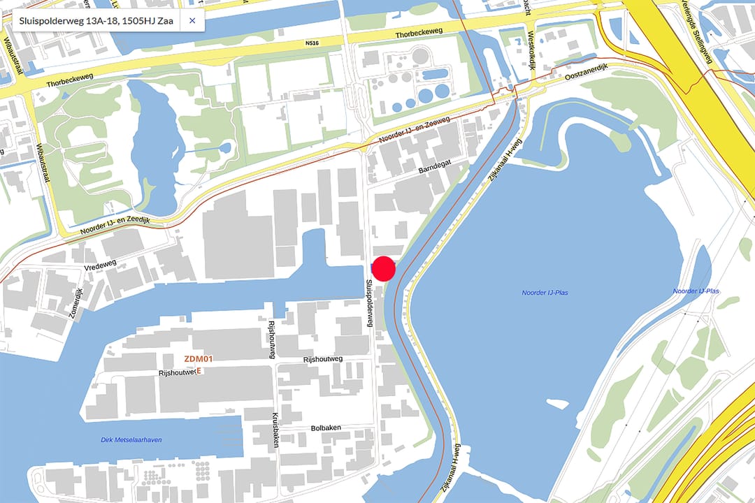 Deze bedrijfsruimte ligt op bedrijventerrein Achtersluispolder in Zaandam. Op dit bedrijventerrein aan het water, zijn vele uiteenlopende bedrijven gevestigd. Het terrein is zeer gunstig gelegen bij de A10 en A8, op 10 minuten rijden van bijvoorbeeld Amsterdam. De dichtstbijzijnde bushalte ligt op 6 minuten lopen.