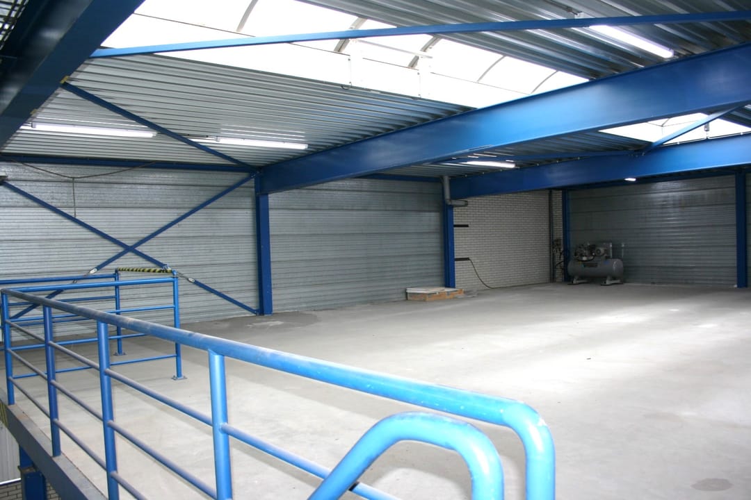 Both the ground floor and the first floor measure approximately 220 m² and are open-plan spaces suitable for storage, warehousing, or workspace. The clear height on the ground floor is approximately 2.90 m², and the floor load under the mezzanine floor is 1,500 kg/m².