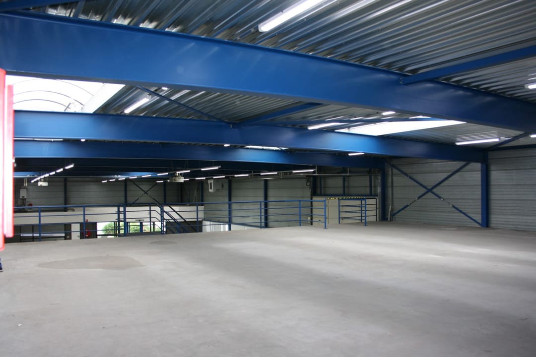 The industrial building features four large skylights and an electric overhead door measuring approximately 4.75 m² x 4.10 m² (W x H) with a separate pedestrian door. The high section of the building measures approximately 480 m², is column-free (approximately 20 m²), and has a floor load of 1,000 kg/m². A concrete mezzanine floor is located at the rear of the building.