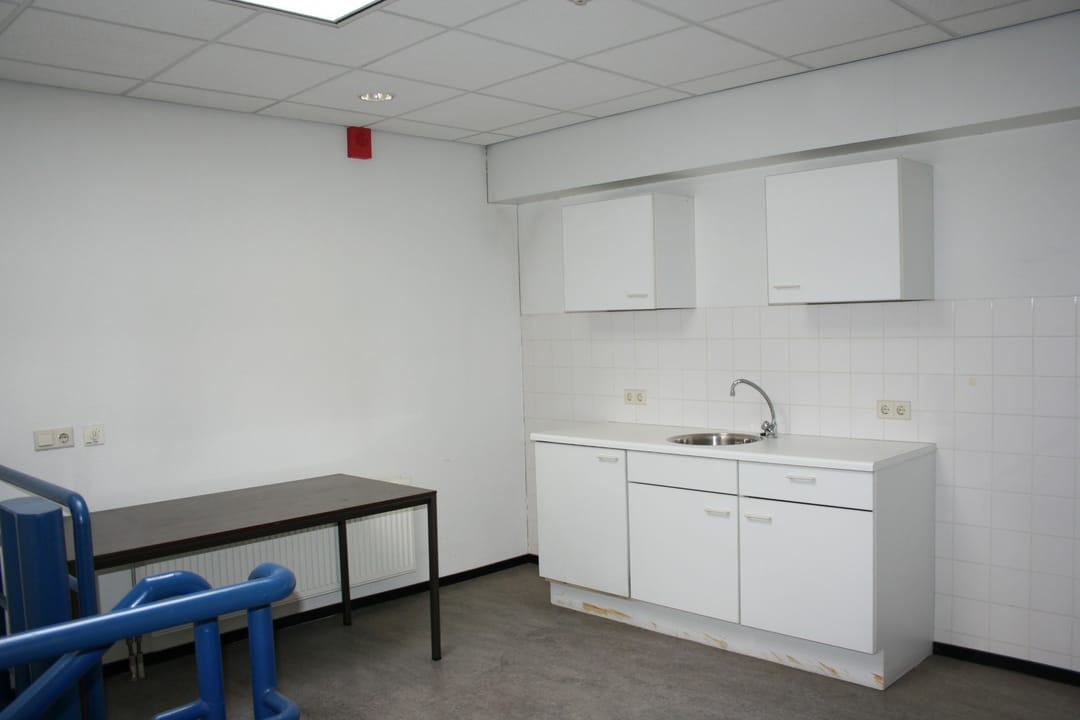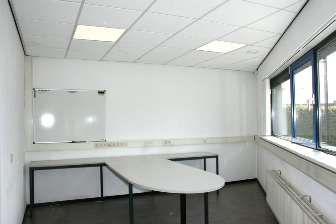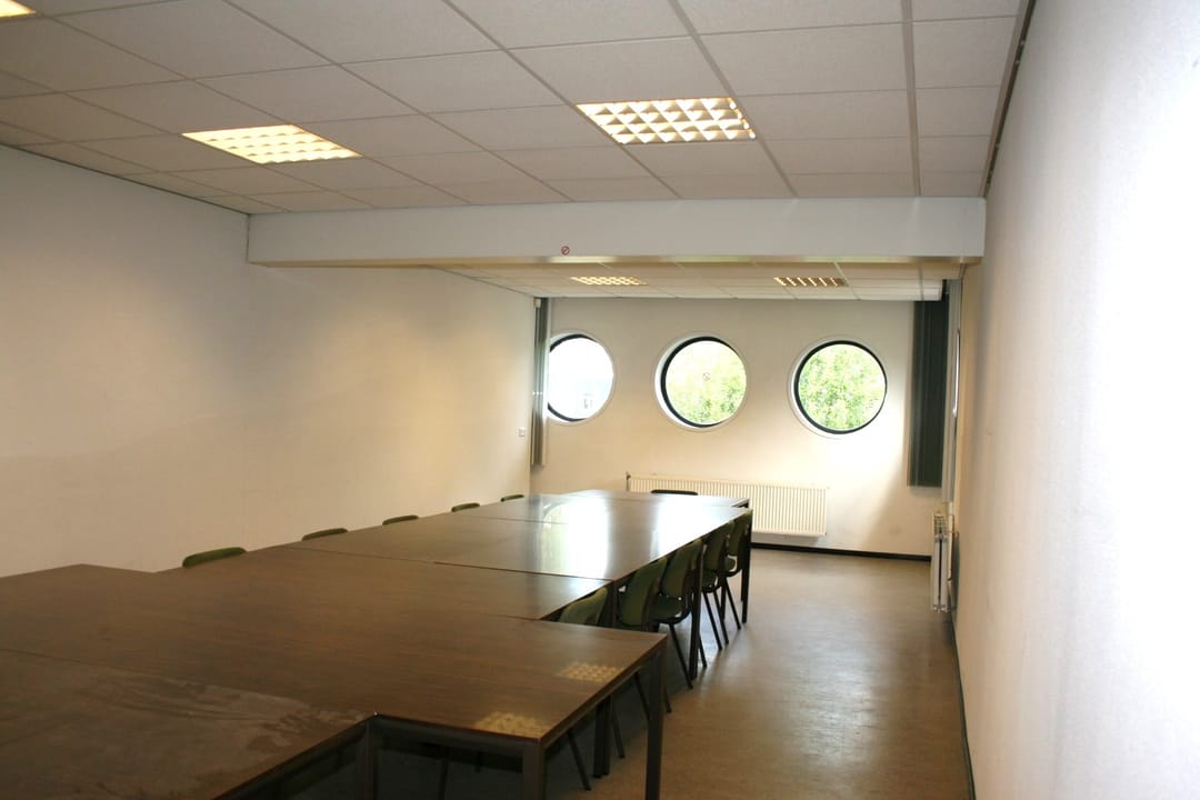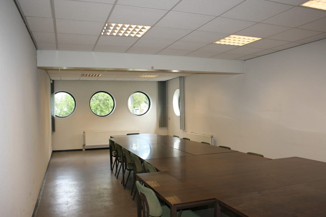 The ground floor also houses a separate workspace of approximately 70 m² with restrooms. Above this workspace on the first floor, a landing with a pantry leads to a large meeting room overlooking the Hoofdtocht canal.