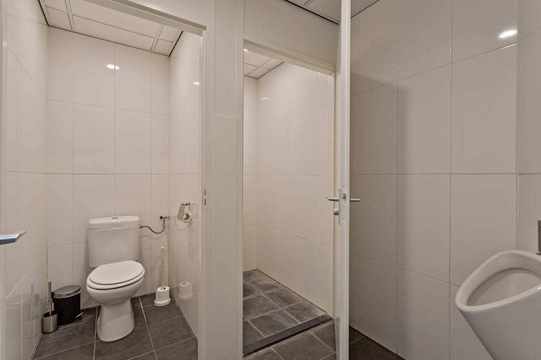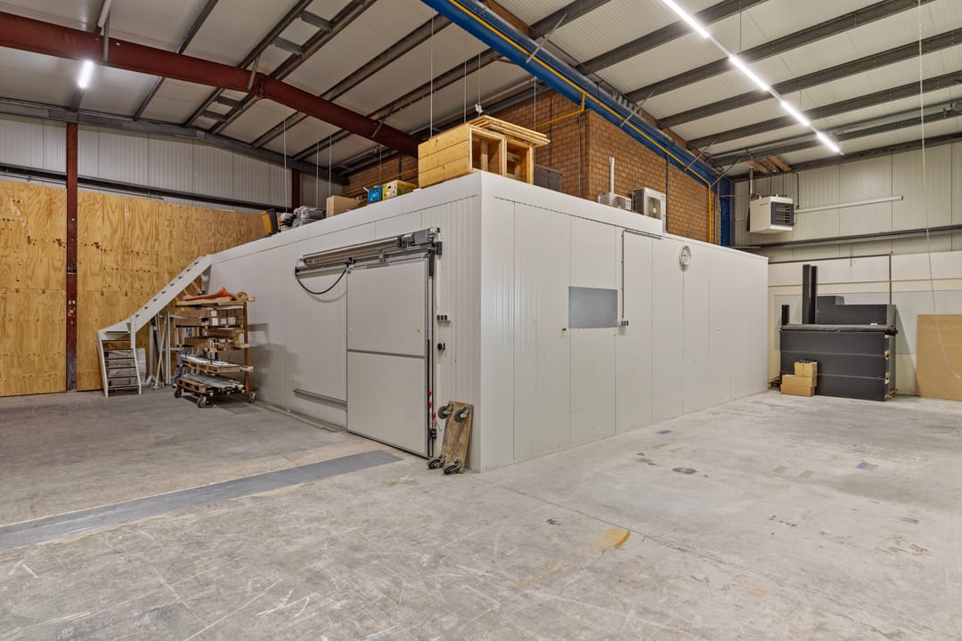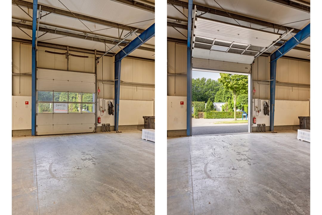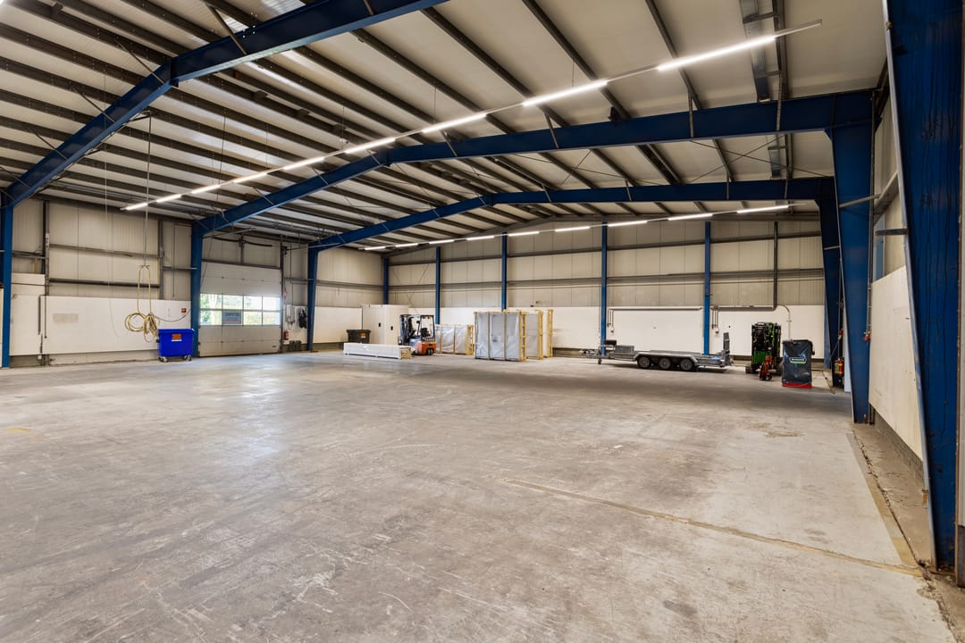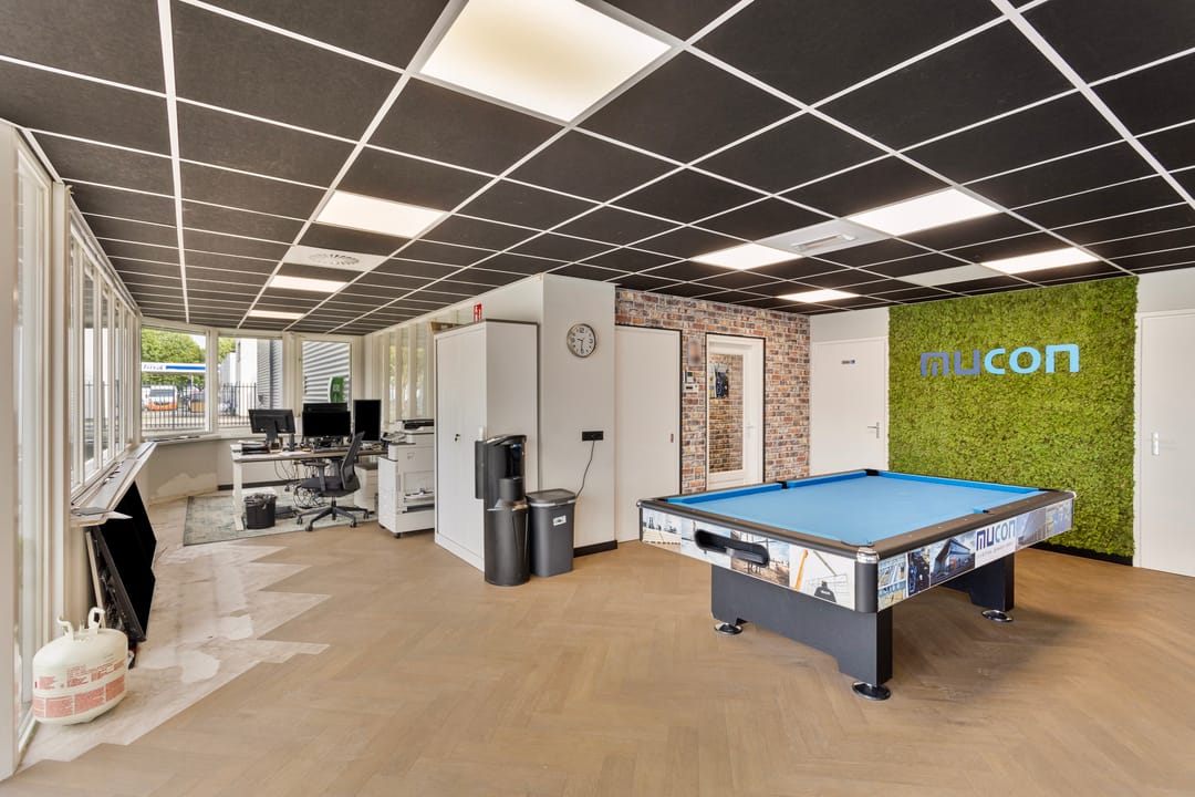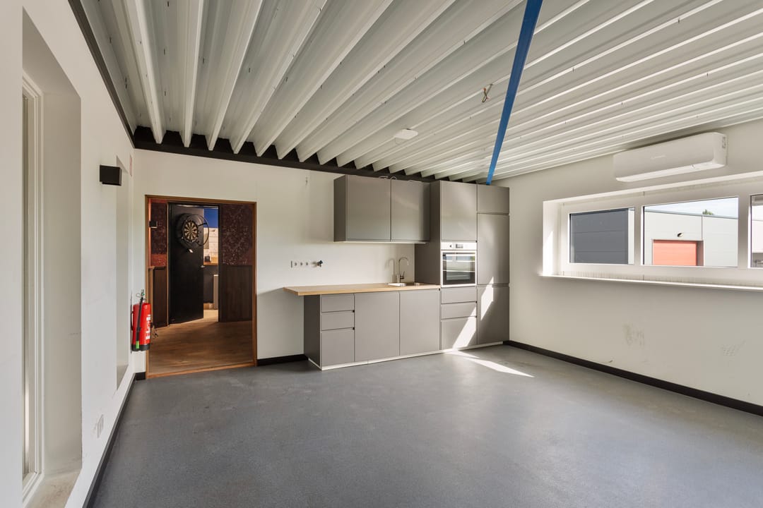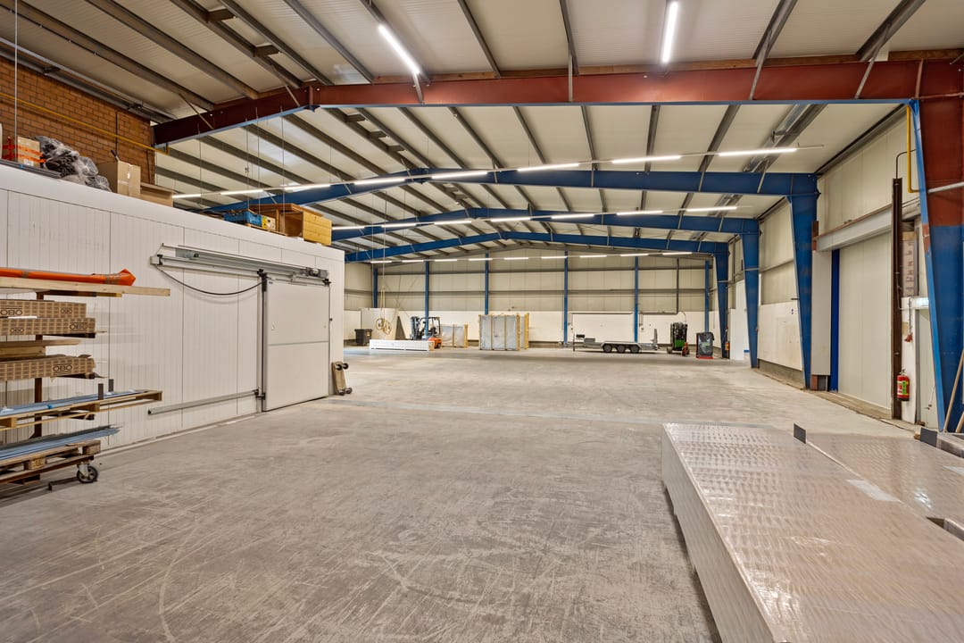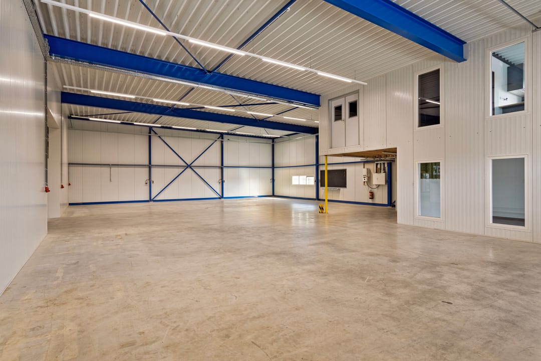Receptie. Kantoorruimte. Kantine. Pantry. Toiletgroepen. Opslagruimte. De bedrijfshal is opgedeeld in twee ruimtes en via overheaddeuren zijn deze met elkaar verbonden. De gehele bedrijfshal wordt verlicht door middel van LED-verlichting. Aparte toiletgroep. Kantoorruimte. Kantine met modern keukenblok. Bar. Opslagruimte.