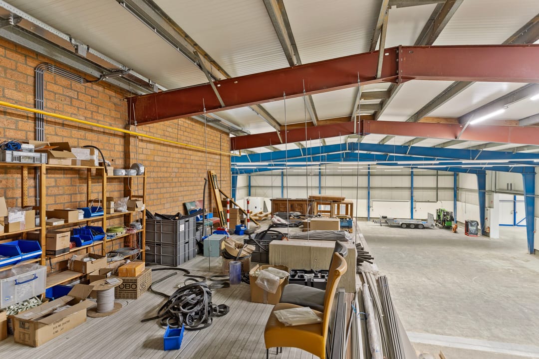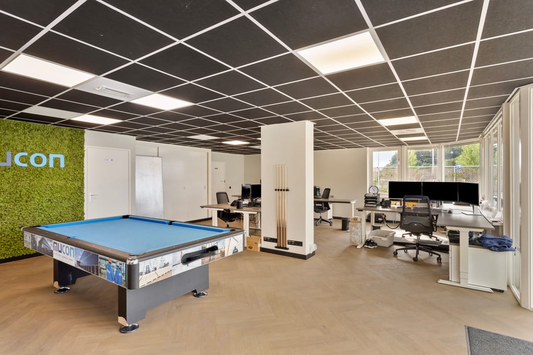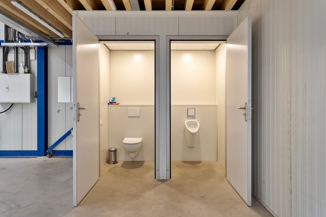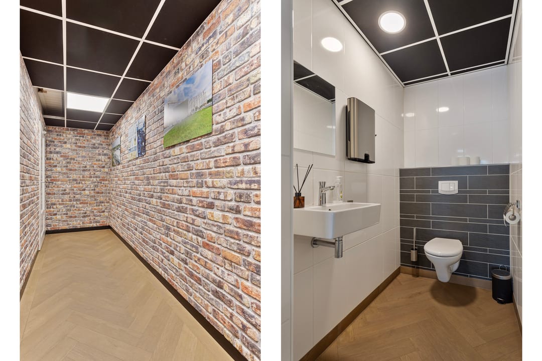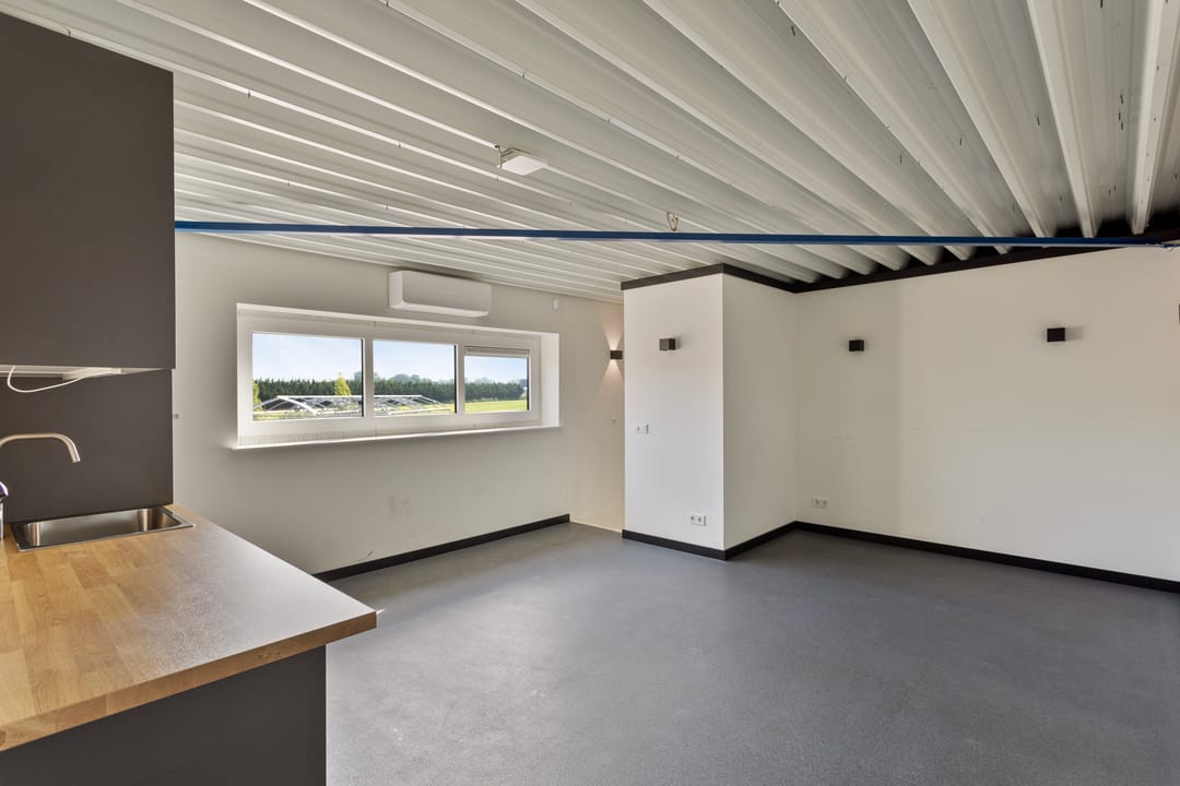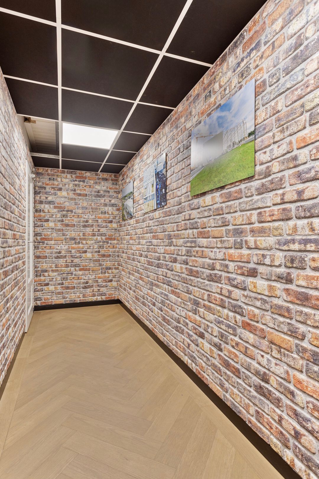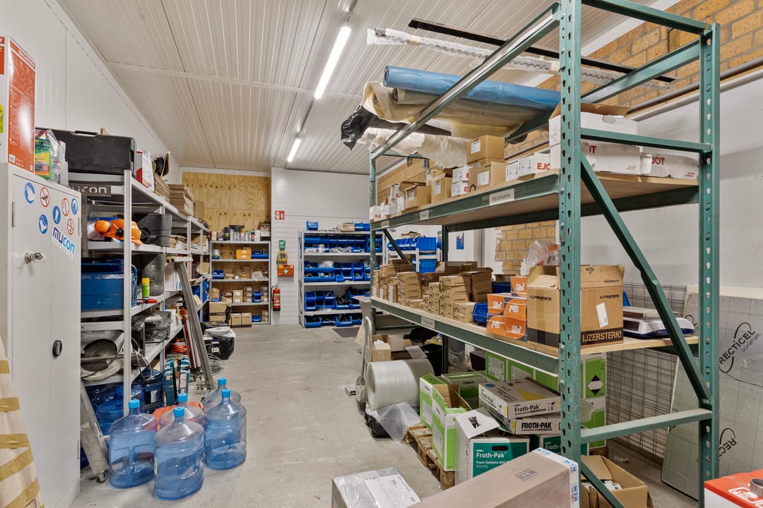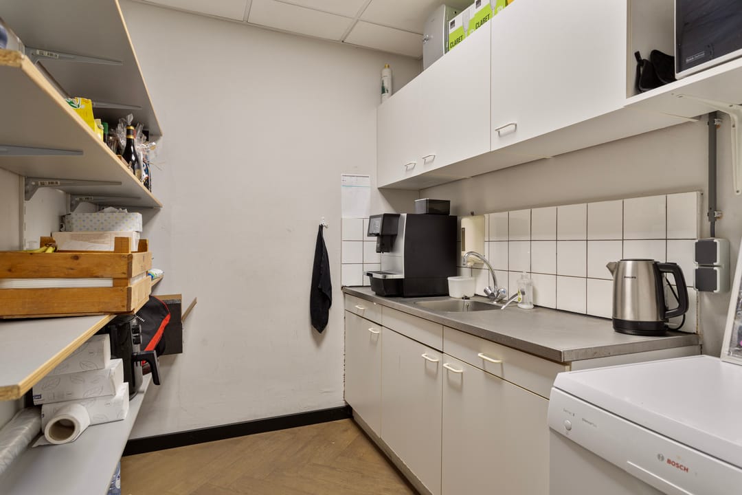 Receptie. Kantoorruimte. Kantine. Pantry. Toiletgroepen. Opslagruimte. De bedrijfshal is opgedeeld in twee ruimtes en via overheaddeuren zijn deze met elkaar verbonden. De gehele bedrijfshal wordt verlicht door middel van LED-verlichting. Aparte toiletgroep. Kantoorruimte. Kantine met modern keukenblok. Bar. Opslagruimte.