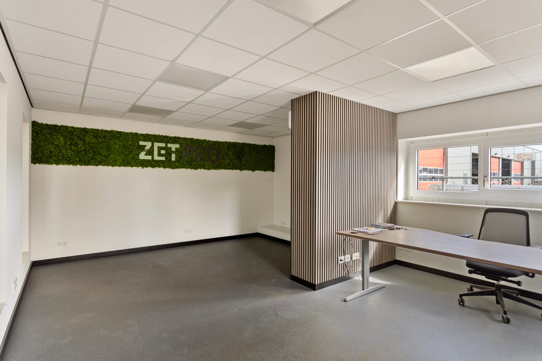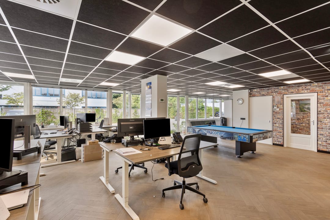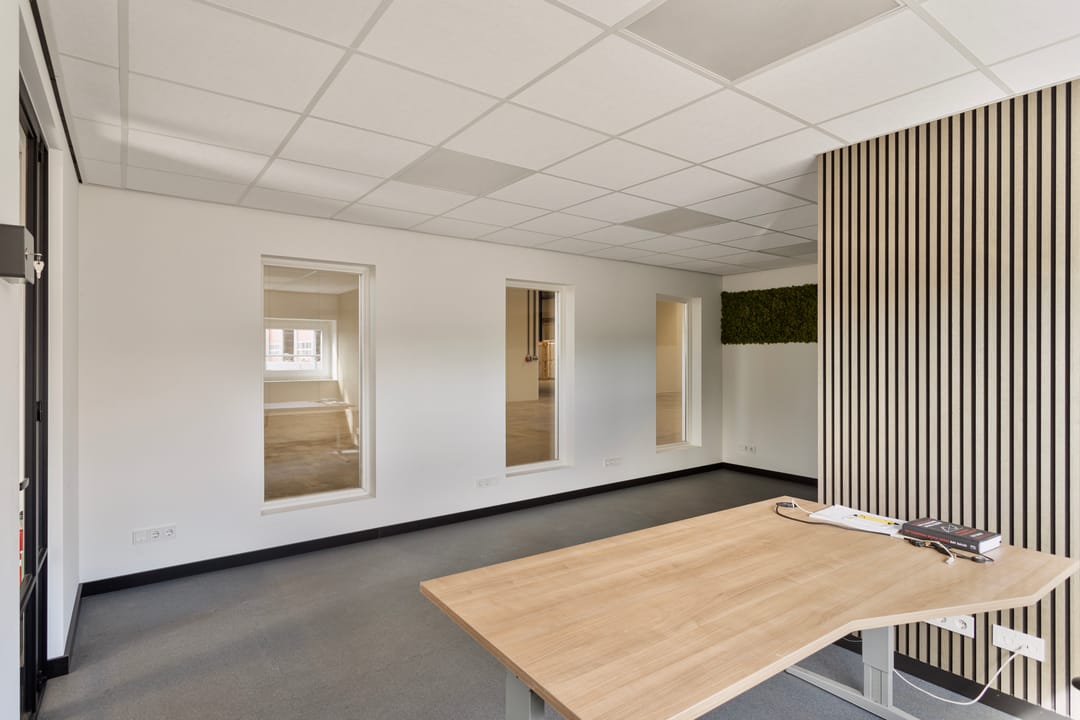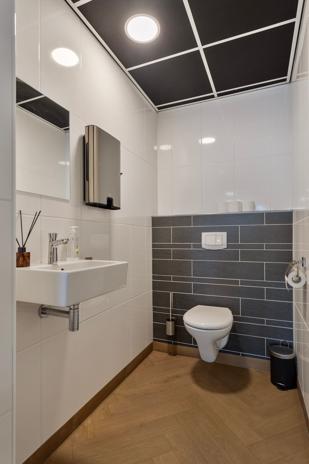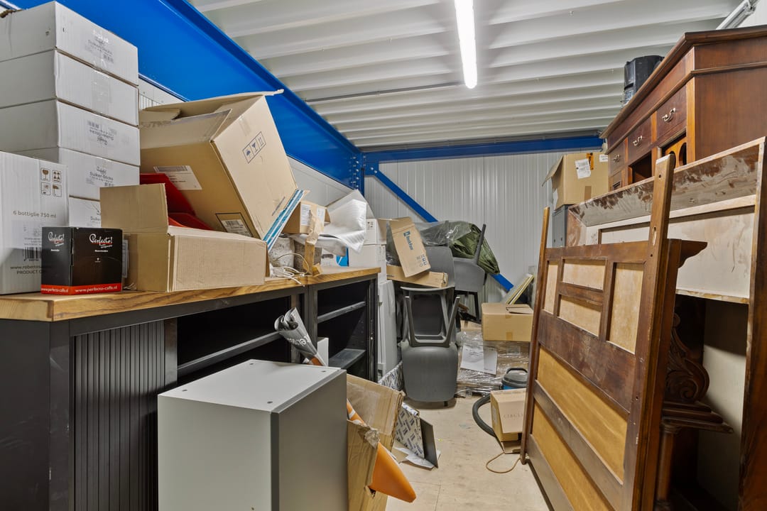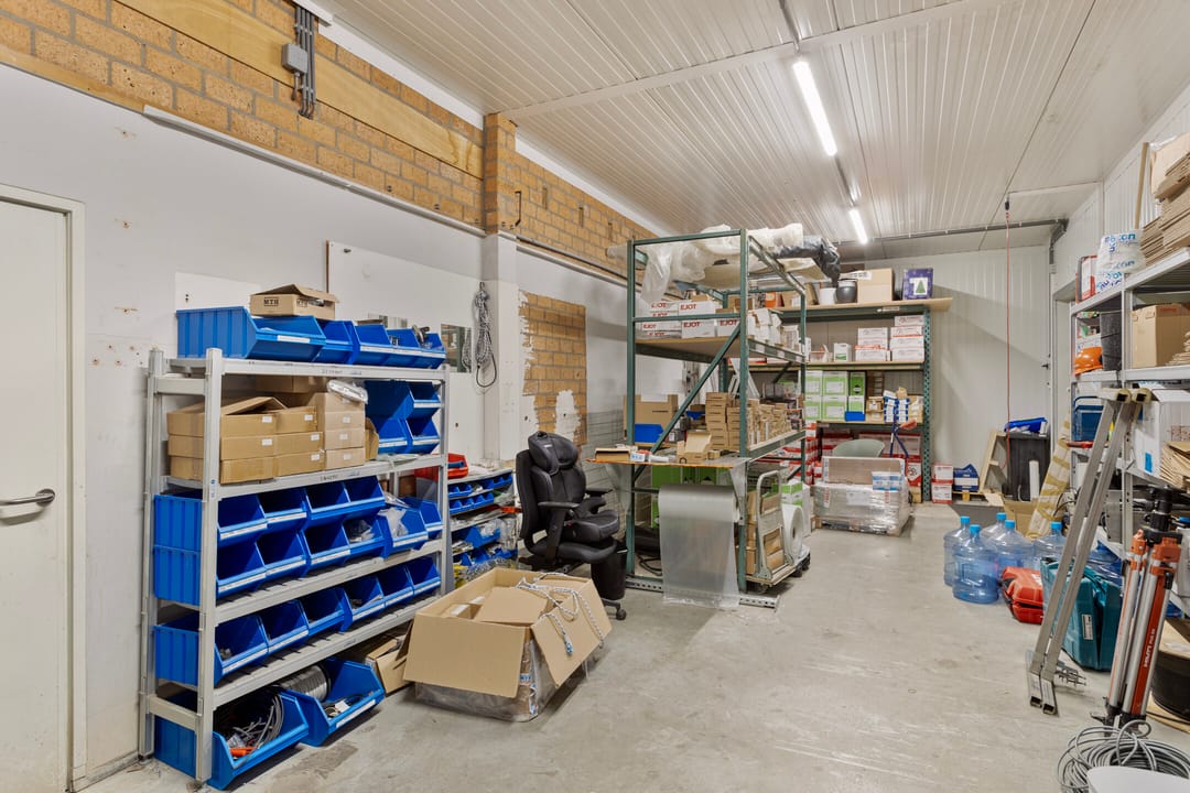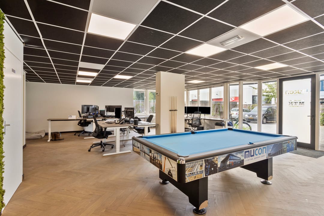 Receptie. Kantoorruimte. Kantine. Pantry. Toiletgroepen. Opslagruimte. De bedrijfshal is opgedeeld in twee ruimtes en via overheaddeuren zijn deze met elkaar verbonden. De gehele bedrijfshal wordt verlicht door middel van LED-verlichting. Aparte toiletgroep. Kantoorruimte. Kantine met modern keukenblok. Bar. Opslagruimte.