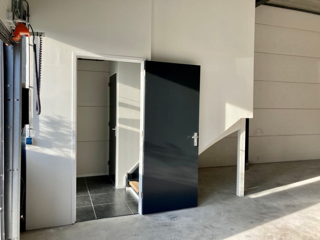 Het complex wordt afgesloten met een hekwerk met een elektronische poort en je hebt de beschikking over 2 eigen parkeerplaatsen. Aan de voorzijde is de entree met een loopdeur. De entree is netjes afgewerkt met een plavuizen vloer, een modern toilet met fontein, de trapopgang en een deur naar de hal. De ruime hal op de begane grond heeft een oppervlak van 75 m². Een ideale ruimte voor bijvoorbeeld een werkplaats, opslag of showroom. De hal is voorzien van een elektrisch bedienbare overheaddeur van 3,5 meter breed en 3,5 meter hoog. Ook is er een airco aanwezig.