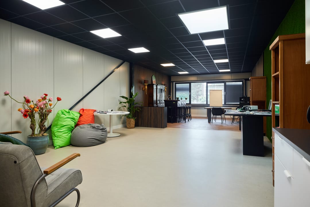Verder is er een pantry aanwezig, voorzien van een koelkast en vaatwasser. In het midden van de verdieping is een ontvangstruimte gecreëerd. In het achterste gedeelte van de hal is een open overlegruimte gecreëerd die is voorzien van een PVC-vloer en akoestische wandpanelen.
