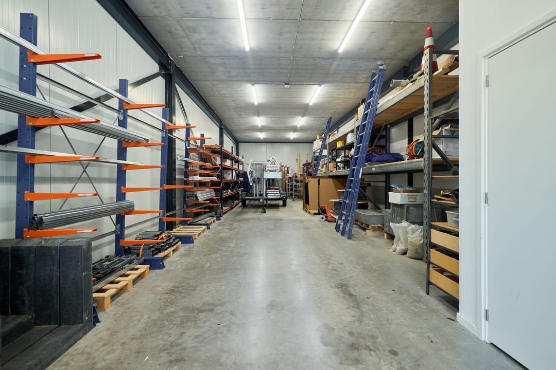 In het achterste gedeelte zijn stellingen geplaatst voor opslag. Door deze indeling is de begane grond te verdelen in twee delen.