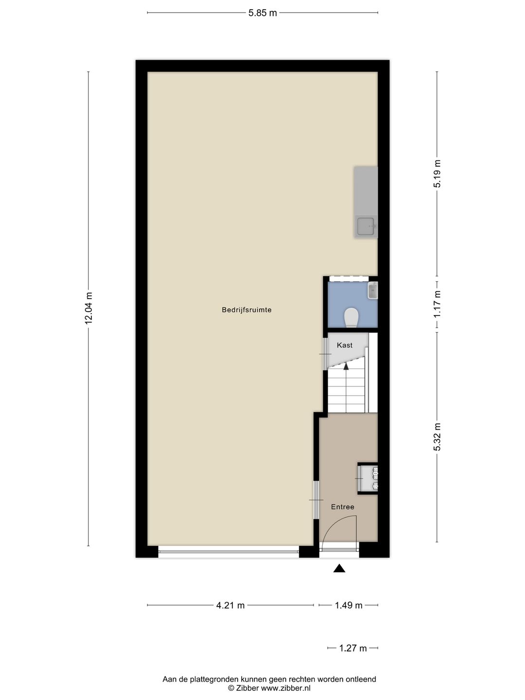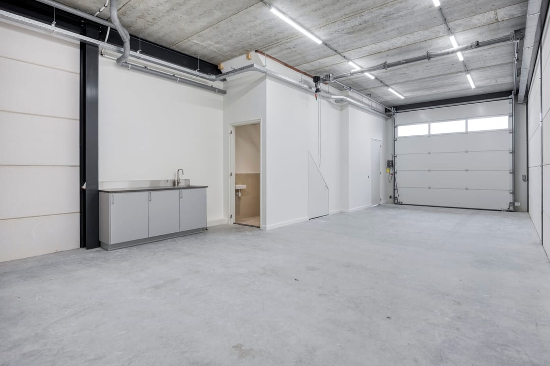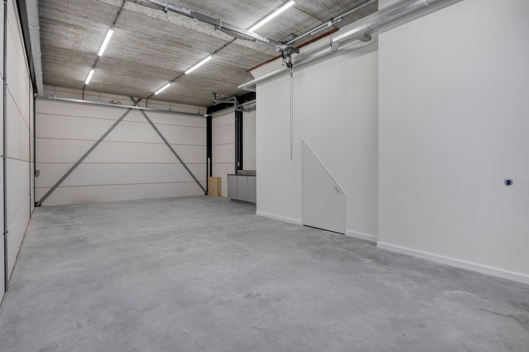 De bedrijfsruimte op de begane grond is circa 70 m² VVO groot en is voorzien van diverse LED-verlichtingsarmaturen, kabelgoten, een pantry, een betegeld toilet, een separate opbergkast en een elektrische overheaddeur. Via een vaste houten trap is de eerste verdieping bereikbaar.