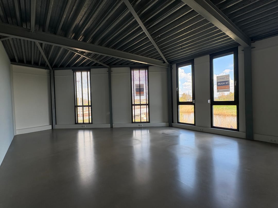 Via een separate entree, voorzien van een toilet en afgesloten bergruimte, bereikt u de afgesloten kantoorruimte op de eerste verdieping. De kantoorruimte beschikt over een 4-tal ramen en heeft een uniek, weids uitzicht over het Almelose Kanaal. Een strakke gietvloer, pantry, shutters maken het een moderne en representatieve kantoorruimte. De twee extra geplaatste ramen, geïsoleerde wand, airconditioning unit en vloerverwarming zorgen voor een zeer fijn werkklimaat.