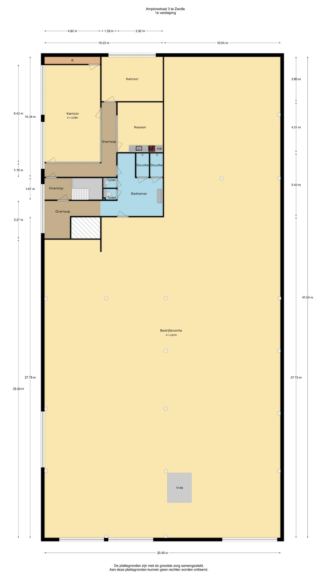 870 m² begane grond + 870 m² verdieping (beide met betonvloer) en geschikt voor opslag met een vrije hoogte van ca. 340 cm. Inclusief 140 m² modern kantoor met kantine, kleedruimte en douches en 250 m² buitenterrein achter het pand. Daarnaast is er de mogelijkheid om voor en langs het object te parkeren. Voorzien van overheaddeuren (voor, achter en boven) en goederenlift welke altijd is gebruikt om goederen op te slaan op de etage.