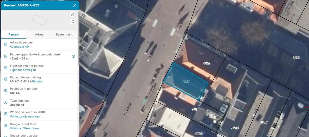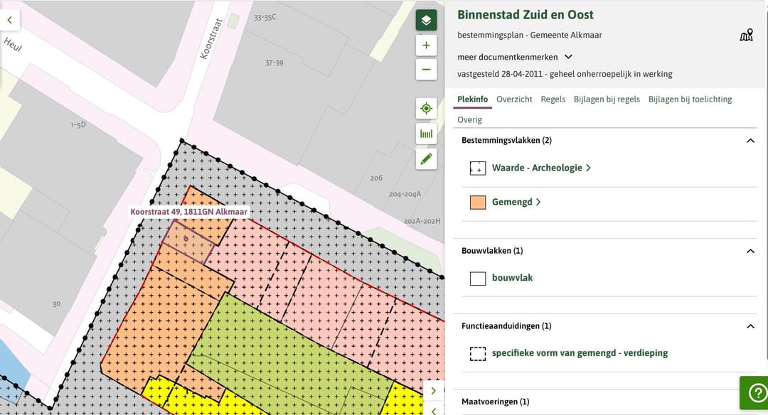 According to the Municipality of Alkmaar, the property falls within the current zoning plan “Binnenstad Zuid en Oost”, adopted by council decision on 7 March 2012.