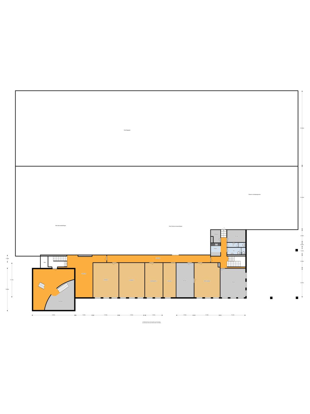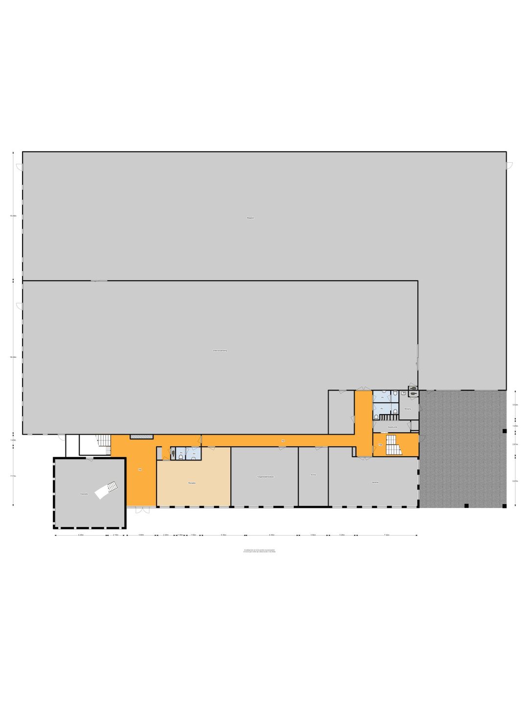 - Begane grond: circa 1.350 m² b.v.o. bedrijfsruimte.