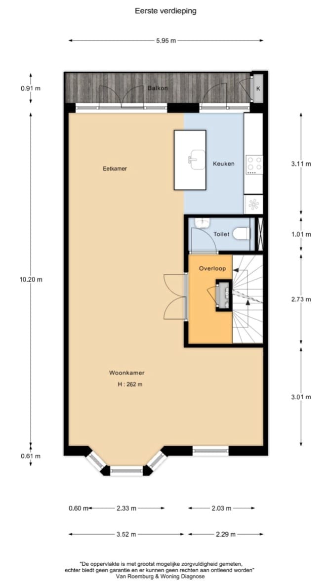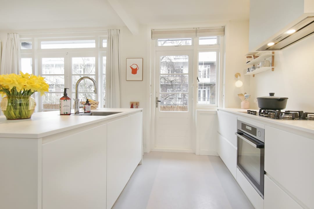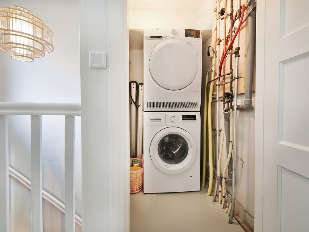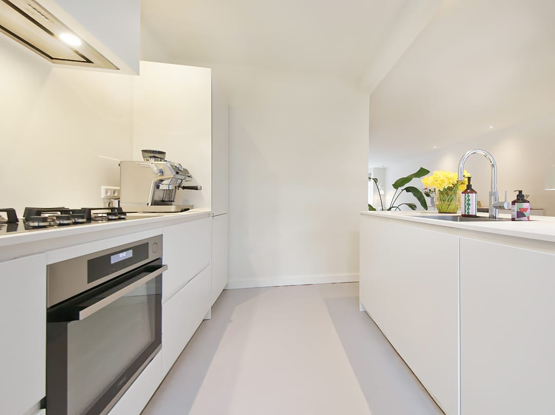 Private entrance on the ground floor. On the first floor is the spacious and very bright living room with a modern open kitchen and sink island. The kitchen is equipped with built-in appliances and a Quooker. The balcony can be accessed from the kitchen and dining room. The toilet with washbasin is accessible from the landing. The fixed staircase leads to the second floor.