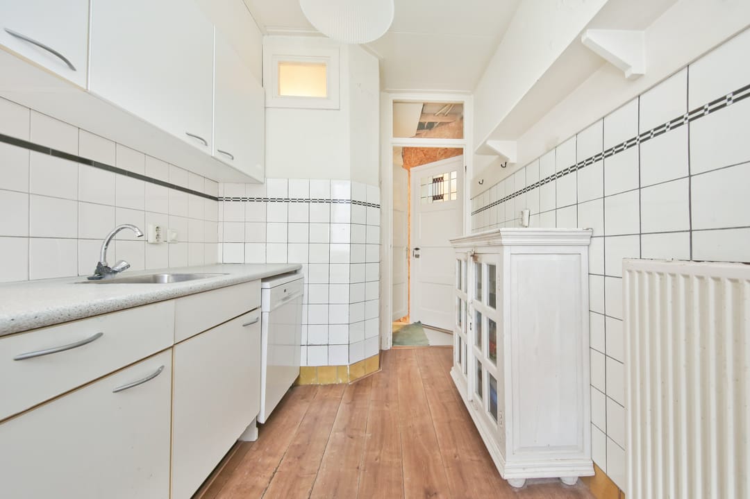 On the second floor, there are three (bed)rooms, a kitchen, and a bathroom with a shower and toilet in basic condition. The kitchen and bathroom can be combined, creating the possibility of realizing a modern, spacious bathroom. There is a balcony at the rear of this floor.
