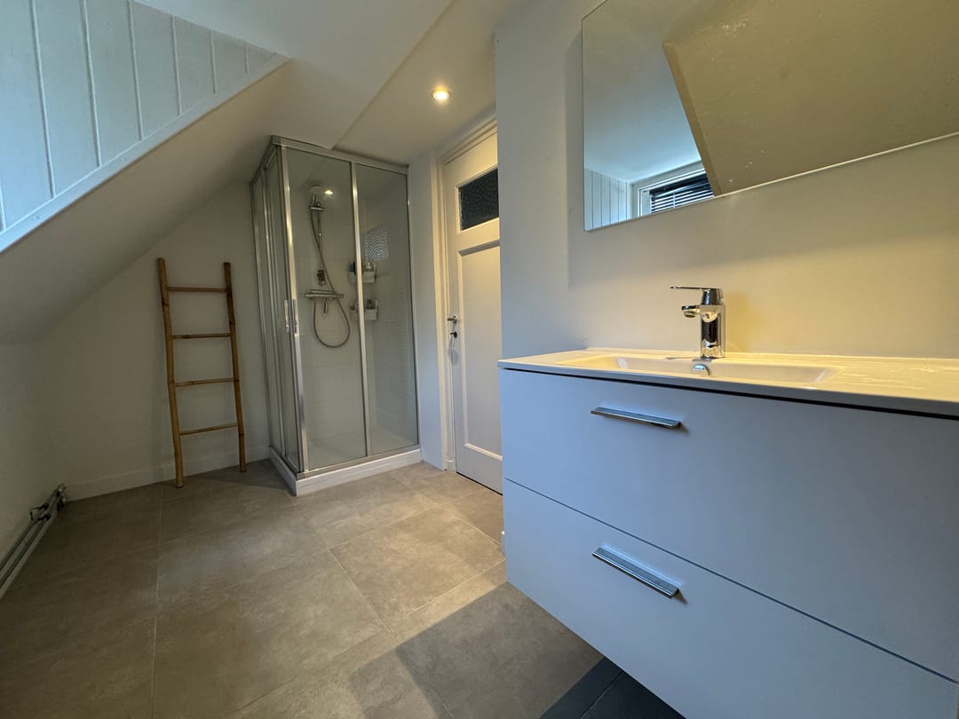 - 2e verdieping : badkamer, slaapkamer en zolderruimte.