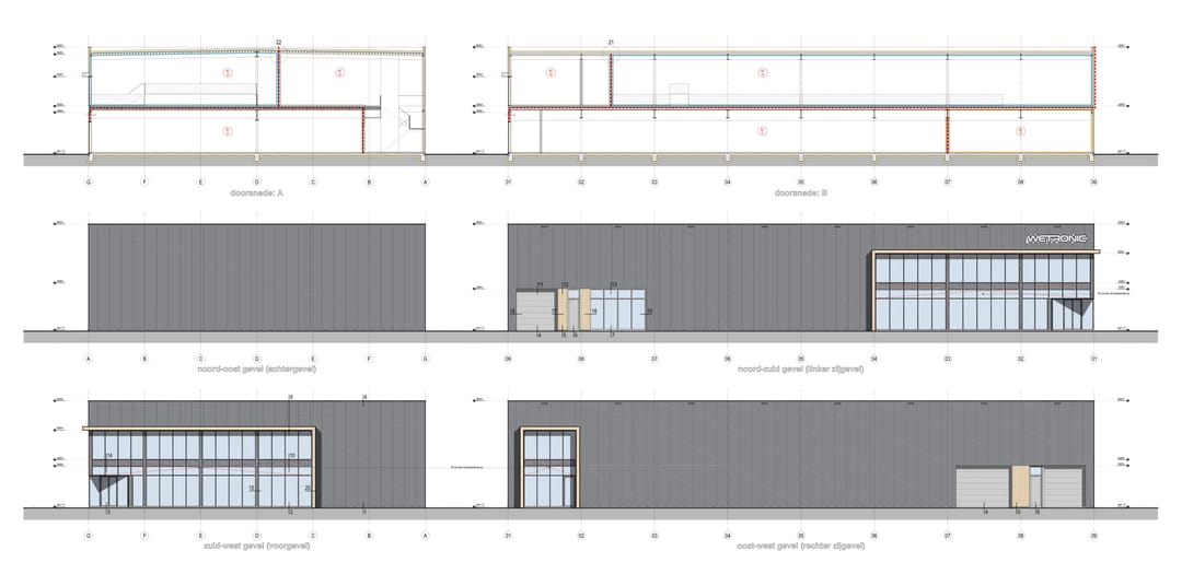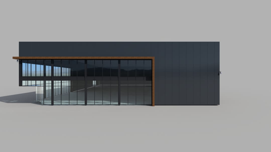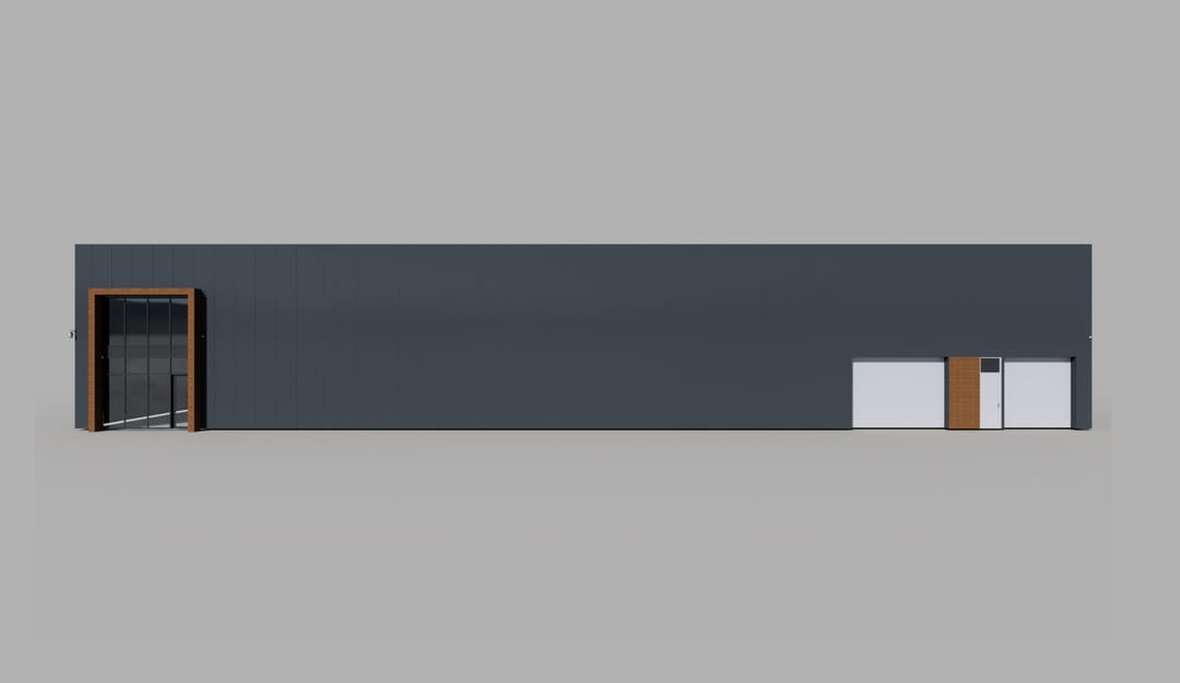 - 3 overheaddeuren en een gevelsparing waar een vaste pui in zit, welke de sparingsmaat van een overheaddeur heeft